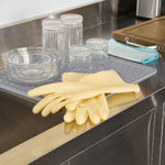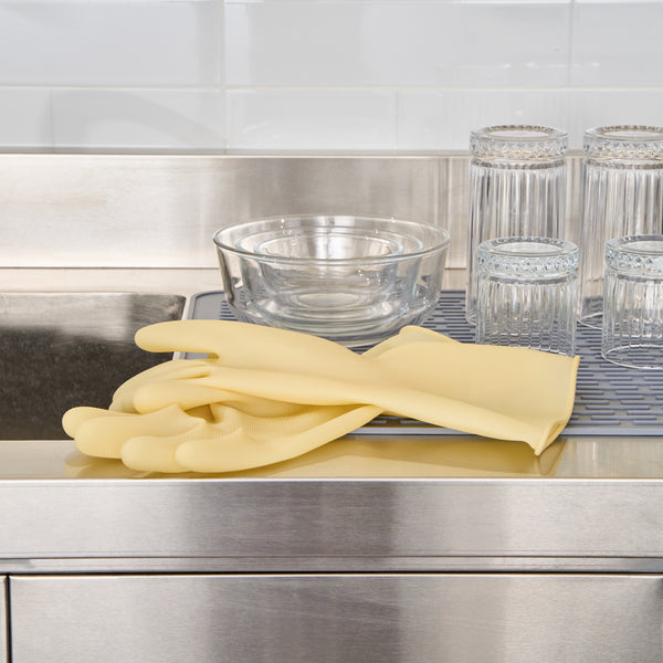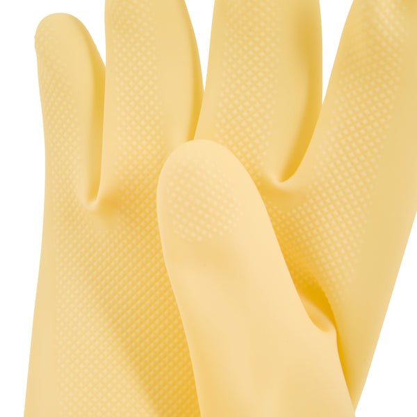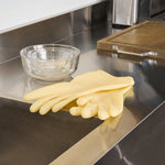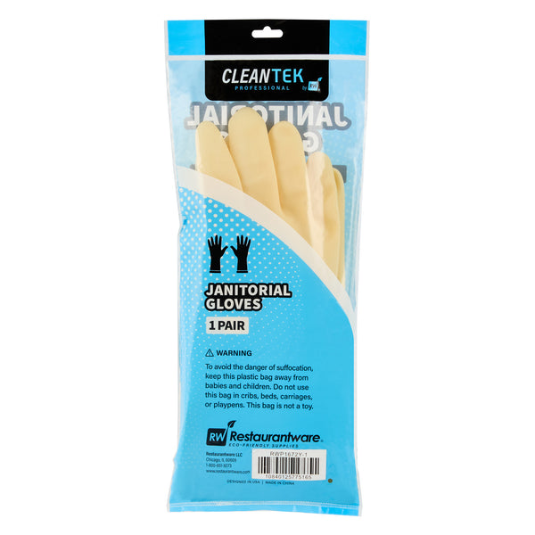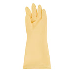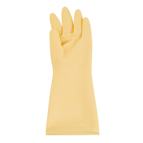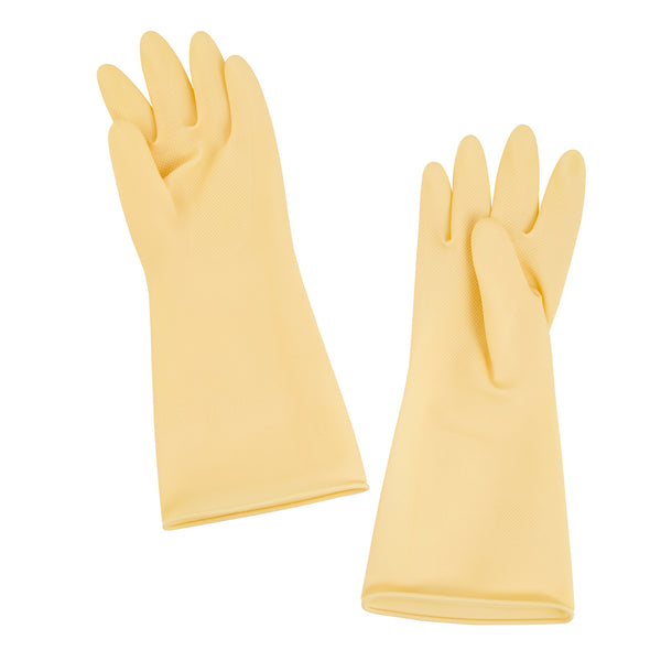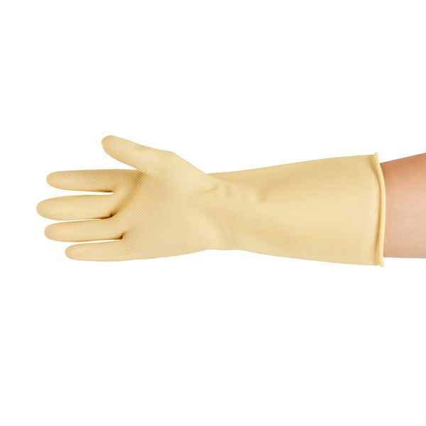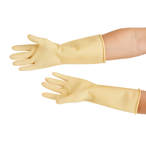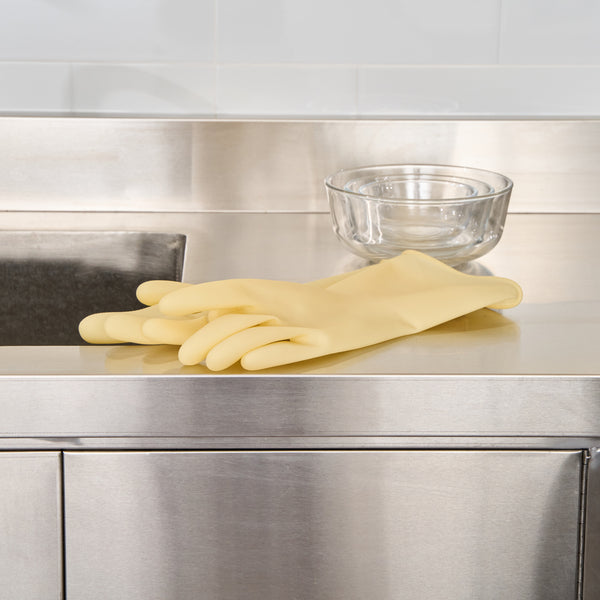 Enhance safety and efficiency in your foodservice operations. Clean Tek Professional Chemical-Resistant Latex Gloves provide unmatched protection with their durable 22-mil thickness, ensuring your hands remain safeguarded during rigorous cleaning tasks. These latex gloves feature a textured surface that ensures a non-slip grip, offering precision and control even when dealing with slippery items. The long cuff design extends 13 inches to shield wrists and forearms from liquids and debris, making them ideal for dishwashing gloves scenarios. Constructed from chemical-resistant latex, these rubber gloves protect against a variety of cleaning agents, essential for maintaining high sanitation standards in foodservice environments. Their extra-large size guarantees a comfortable fit, reducing hand fatigue for individuals with larger hands during prolonged use. Each order includes 1 Pair of Clean Tek Professional Chemical-Resistant Latex Gloves.