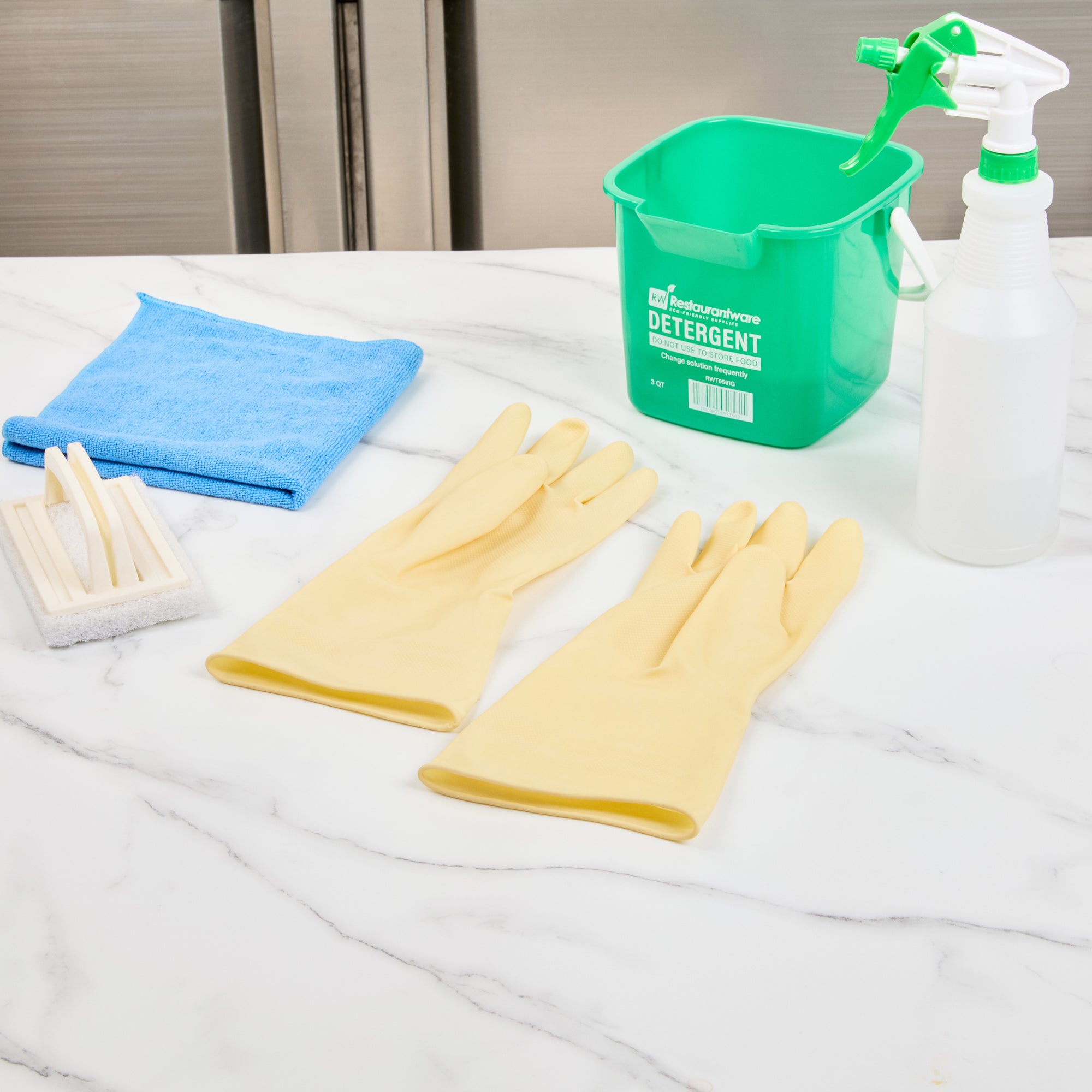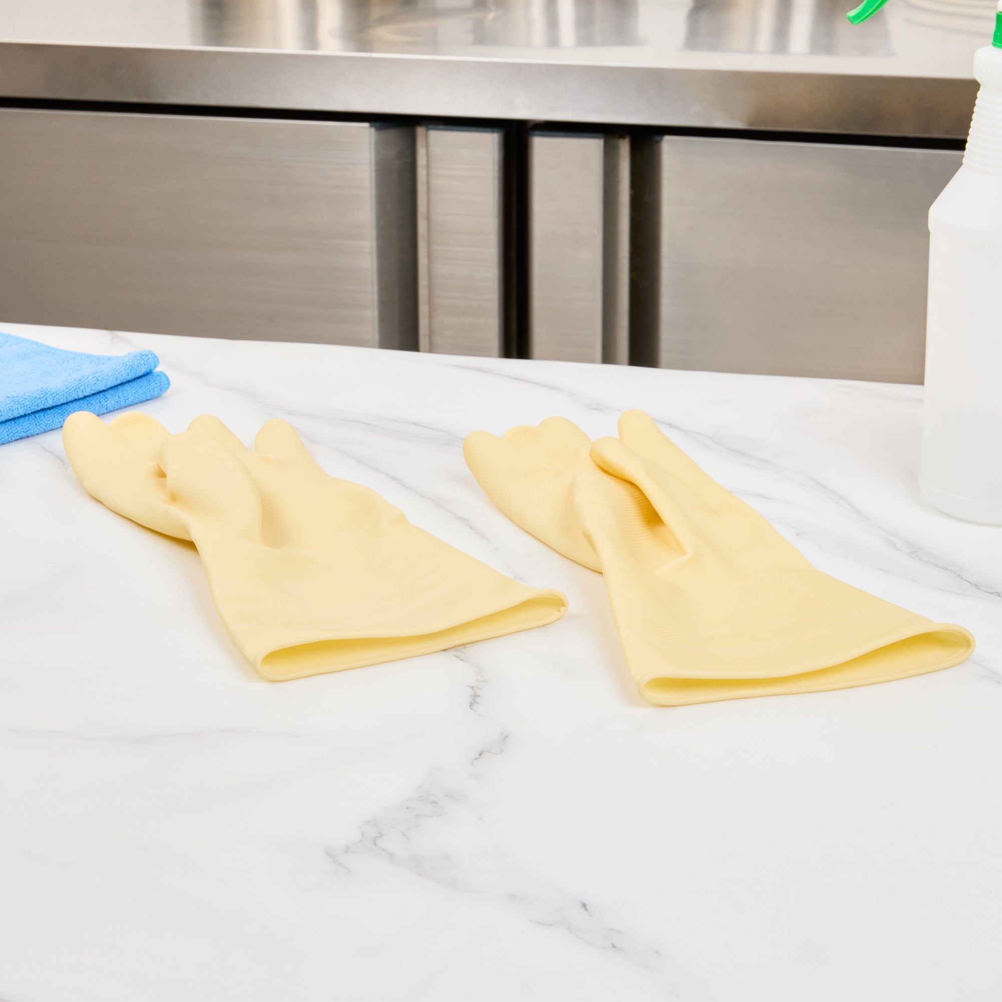 Enhance safety and efficiency during cleaning tasks. Clean Tek Professional Yellow Rubber Latex Cleaning Gloves provide outstanding grip performance, improving your handling of wet foods with ease. These latex cleaning gloves are puncture-resistant, ensuring safety when working with sharp objects and maintaining a secure barrier between you and potential hazards. With an extended length of 12.99 inches, the longer cuff offers added protection for your forearms during deep cleaning sessions, making them ideal disposable latex gloves for any rigorous kitchen or janitorial task. Crafted from high-quality rubber, these gloves offer convenience. Available in a vibrant yellow color, these rubber gloves are easy to don and remove, saving you valuable time during busy shifts. Embrace the reliability of these gloves to improve your workflow and maintain a safe environment in your establishment. Each order includes 10 Clean Tek Professional Yellow Rubber Latex Cleaning Gloves.