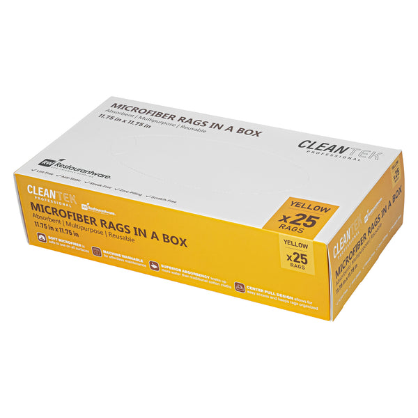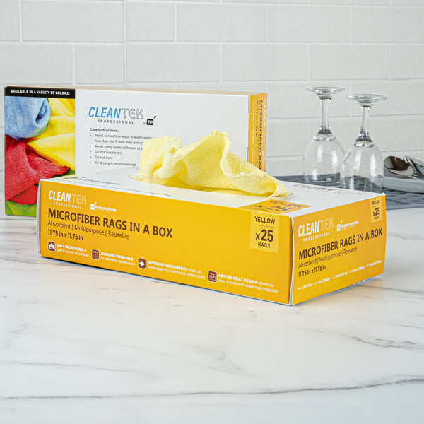 Enhance your cleaning routine with our Clean Tek Professional Yellow Microfiber Rags In A Box. Packaged in a handy dispenser box, these microfiber cloths allow for quick and easy access, streamlining your cleaning tasks. Crafted from a blend of polyester and polyamide, these cleaning cloths are durable and ensure a streak-free finish on windows and other glass surfaces. To tackle spills and dry surfaces effortlessly, these car drying towels are highly absorbent. Ideal for dusting, wiping surfaces, polishing, and absorbing spills, these multipurpose cleaning rags are versatile and efficient. Designed with seamless wavy edges, these microfiber cleaning cloths offer scratch-free cleaning, ideal for delicate surfaces. With a yellow finish, these microfiber rags are easily identifiable, reducing mix-ups and ensuring efficient task management. Measuring 11.81 inches in length by 11.81 inches in width, these drying cloths provide ample cleaning surface. Each order includes 250 rags.