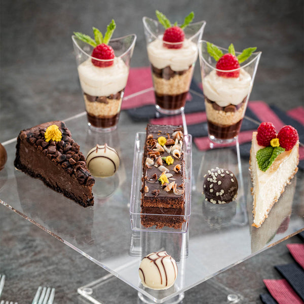 Redefine buffet tables at catered events using our Clear Tek Clear Acrylic Buffet Display Stand. Crafted with high-quality acrylic, this food display stand is durable to securely showcase appetizers and desserts. Featuring a sleek and versatile square shape, this acrylic buffet display stand is suitable for any catered event. This dessert display stand has a transparent, high-shine finish that showcases your delectable treats with exceptional clarity and adds a touch of sophistication to your dessert presentations. To accommodate a variety of catered spreads, this food display stand is designed with an ample surface to hold a large amount of appetizer and dessert spreads for guests. This acrylic display stand is built with a pedestal base that provides superior stability on tables and countertops, minimizing the risk of spills. To maintain its pristine appearance, this cupcake display stand can be cleaned by hand. This buffet display stand is lightweight for easy transport and set-up at catered events. Measuring 10 inches in length by 10 inches in width by 4.75 inches in height, this display stand for food presentation provides ample space for catered spreads. Shipped in a 1 count box.