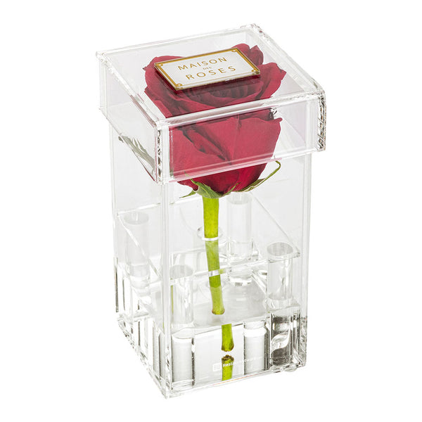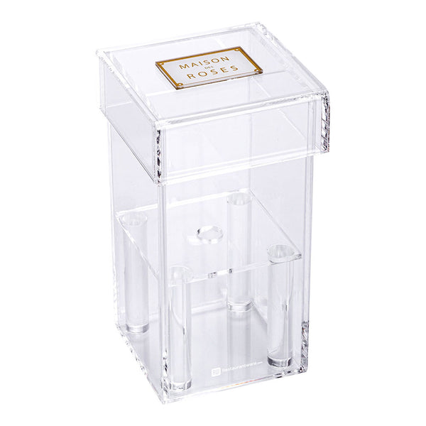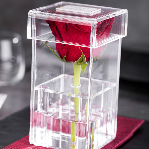 Elegantly present a single flower with our Clear Tek Acrylic Tall Flower Box Vase. Constructed from premium acrylic, this flower vase is inherently durable and beautifully showcases a gorgeous fresh flower. With a chic black and gold placard that reads "Maison des Roses," this box for flowers brings an element of French elegance to your gifting. This acrylic flower box features an interior panel that securely holds the flower upright and easily pour water into the lower compartment to keep your roses or carnations fresh. The elegant, clear finish of this acrylic box instantly upgrades the look of your flower presentation and is great as a stunning centerpiece, modern decor, or a one-of-a-kind gift. Featuring a removable lid, this clear acrylic box safely covers a long-stemmed rose and prevents possible water leaks. This clear vase measures 3.25 inches long by 3.25 inches wide by 6 inches tall. Shipped in a 1 count box.