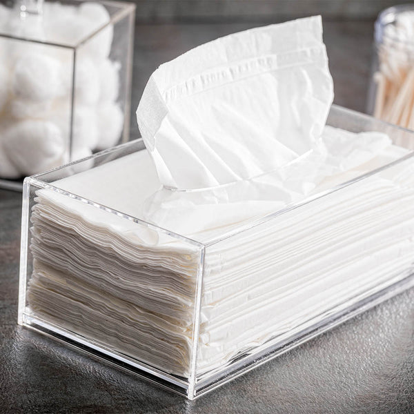 Adorn your restrooms with our Clear Tek Clear Acrylic Tissue Box. This clear tissue box is constructed from durable acrylic, ensuring that it can withstand everyday use without breaking or shattering. Featuring a minimalist look, this tissue dispenser adds a touch of simplicity and elegance to your space. This napkin dispenser can be easily refilled by sliding out its bottom. The clear finish of this napkin holder offers a sleek and unobtrusive addition to your table decor, allowing your napkins to shine through elegantly. This acrylic tissue box is lightweight and sturdy for easy handling. Measuring 8.75 inches in length by 4.75 inches in width by 3.25 inches in height, this tissue holder offers a well-proportioned and space-efficient solution for your tissue storage needs. Sold in a 1 count box.