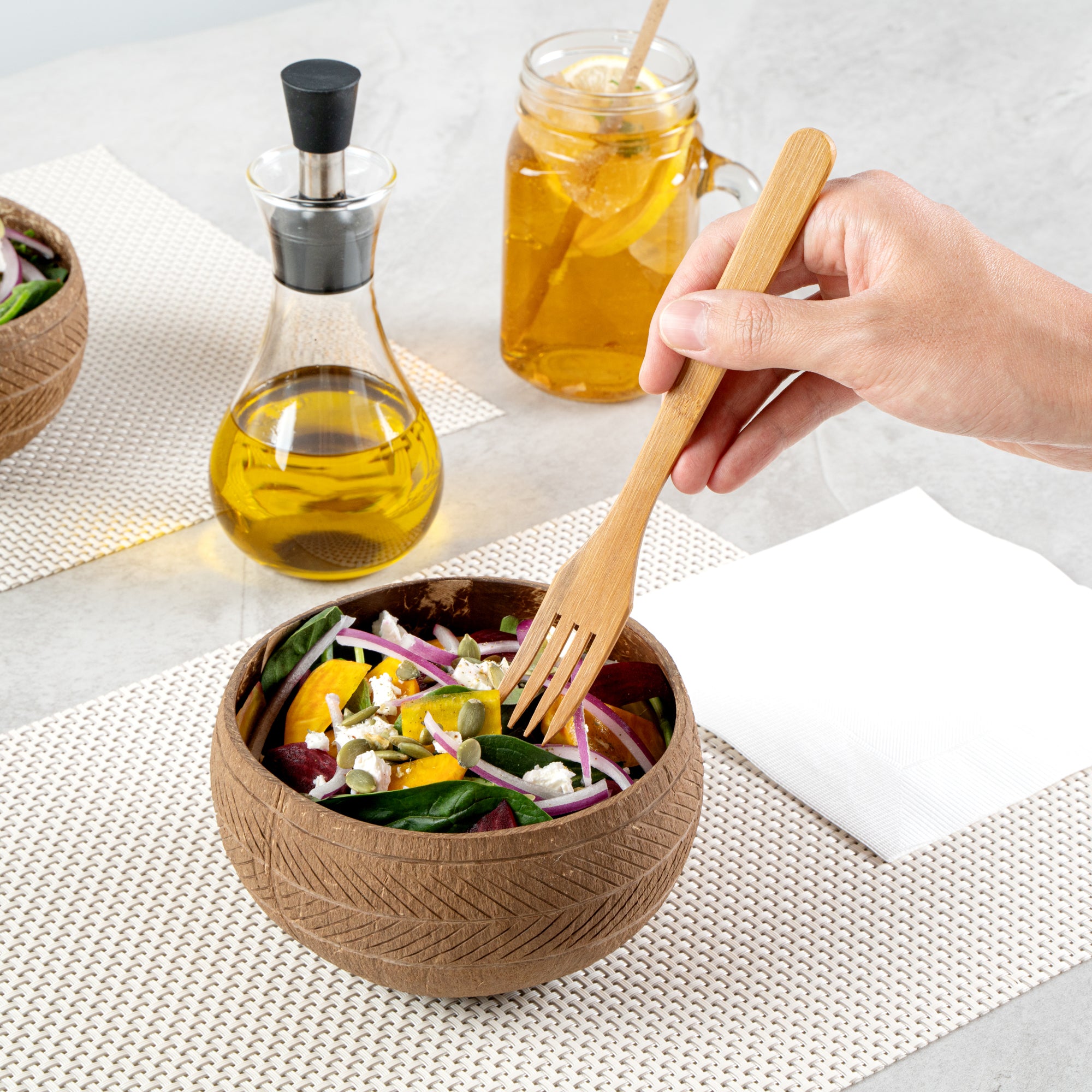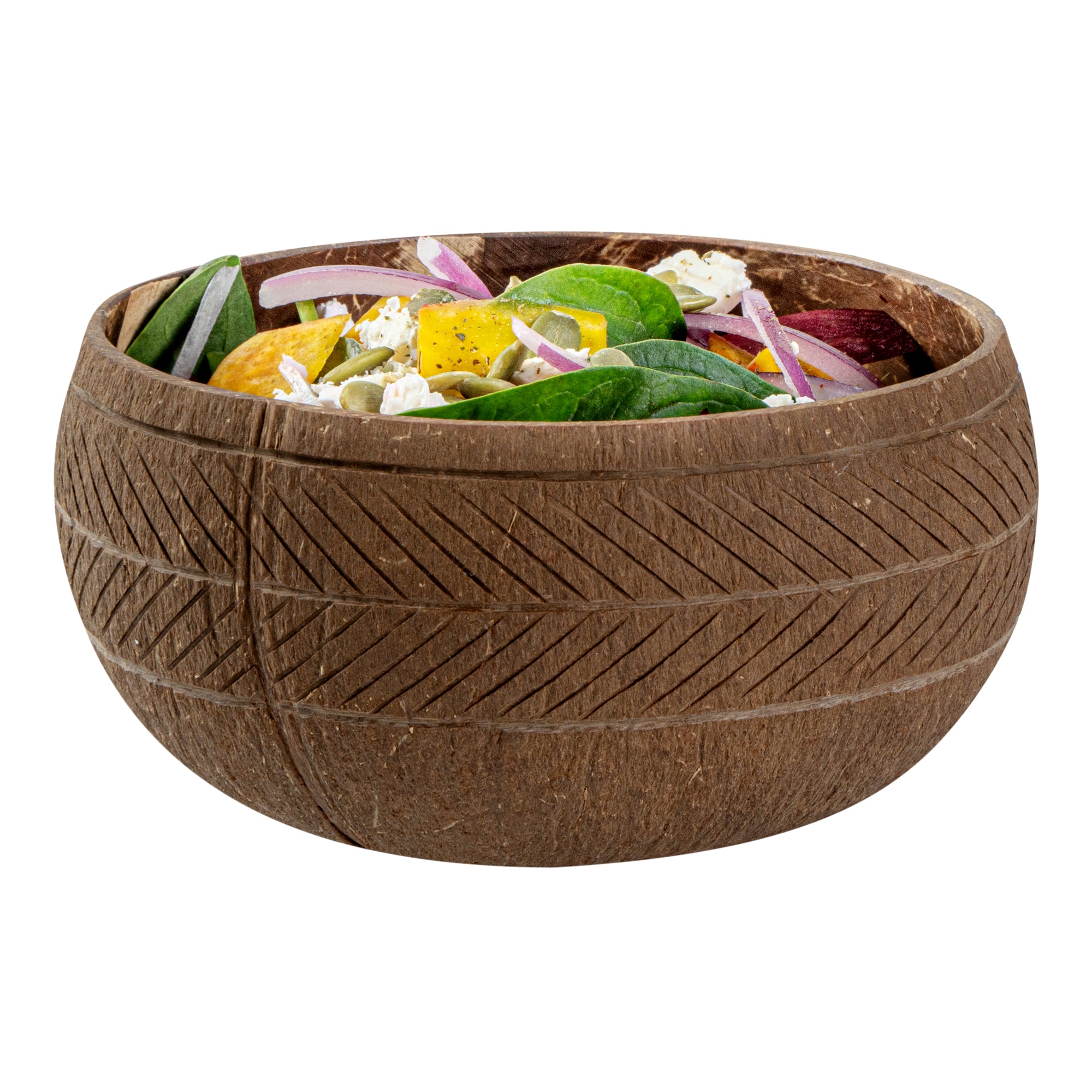 Enhance your dining experience with sustainable elegance. The Coco Casa 21 oz Handmade Feather Coconut Bowl is crafted from natural coconut, offering a unique and eco-friendly choice for your culinary creations. Handmade to perfection, each coconut bowl adds a touch of authenticity to your culinary presentations, making it ideal for foodservice professionals focused on delivering memorable dining experiences. The carved feather design enhances the bowl's aesthetic, providing your dishes with a one-of-a-kind look that will captivate patrons. With dimensions of 5.91 inches in length and width and a height of 3.15 inches, this reusable coconut bowl is perfect for serving a variety of dishes. Its sturdy design allows you to serve both hot and cold foods, ensuring that your offerings remain versatile and practical. Choose this natural material bowl for an environmentally conscious dining solution. Sold in a 10 count box.