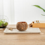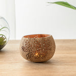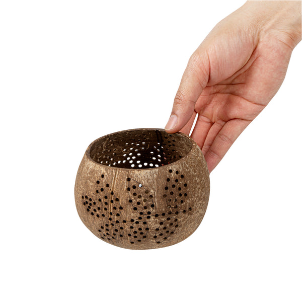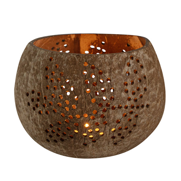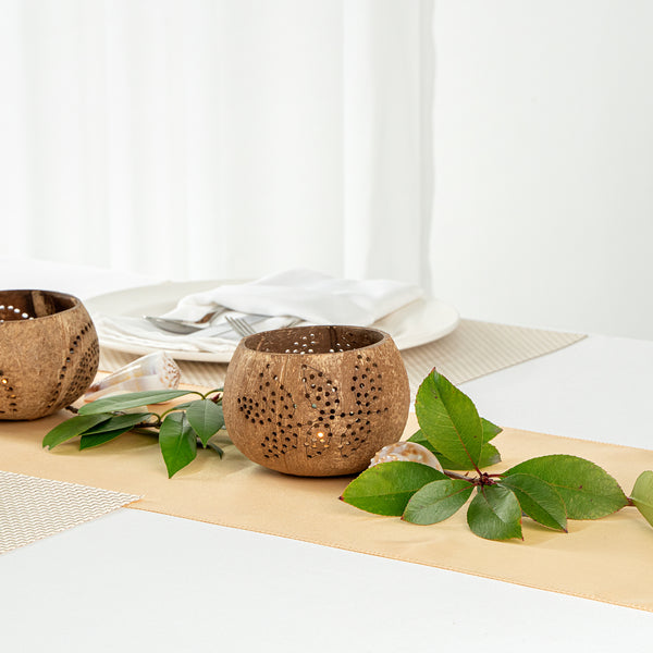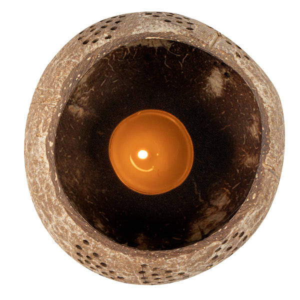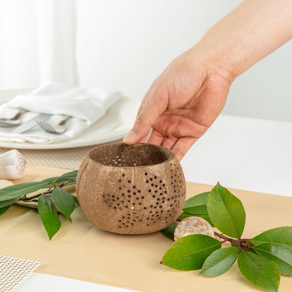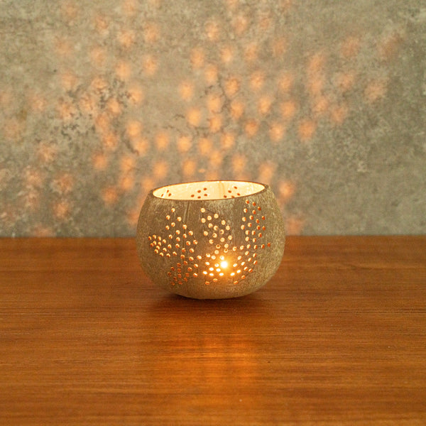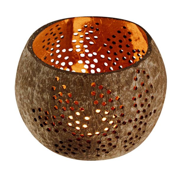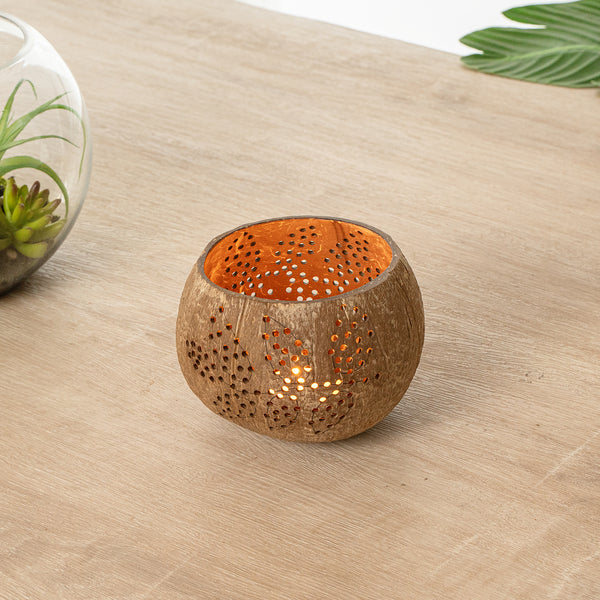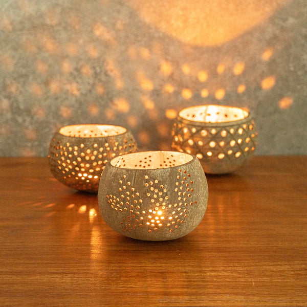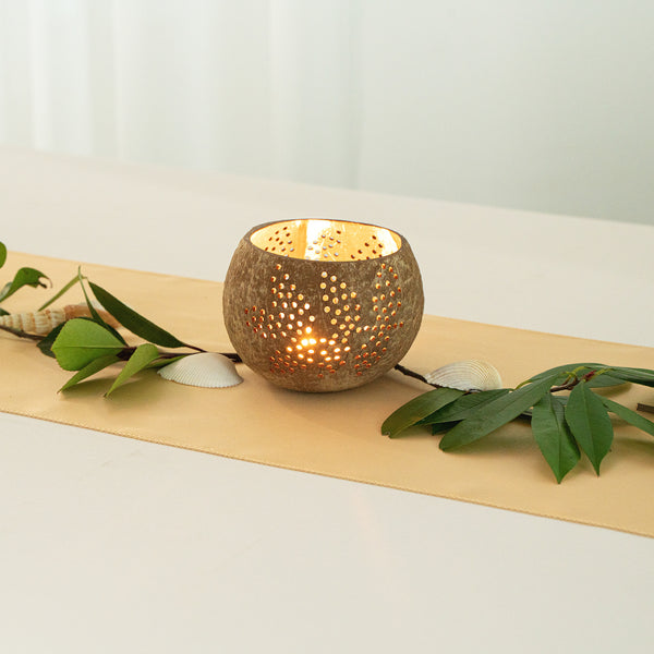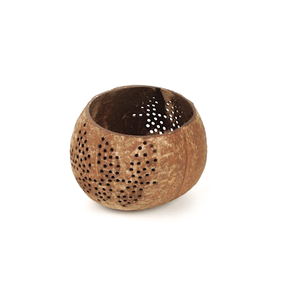 These coconut shell candle holders are handmade from coconut shells and are crafted with charming patterns. Elegance redefined!