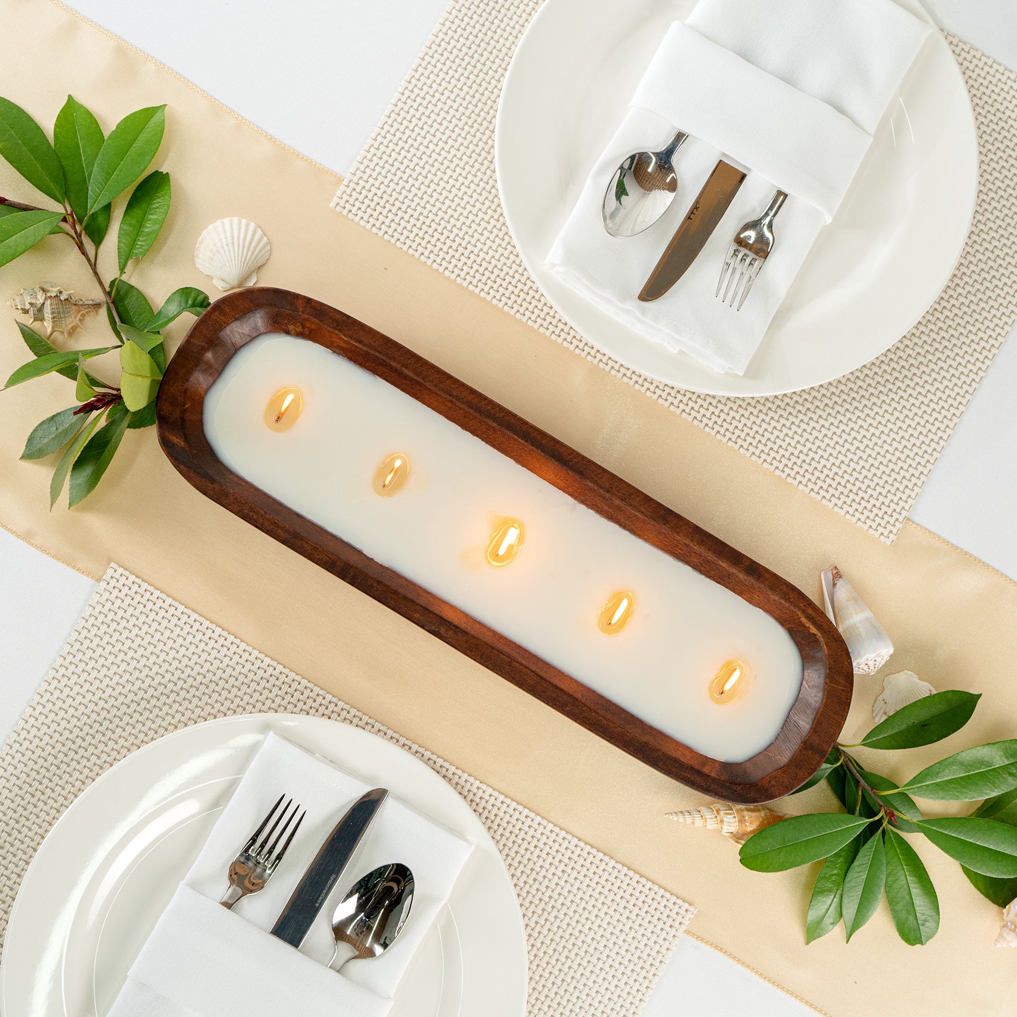 Enhance the ambiance of your bakery, restaurant, or bistro with our Coco Casa Handmade Wood Dough Bowl Candles. These natural and handmade dough bowl candles boast a delightful coconut mango fragrance that fills the room with a warm and inviting scent. Each wooden bowl is sustainably sourced, reducing waste and ensuring a reclaimed, eco-friendly option for your establishment. The unique double wax blend of soy and coconut wax of these candles ensures a long-lasting burn time of up to 20 hours, while the 5 wooden wicks provide a charming crackle effect. These handmade scented candles are zinc-free, phthalate-free, and have an attractive appearance. Once these candles have burned down, the reusable bowls can be repurposed for an array of uses. These wooden bowl candles are commercially compostable and biodegradable, ensuring a minimal environmental impact. Measuring 17.75 inches in length by 5.5 inches in width by 2 inches in height, these bread bowl candles make a perfect centerpiece for any table setting. Sold in a 10 count box. This item will only degrade outside of the traditional solid waste stream.