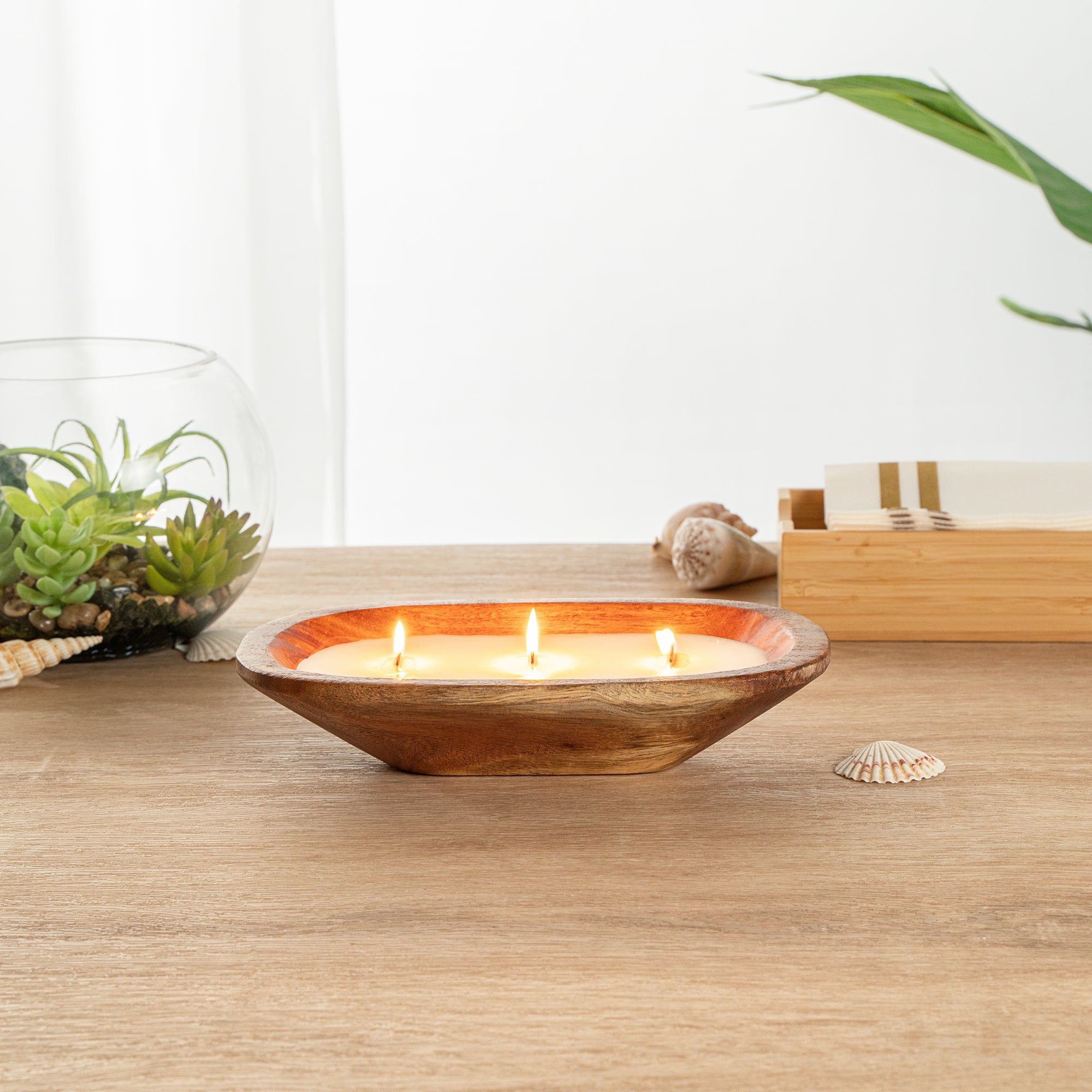 Immerse your senses in the sublime ambiance created by our Coco Casa Handmade Wood Dough Bowl Candle. This exquisitely crafted candle is housed in a natural, handmade wooden dough bowl, introducing a rustic charm to your establishment. The sandalwood and shea fragrance of this wood bowl candle, attained by the perfect blend of soy and coconut wax, fills your space with a calming and therapeutic aroma. Each of these dough bowl candles features three wooden wicks that burn for up to 18 hours, ensuring a prolonged, mesmerizing glow. This wooden bowl candle also promotes sustainability as it is made from reclaimed waste that would have otherwise ended up in a landfill. Plus, this bread bowl candle is commercially compostable and biodegradable, further reducing your environmental impact. This wax candle is zinc-free and phthalate-free, ensuring a clean, toxin-free burn. Once this candle is fully used, the wooden bowl can be reused, reducing waste and offering versatility. Measuring 9 inches in length by 5.5 inches in width by 2 inches in height, this candle in a wooden bowl makes a perfect addition to your space. Sold in a 1 count box. This item will only degrade outside of the traditional solid waste stream.