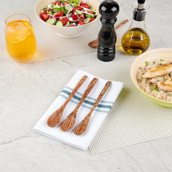 Enhance your dining experience with our Coco Casa Natural Handmade Coconut Spoons. These handcrafted serving spoons are made from natural coconut shells, providing a unique and sustainable alternative to traditional utensils, perfect for elevating the presentation at any event. With their biodegradable utensil properties, they support sustainability initiatives, reducing environmental impact. Measuring 7.75 inches in length, these greaseproof spoons are heat-safe, enabling the serving of a diverse range of menu items while maintaining their integrity. Their smooth, polished finish adds a rustic charm, ensuring a comfortable grip and enhancing the table setting’s aesthetic appeal. Sold in a 4 count box. These items will only degrade outside of the traditional solid waste scommercially compostable tream.