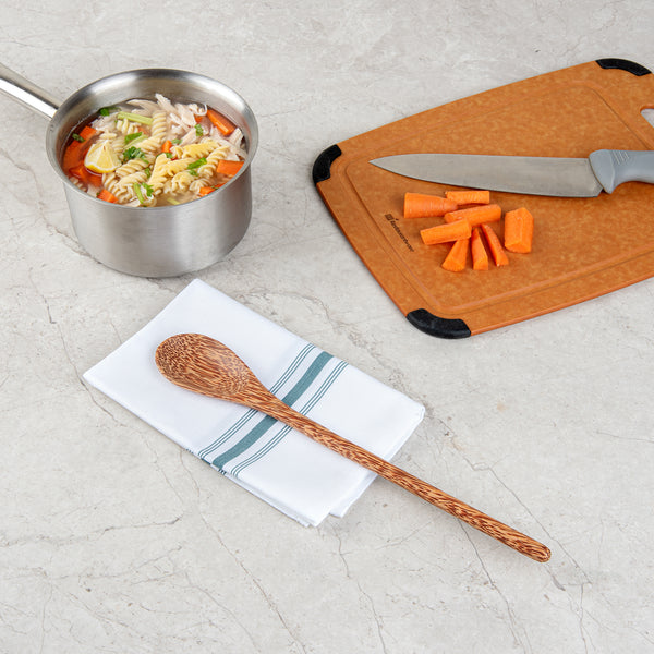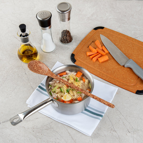 Enhance your foodservice with our Coco Casa Natural Handmade Long Handled Coconut Spoon. This biodegradable serving spoon offers a handcrafted design from coconut shells, providing a sustainable and visually unique serving option. This handmade coconut spoon features a long handle measuring 14.25 inches, ensuring easy access to deep containers and large dishes, enhancing the efficiency and convenience for foodservice professionals. Its heat-resistant properties make it ideal for serving hot soups or stews without compromising integrity. The durable coconut material withstands daily kitchen rigors, making it a reliable choice for frequent use. Greaseproof design maintains a pristine condition even after serving oily dishes, ensuring a clean and appealing presentation. Sold in a 1 count box. This item will only degrade outside of the traditional solid waste stream.