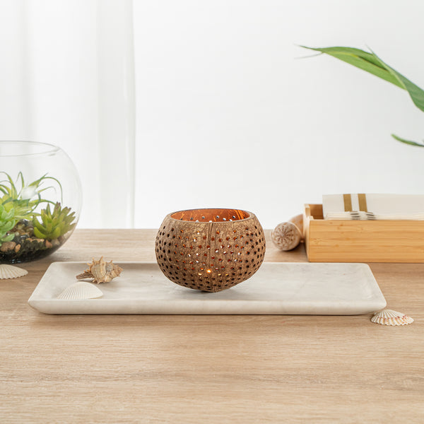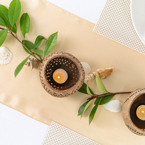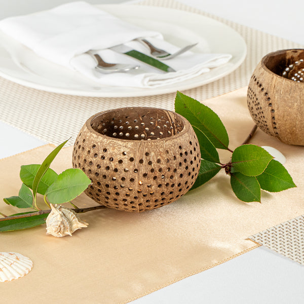 Introduce a touch of tropical elegance with our Coco Casa Tan Handmade Coconut Shell Candle Holders. Handcrafted with precision, these coconut shell candle holders showcase a unique dotted pattern that creates enchanting patterns of light, adding a spellbinding charm to your dining setting or special event. These decorative candle centerpiece serves a practical purpose while enhancing your decor with their festive and tropical allure. These tropical candle decors are sustainable and reusable, making them a responsible choice for eco-conscious businesses. Crafted with natural coconut shells, these unique candle holders are commercially compostable, biodegradable, and recyclable, demonstrating your commitment to reducing environmental impact. With a measurement of 4 inches in diameter by 3.25 inches in height, these candle holders are compact yet captivating, perfect for creating a warm and inviting ambiance. Coconut shells naturally vary in size, due to which the dimensions of our shells may differ slightly. Sold in a 1 count box. This item will only degrade outside of the traditional solid waste stream, ensuring a conscious disposal process.