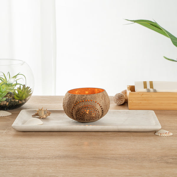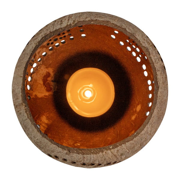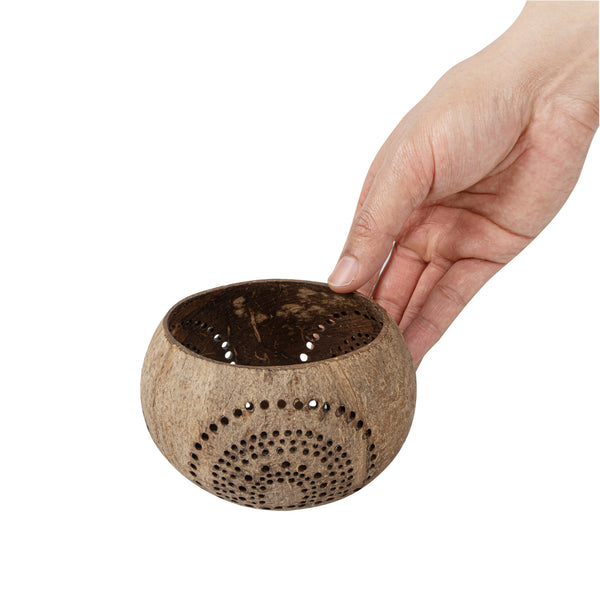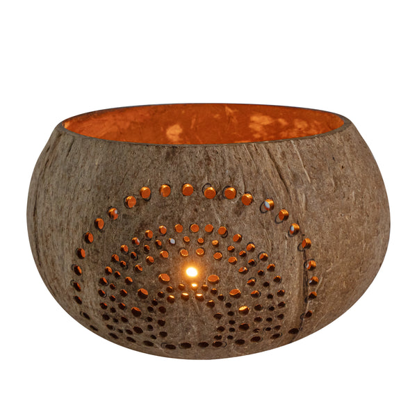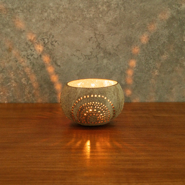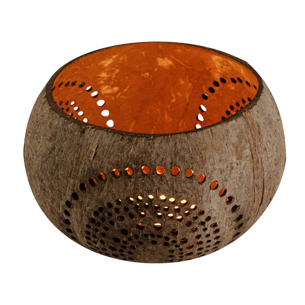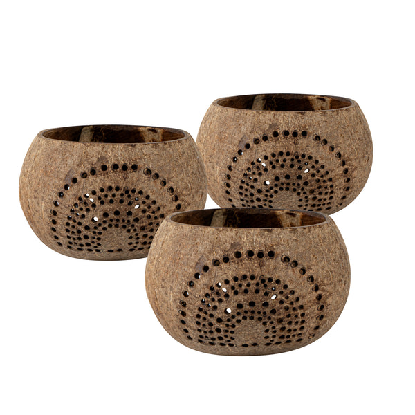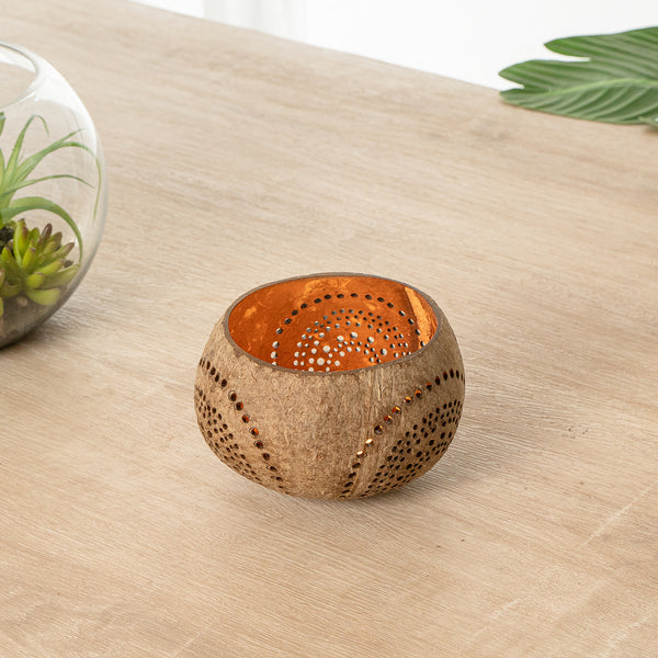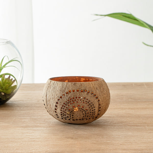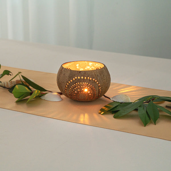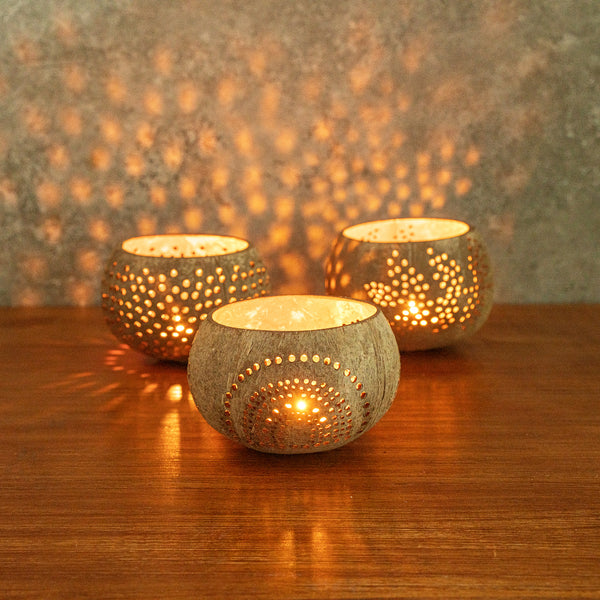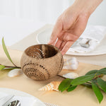 These coconut shell candle holders are handmade from coconut shells and are crafted with charming patterns. Elegance redefined!