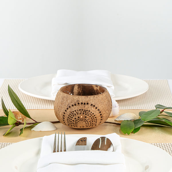 To let you pick the perfect candle holder for your theme and tablescapes, these coconut bowl candle holders are available in a variety of patterns and colors. Elevate your space effortlessly.