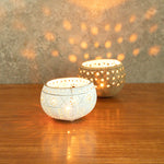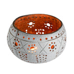 WHITE HANDMADE COCONUT SHELL CANDLE HOLDER - SUN AND LIGHT PATTERN