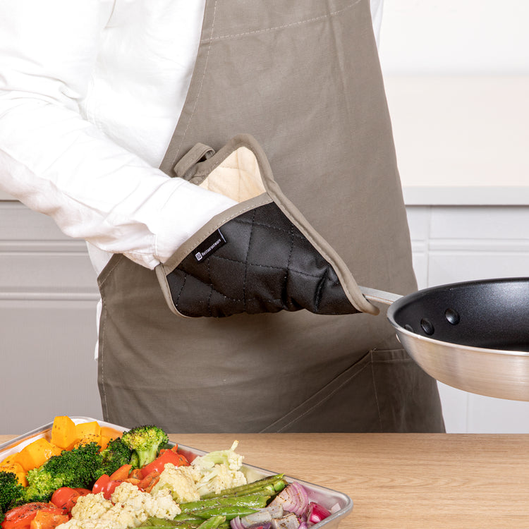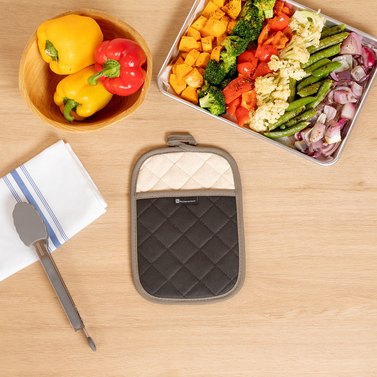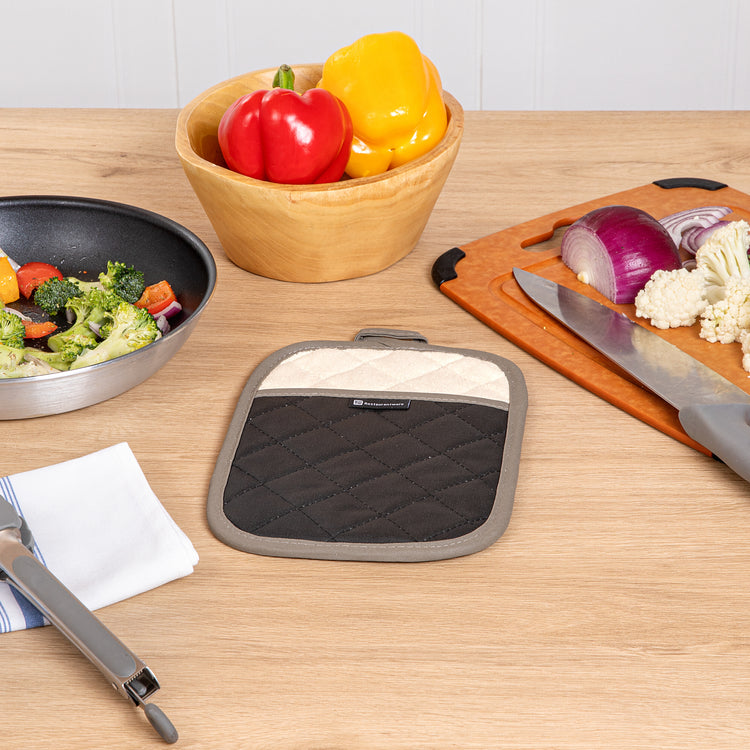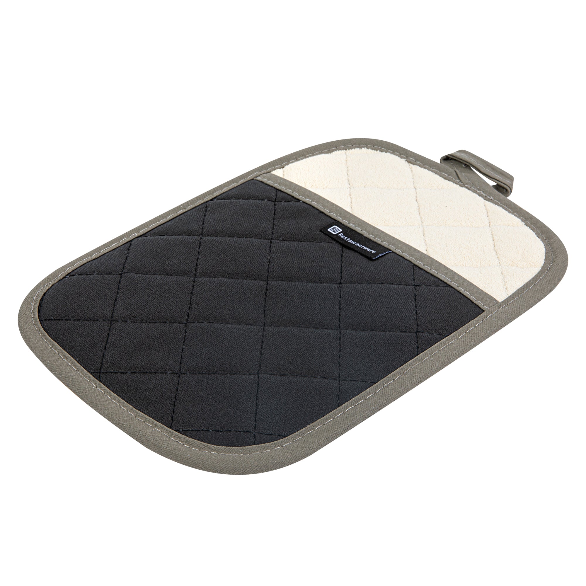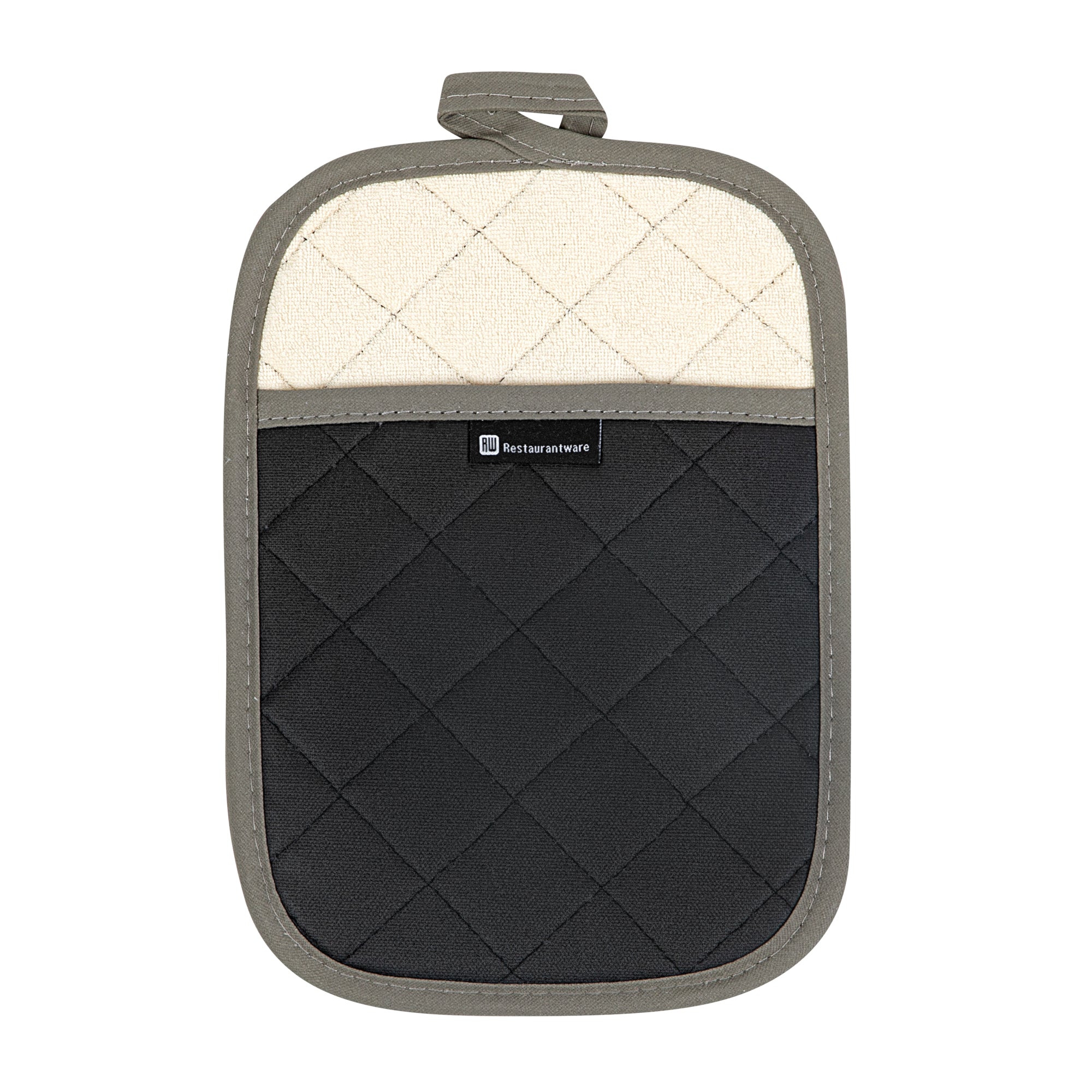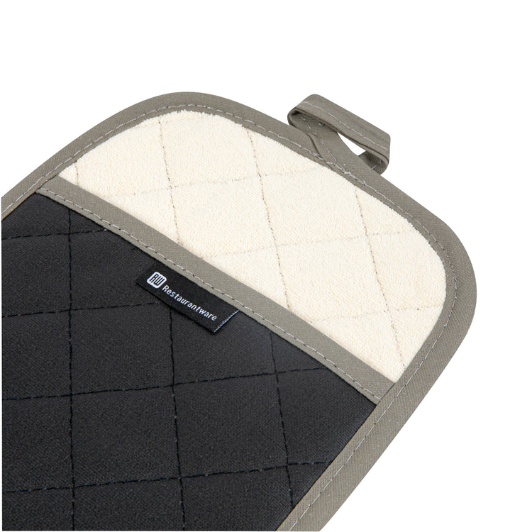 Protect your hands from hot ovens and open flames with our RW Threads Comfort Cotton Black Pot Holder. Crafted from premium cotton, this pot holder with pockets provides a comfortable fit for long-lasting commercial use at your restaurant, buffet, catering company, and more. Featuring a flame-retardant coating, these durable pot holders have been treated to withstand high temperatures of hot pans and baking sheets up to 482 degrees Fahrenheit. Use these heat-resistant pot holders to easily take out sweet apple pie from your bakery or to conveniently transfer hot pans of steamed vegetables at your next catering event. These innovative pot holders measure 10 inches long by 7 inches wide. Sold in a 1 count box.