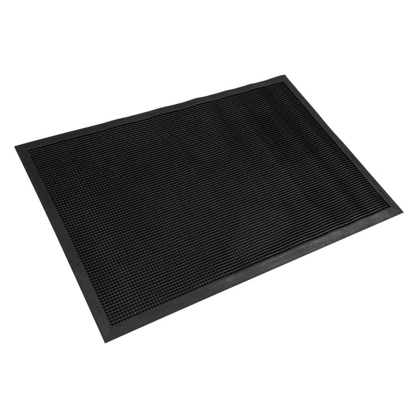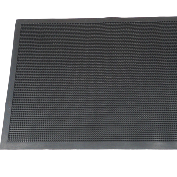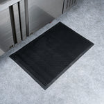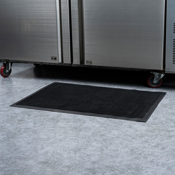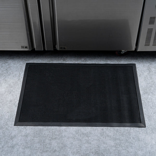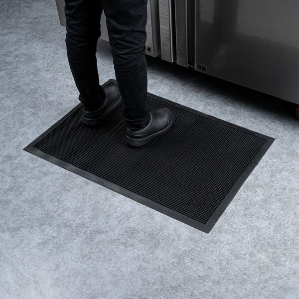 Promote safety at your foodservice establishment with our Comfy Feet Black Rubber Floor Mat. Constructed from rubber, this floor mat provides a comfortable surface for employees to stand on for hours at a time. The durable construction of this rubber floor mat is greaseproof and easily conceals dirt marks to maintain its high-quality appearance. With a textured pattern and tapered edges, this rubber mat reliably stays in place without the risk of shifting or sliding. This outdoor mat is non-slip, promotes a safe environment, and reduces the risk of tripping hazards in your kitchen, prep station, behind the bar, and other areas in your foodservice establishment. To easily clean this doormat, use a vacuum or water hose. Measuring 36 inches long by 24 inches wide, this entryway floor mat is ideal for all places. Sold in a 1 count box.