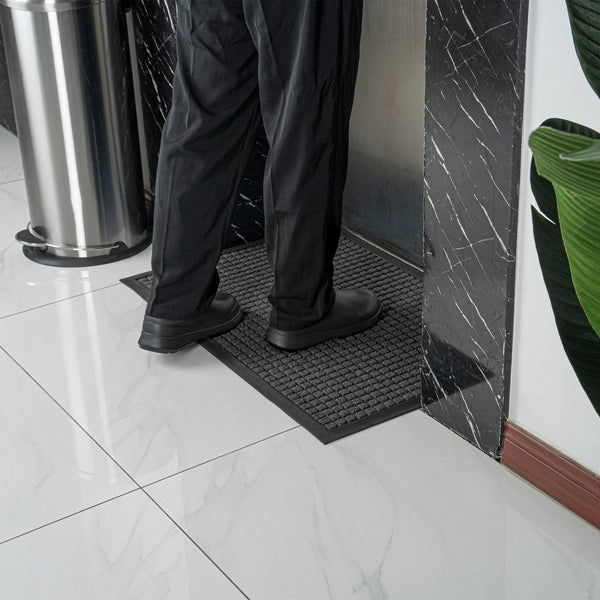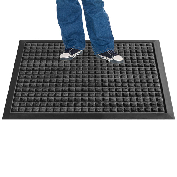Roll out our long-lasting Comfy Feet Dark Gray Heavy-Duty Floor Mat to keep dirt out of your establishment. This dark gray floor mat is stain-resistant and moisture-resistant to retain its elegant look even with the messiest spills. Constructed out of sturdy polypropylene, this entryway mat has a non-skid backing to stay fixed in slippery areas. The waffle pattern of this indoor mat locks in the dirt to keep your floors free from unwanted stains and debris. With a dark gray finish, this outdoor mat gives your restaurant, hotel lobby, or kitchen a professional look. This doormat measures 36 inches long by 24 inches wide. Shipped in a 1 count box.