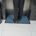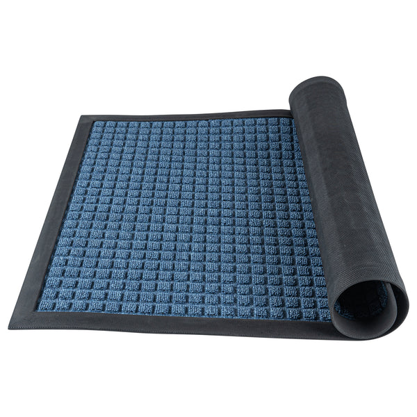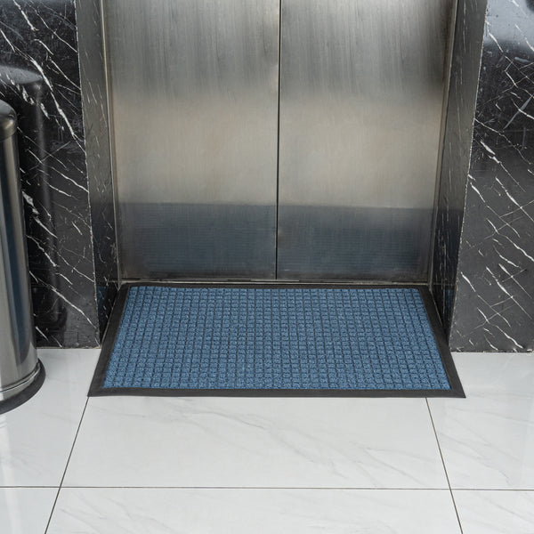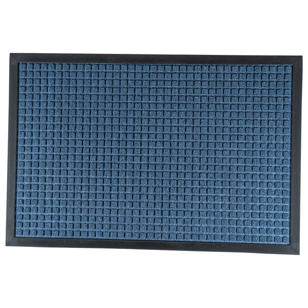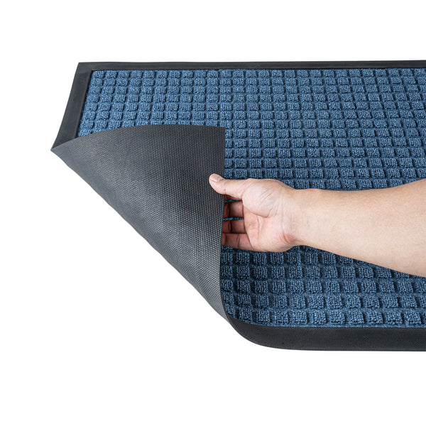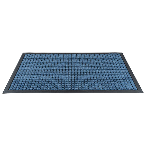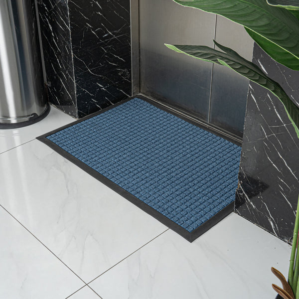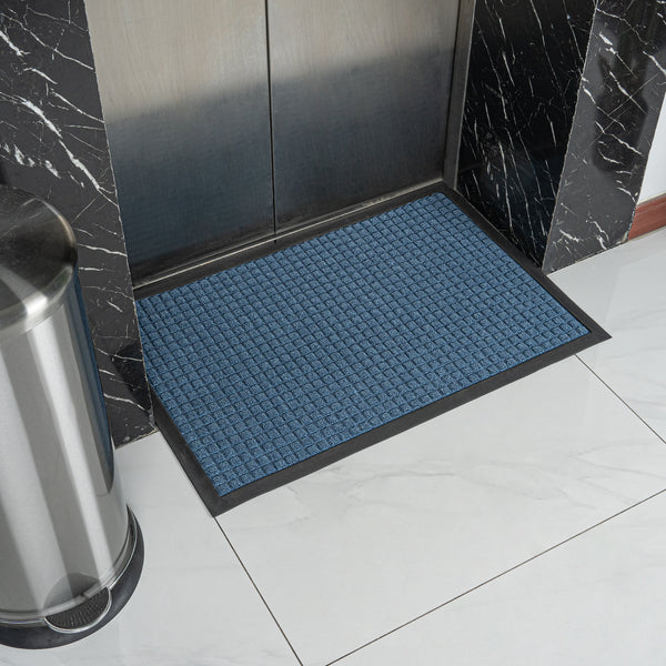 Create a beautiful entrance with our Comfy Feet Light Blue Heavy-Duty Carpet Floor Mat. This outdoor mat is constructed out of durable polypropylene fibers that are perfect for areas with heavy foot traffic. The moisture-resistant and stain-resistant features of this entryway mat resist liquid damage and retain its professional look. With a non-slip backing, this lobby mat locks into place to minimize trips and falls. This indoor mat is designed with a waffle pattern to trap dirt and soil and prevent messes on your floors. With a non-skid backing, this light blue mat latches onto your floor's surface and prevents falls. The light blue finish of this floor mat creates a welcoming invitation at the entrance of your restaurant, lobby, home, or kitchen. This doormat measures 36 inches long by 24 inches wide. Shipped in a 1 count box.