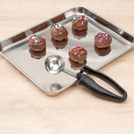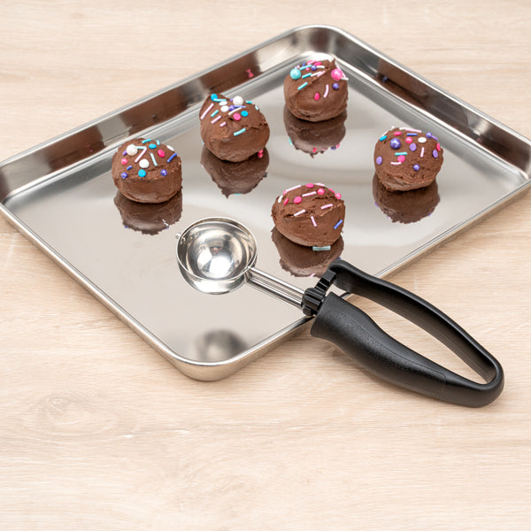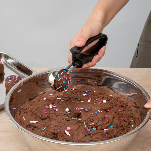 The built-in blade of these kitchen scoops effectively scrapes off every bit of ice cream to create perfectly round mounds and prevent waste. No more excess ice cream left on the scoop!
