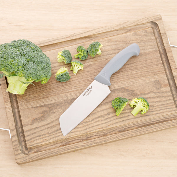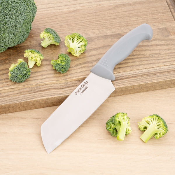Achieve precise cuts effortlessly with secure grip control. The Comfy Grip Gray Stainless Steel Vegetable Knife offers a TPE plastic handle that ensures a non-slip grip, providing unmatched safety and control during food preparation. Designed with an 11.88-inch straight blade, this vegetable knife facilitates long and consistent cuts, enhancing food presentation and cooking consistency. Made of durable stainless steel, this chef knife excels in slicing through tough ingredients, making it an essential tool for any commercial kitchen. Its ergonomic handle design minimizes hand fatigue, promoting comfort and efficiency during extended use. Plus, the dishwasher-safe construction simplifies cleanup, saving valuable time and maintaining hygiene in fast-paced environments. Equip your kitchen with this stainless steel knife to improve preparation efficiency and deliver consistent culinary results. Sold in a 1 count box.