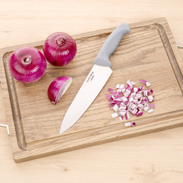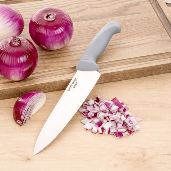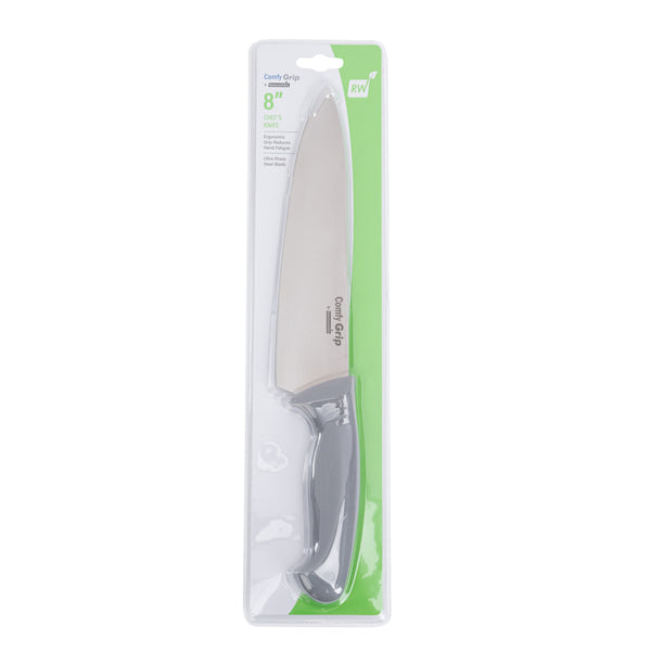 Experience effortless precision with a versatile 8 inch chef knife. The Comfy Grip Non-Slip Chef Knife features a TPE handle that provides a secure grip, ensuring safe slicing without hand fatigue during extended use. Its sharp stainless steel blade maintains its edge, making it an ideal professional chef knife for slicing, dicing, mincing, and chopping a variety of ingredients in commercial kitchens. With its durable design, this stainless steel chef knife easily cuts through tough ingredients, enhancing kitchen efficiency and reducing prep time. The balanced weight distribution of this kitchen essential offers chefs optimal control and precision, improving cutting accuracy for all tasks. With a blade measuring 8 inches and an overall length of 13.5 inches, this tool is perfect for culinary students, catering services, and home cooks seeking professional-grade kitchen tools. Elevate your culinary experience with this indispensable chef's companion. Sold in a 1 count box.