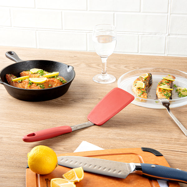 The rubber grip of the handle in these silicone solid turners allows you to maneuver them easily without having to strain yourself. Built-in hanging hole for easy storage and access.
