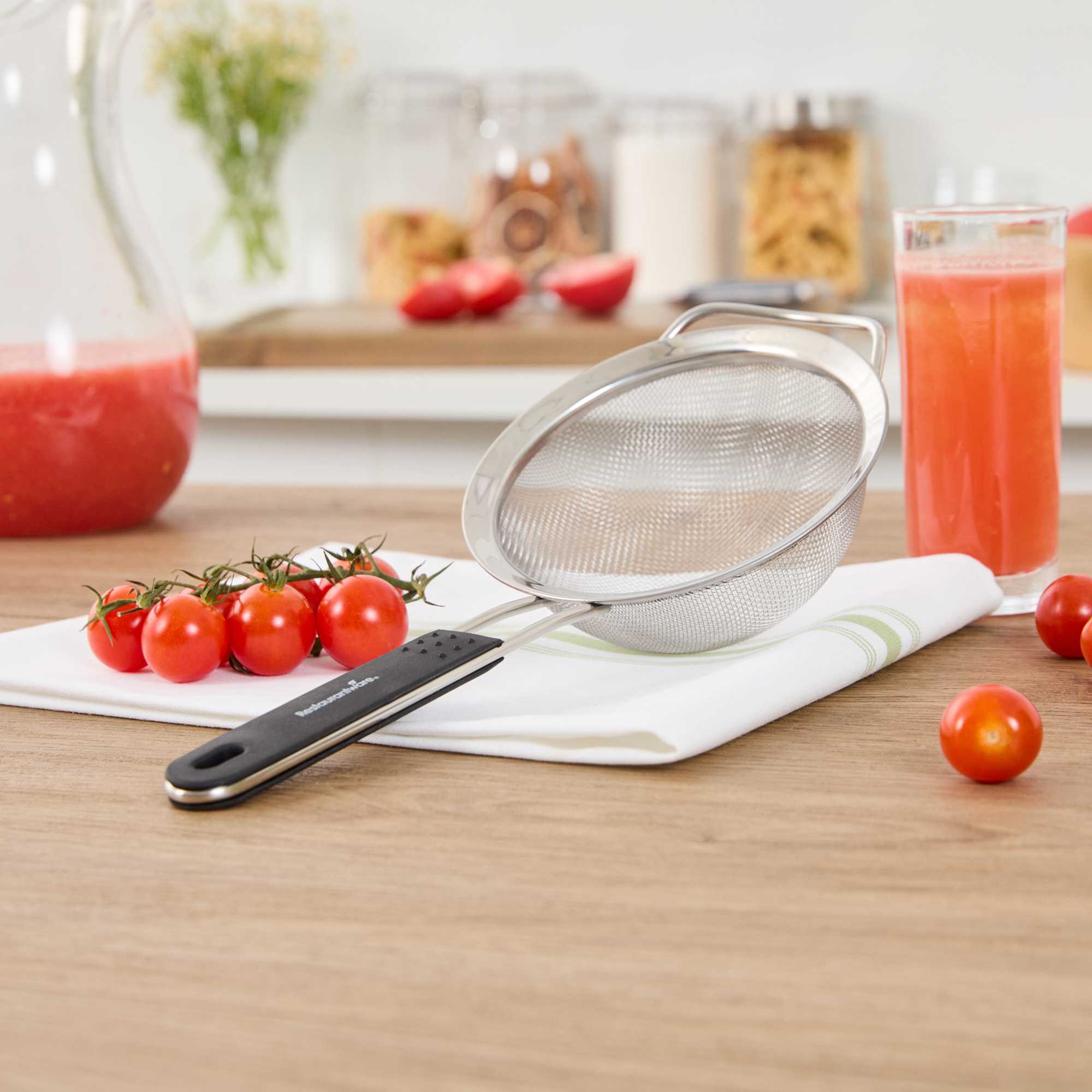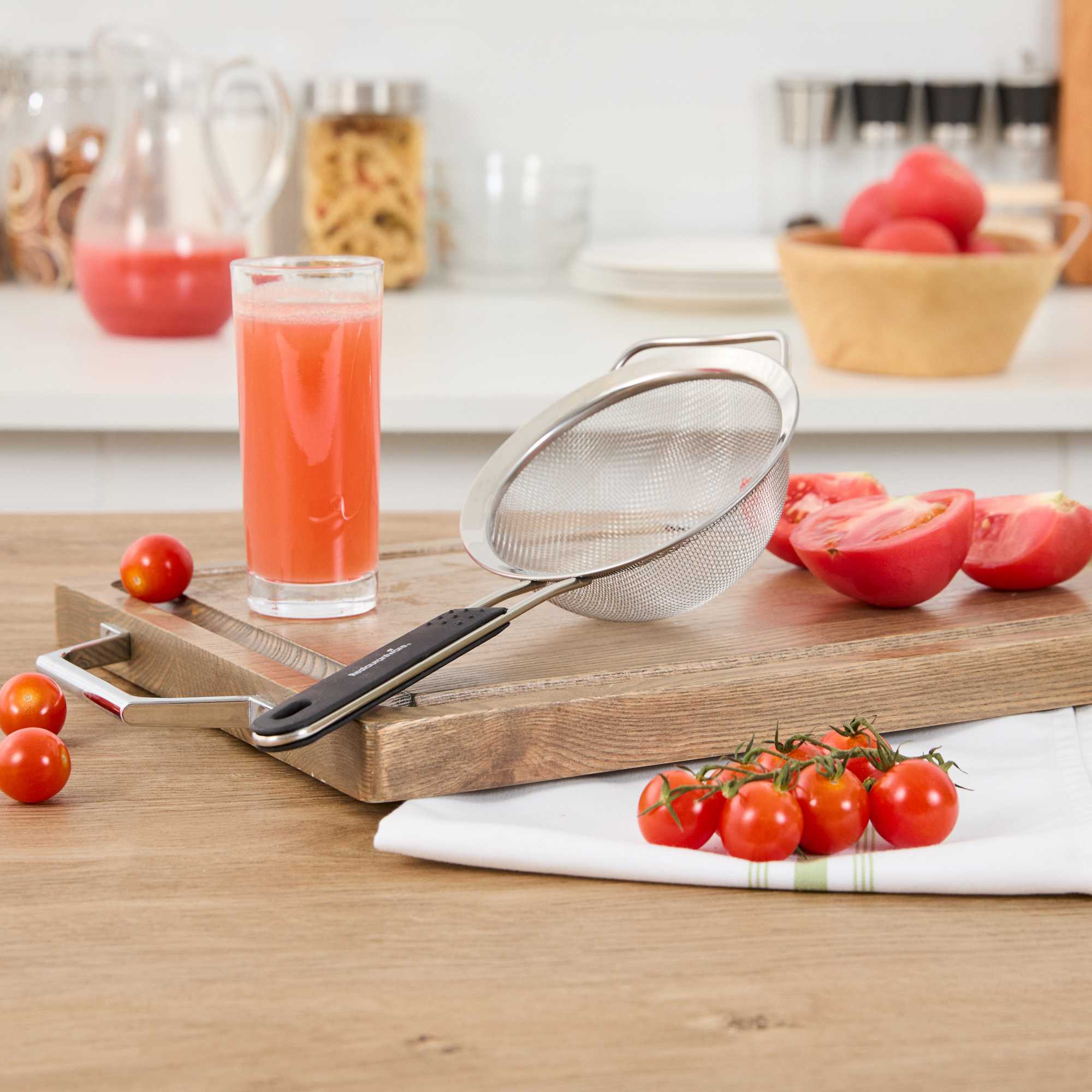 - Extra fine mesh filters out small particles for smooth sauces, broths, and teas