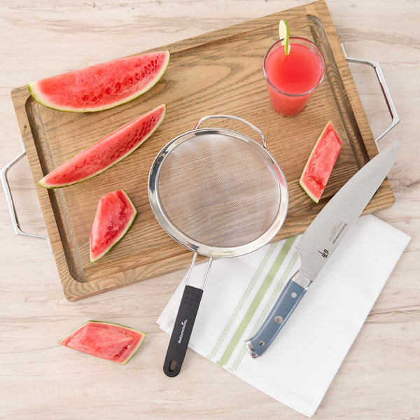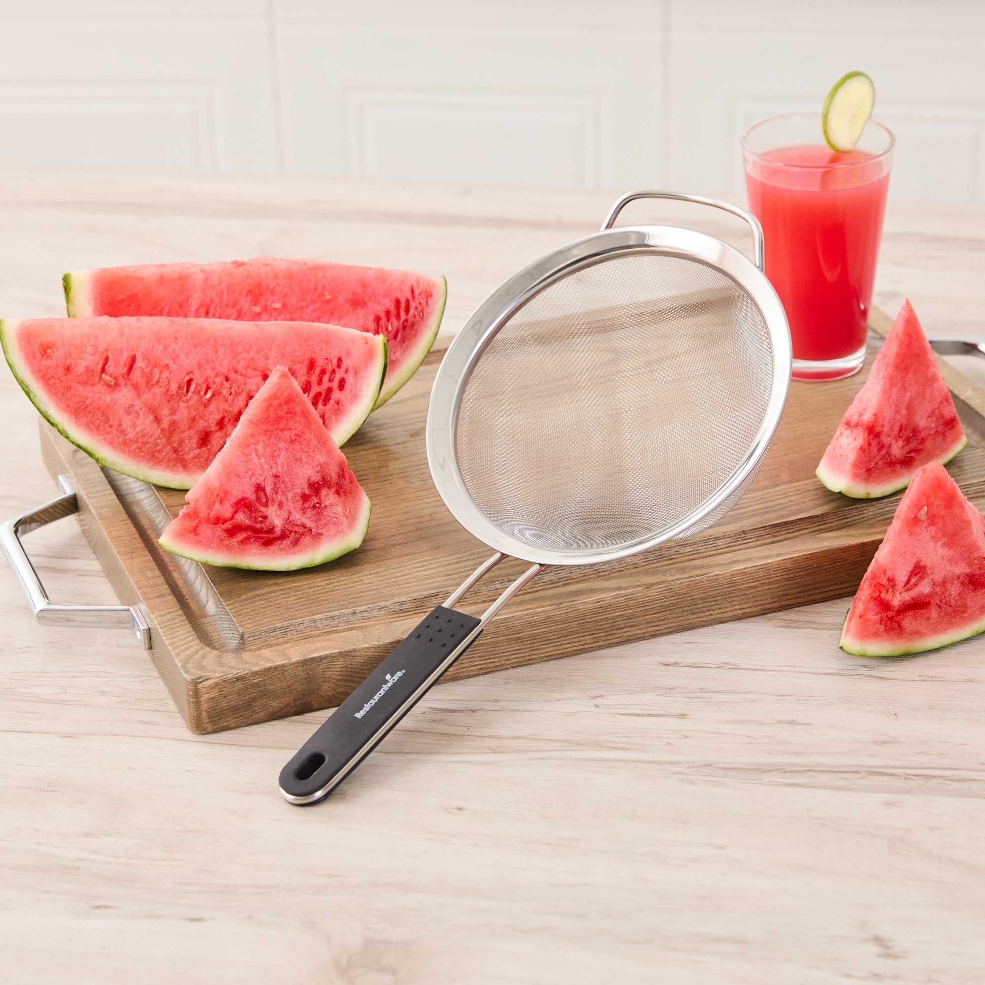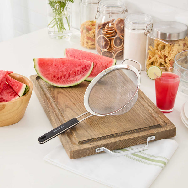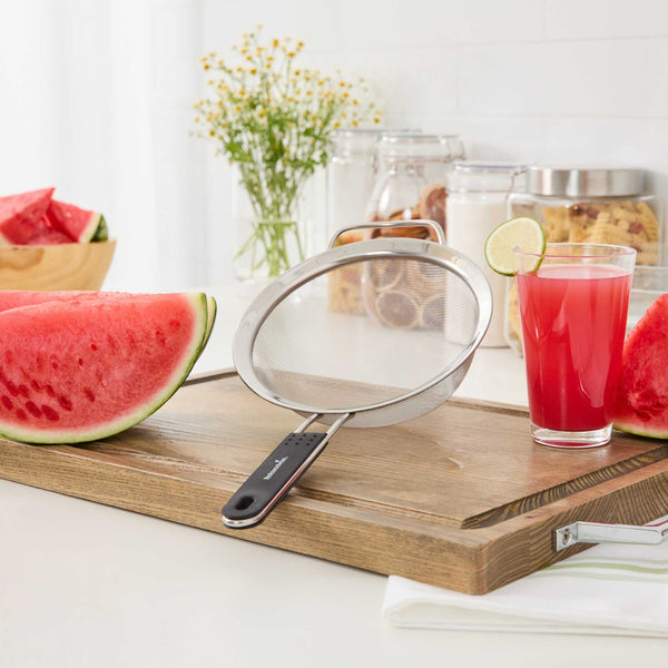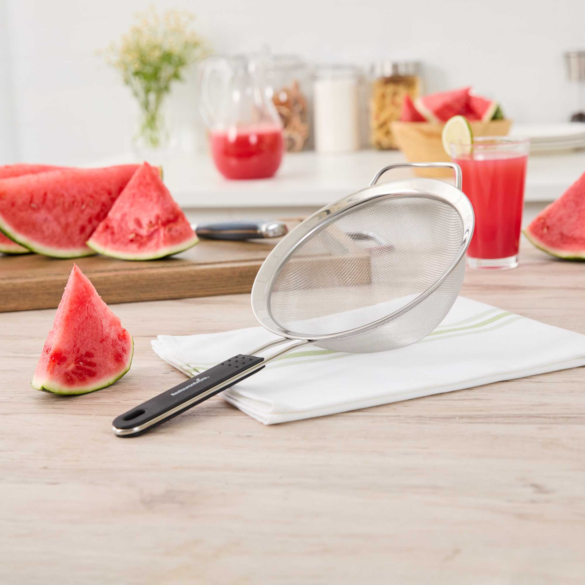 - Extra fine mesh filters out small particles for smooth sauces, broths, and teas