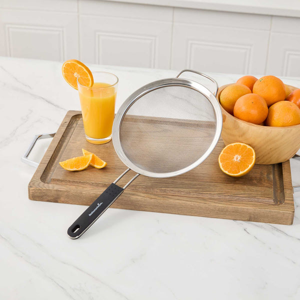 - Extra fine mesh filters out small particles for smooth sauces, broths, and teas