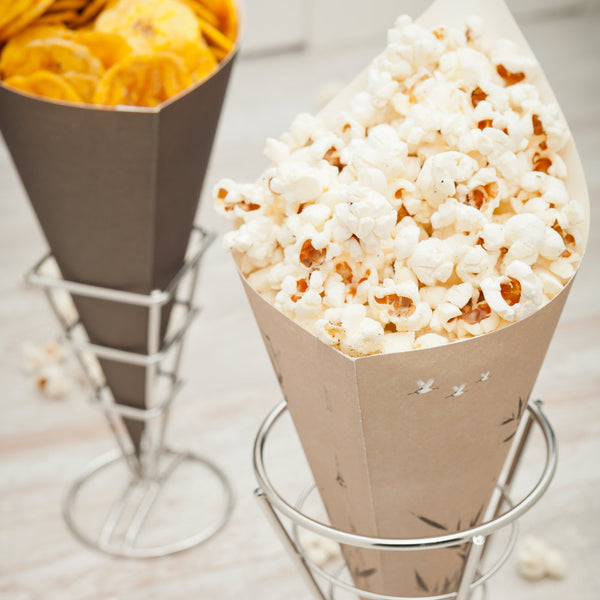 Serve buttery popcorn and fried onion rings using our Cone Tek Paper Food Cones. These food paper cones are made from premium heavyweight paper to hold your appetizers and desserts with ease. Featuring a stylish bamboo print, these popcorn paper cones are the perfect addition to any party, catered event, or other special occasion. These food paper cones can also be recycled for an eco-friendly disposal. These appetizer cones are coated with a grease-resistant lining to keep your mouthwatering treats from getting soggy. With an easy-to-hold design, these food paper cones are great for passing out warm or cold foods at events. For an elevated look, pair these popcorn paper cones with our collection of cone stands to beautifully display your treats. These appetizer cones measure 11.5 inches long and 5.5 inches wide and are shipped in a 100 count box. Cone stands are available and sold separately.