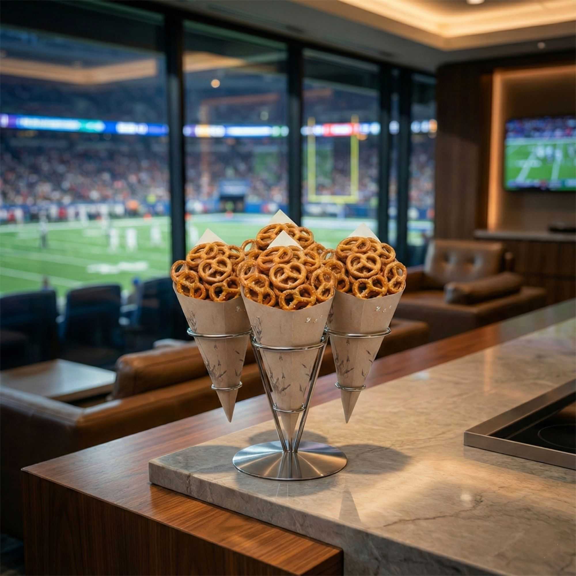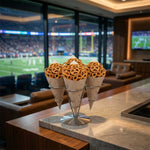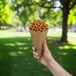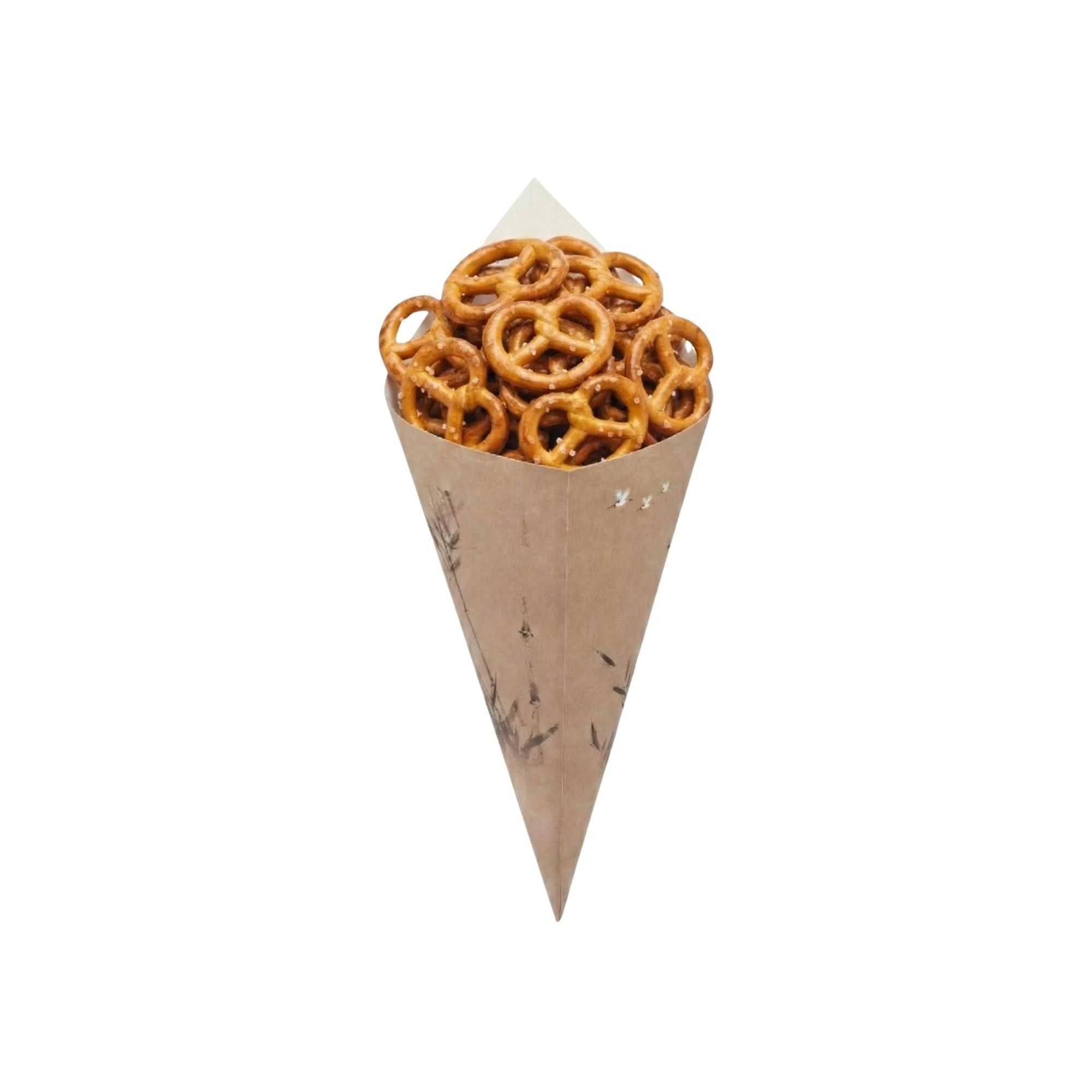 Hand out sweet or savory treats using our Cone Tek Bamboo Print Paper Food Cones. Designed with the beautiful images of bamboo stalks and wildlife, these food cones elegantly enhance your on-the-go meals and snacks. With their heavyweight paper construction, these snack cones hold generous servings of nuts, fruit, or bite-sized pastries. Perfect for fried foods, these appetizer cones are grease-resistant and eliminate the need for liners. Use these stylish fry cones to serve all types of fare and impress your guests. These paper cones are recyclable for a quick and efficient cleanup at your quick-service restaurant, food truck, or catered event. Place these candy cones in our coordinating cone stands for conveniently serving them in your dining area. Measuring 9.5 inches long and 4.5 inches wide, these party paper cones are sold in a 100 count box. Cone stands are available and sold separately.