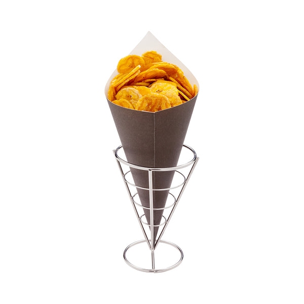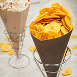 Add style to your on-the-go orders with our Cone Tek Black Paper Food Cones. Featuring an elegant black finish, these food cones add chic and stylish flair to the serving style at your food stand, food truck, or fast-casual restaurant. With their heavyweight construction, these paper cones can hold a large amount of your scrumptious popcorn or sweet candies. Equipped with a grease-resistant lining, these popcorn paper cones prevent oily stains from sauces or buttery snacks. Perfect for serving environmentally conscious customers, these candy cones are recyclable to meet the eco-friendly standards at your foodservice establishment. Pair these appetizer cones with our coordinating cone stands to create one-of-a-kind presentations. These paper party cones measure 11.5 inches long and 5.5 inches wide. Sold in a 100 count box. Cone stands are available and sold separately.