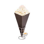 Give appetizers and finger foods a revolutionary handheld makeover with our Cone Tek Black Food Cones with Dipping Pockets. Featuring a fold-out sauce pocket, these large snack cones are ideal for serving french fries, chicken tenders, and popcorn shrimp alongside their accompanying dipping sauces. These modern paper food cones have a grease-resistant lining to prevent messes and oily splotches. Use these stylish black fry cones to serve crispy sweet potato fries with an herbed buttermilk ranch, or to serve spicy buffalo wings with creamy blue cheese dressing! Constructed from strong and sturdy heavyweight paper, these large food cones provide a mess-free serving solution for food trucks, concession stands, catered events, and more. Measuring 15 inches long and 9 inches wide, these paper cones for food have plenty of room for a heaping helping of your favorite appetizers or desserts. Sold in a bulk 100 count box.
