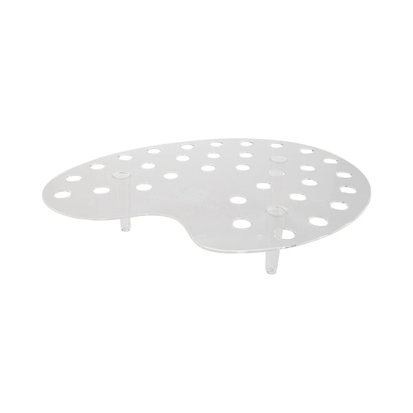 Showcase your miniature waffle cones on our Cone Tek Clear Plastic Palette Cone Holders. These artist palette shaped cone holder trays securely display an assortment of mini waffle cones in 35 durable, plastic cone slots. With a centerpiece, these plastic cone display stands add an elegant, transparent design to any countertop. Equipped with three legs designed to sit a bit back from the edge, these plastic cone stands exhibit a floating-like appearance. Constructed of food-grade plastic, these cone stands are ideal for safely securing cones for customer selection or kitchen prep. With lightweight construction, these cone holder trays provide easy handling during transport or rearranging. These reusable clear plastic cone holders keep your mini waffle cones attractively organized for customer selection. The transparent finish of these plastic palate cone holders offers a sleek look while keeping each cone visible and within easy reach. Measuring 16 inches in length by 13 inches wide by 3 inches in height, these spacious cone holder trays give each mini waffle cone its own space for mess-free displaying. Sold in a 4 count box.