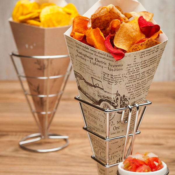 Add a modern twist to appetizers using our Cone Tek Paper Food Cones. Each of these stylish newspaper cones are designed with a convenient built-in sauce pocket to make it easy to hold, dip, and enjoy meals. Made from heavyweight paper, these food safe paper cones are durable and built to handle hefty and oily foods. These paper cones for snacks have a trendy newsprint design that pairs perfectly with the decor at your food truck, restaurant, or concession stand. These food safe paper cones are recyclable, for an eco-friendly disposal. These newspaper cones are grease-resistant, making them great for keeping oily or buttery foods fresh. Coordinate these paper cones for snacks with our collection of matching cone stands to display all kinds of potato wedges, popcorn, and onion rings with ease. These newspaper cones measure 9.5 inches long and 5.5 inches wide and are shipped in a 100 count box. Cone stands are available and sold separately.