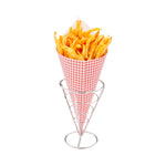 Serve your crispy french fries and buttery popcorn in style with our Cone Tek Picnic Print Food Cones. Covered in a red and white checkered print, these attention-grabbing paper food cones look great at outdoor weddings, festivals, sports events, and more. These french fry holders are constructed from heavyweight paper that is conveniently disposable and recyclable. These party paper cones have a grease-resistant lining to keep them from getting soggy and making a mess on your customers' hands. Use these versatile paper cones for snacks and appetizers, or as a unique way to present your sweets and desserts. Featuring a handheld design with a large sloped opening, these paper food cones provide a mess-free and portable serving solution for food trucks, concession stands, and catering companies. These fry cones are handheld or can be served in our coordinating cones stands. Each of these food cones measures 9.5 inches long by 4.5 inches wide. Available in a bulk 100 count box. Cone stands are available and sold separately.