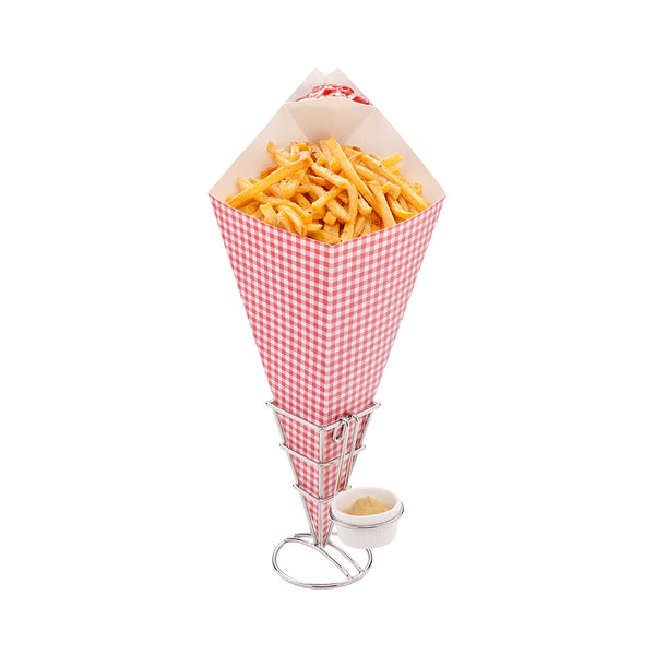 Create innovative appetizer displays using our Cone Tek Paper Food Cones. These fry cones include a built-in dipping pocket, perfect for pairing all kinds of fries, potato wedges, onion rings and more with your favorite sauces. Made from durable heavyweight paper, these disposable cone cups maintain their shape when filled with your delicious foods. Great for food trucks, concession stands, or catered events, these serving cones are conveniently recyclable for an easy and eco-friendly cleanup. To prevent oily foods from creating messes, these fry cones have a grease resistant lining. These serving cones have a charming picnic print that perfectly complements the decor at your establishment or event. To enhance your food presentation, pair these disposable cone cups with our collection of matching cone stands for an elevated display. These fry cones measure 9.5 inches long and 5.5 inches wide and are shipped in a 100 count box. Cone stands are available and sold separately.