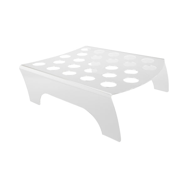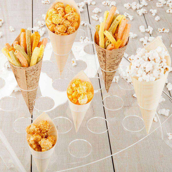Serve mouthwatering desserts, appetizers, or snacks with our Cone Tek Rectangle Clear Plastic Acrylic Cone Stand. Made from premium plastic, this durable cone display is shatterproof and scratch-resistant to sustain its exceptional design for long-lasting commercial use. This chic food stand has a clear finish to beautifully display the colors and freshness of fruit cones, ice cream cones, french fry cones, and other flavorful treats. Featuring a smooth surface, this plastic cone holder is easy to clean and wipe down to streamline your cleaning process. This clear cone stand has 25 slots to display a wide variety of food cones at your busy foodservice establishment or large catering event. Each hole measures 3.8 centimeters in diameter and perfectly pairs with our Cone Tek medium cones (SKU: RWB0153 and RWB0108) and large cones (SKU: RWB0154 and RWB0109). Measuring 13.5 inches in height and 4.25 inches in width, this acrylic food display is sold in a 1 count box. Food cones are available and sold separately.
