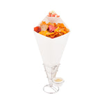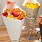 Serve heaping scoops of your tasty fare in these Cone Tek White Food Cones with Dipping Pockets. Designed with an innovative fold-out sauce pocket, these large paper food cones are perfect for serving chicken tenders, french fries, and popcorn shrimp alongside their respective dipping sauces. Featuring a grease-resistant lining, these fry cones are grease-resistant to preserve their high-quality look. Use these heavyweight paper cones for snacks like crispy sweet potato fries with creamy honey mustard sauce or salty pretzel bites with gooey cheese sauce! Ideal for food trucks and concession stands, these paper food cones are shipped flat for easy space-saving storage. To assemble, simply open and fold along the perforated lines. Measuring 15 inches long and 9 inches wide, these paper french fry cones have plenty of room for large portions of your best-selling snacks and appetizers.are sold in a bulk 100 count box.