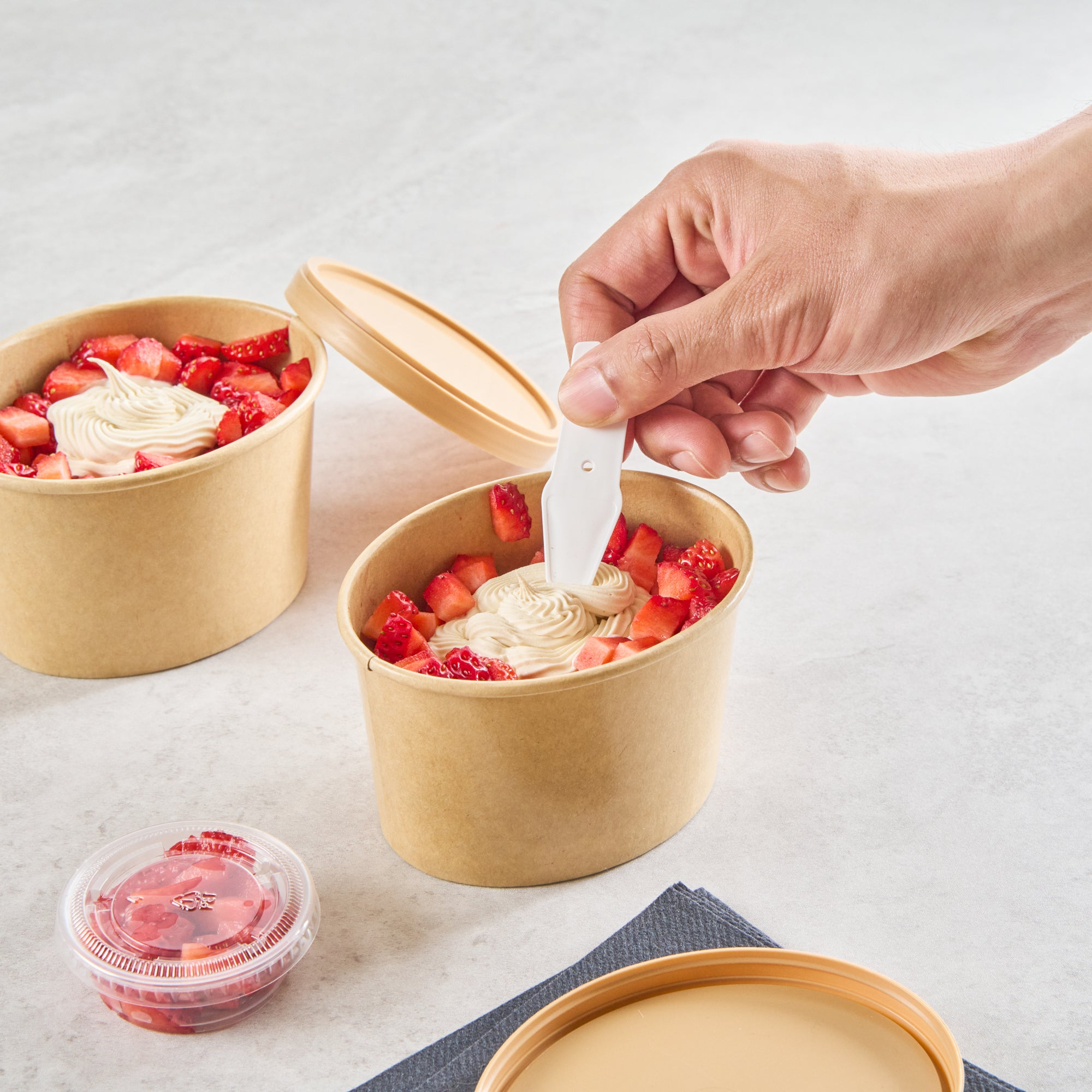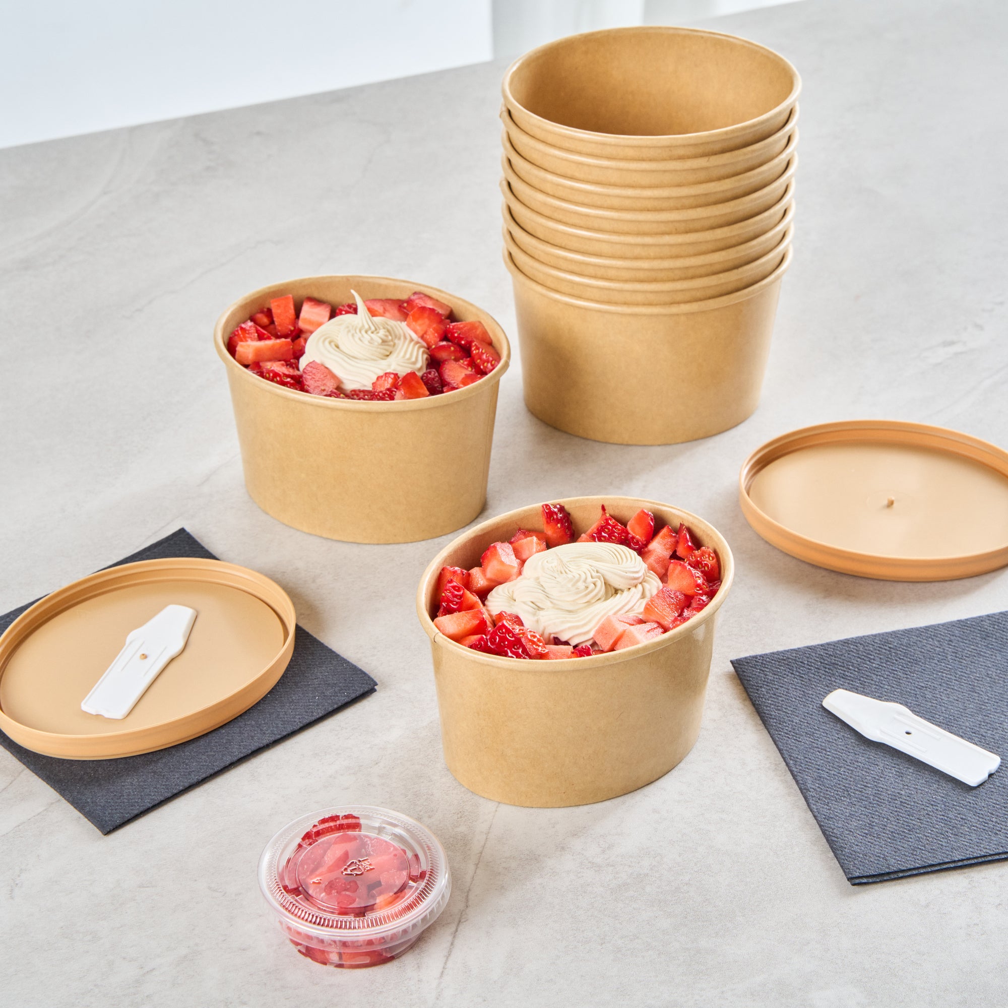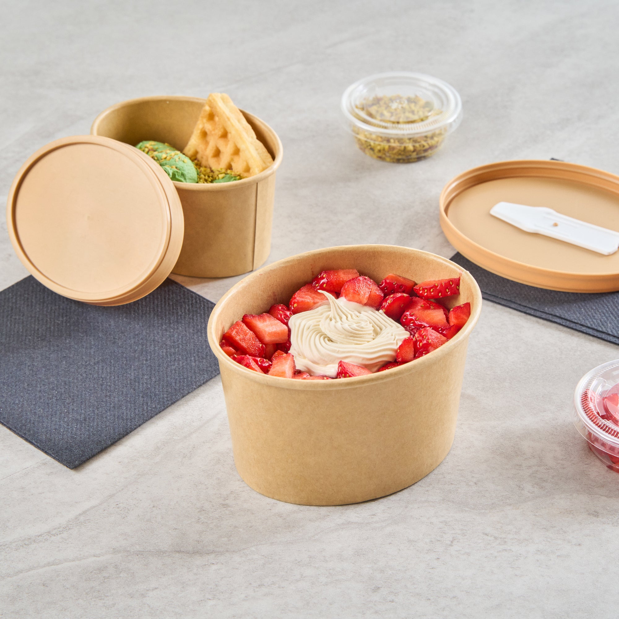 Add a gourmet touch to desserts with our Coppetta 12-ounce Oval Kraft Paper To Go Cups. These oval ice cream cups feature a grease-resistant PE lining to keep oil from seeping through, ensuring a neat food presentation. Crafted from durable paper, these takeaway dessert cups are suitable for a variety of dishes, from soups to frozen yogurts. Eco-conscious customers will appreciate that these kraft paper cups are recyclable, providing an environmentally friendly option for your foodservice needs. Designed with a rolled rim, these to go cups securely hold coordinating lids (SKU: RWA1748BR) for worry-free transport. The natural kraft finish of these disposable cups adds a rustic charm, making them an attractive choice for catering events or food trucks. Additionally, these round ice cream cups are freezer-safe, allowing you to store leftovers effortlessly. Measuring 4.53 inches in length by 3.62 inches in width by 2.68 inches in height, these kraft paper cups have a 12-ounce capacity to accommodate a generous serving size. Sold in a 200 count box.