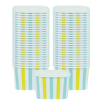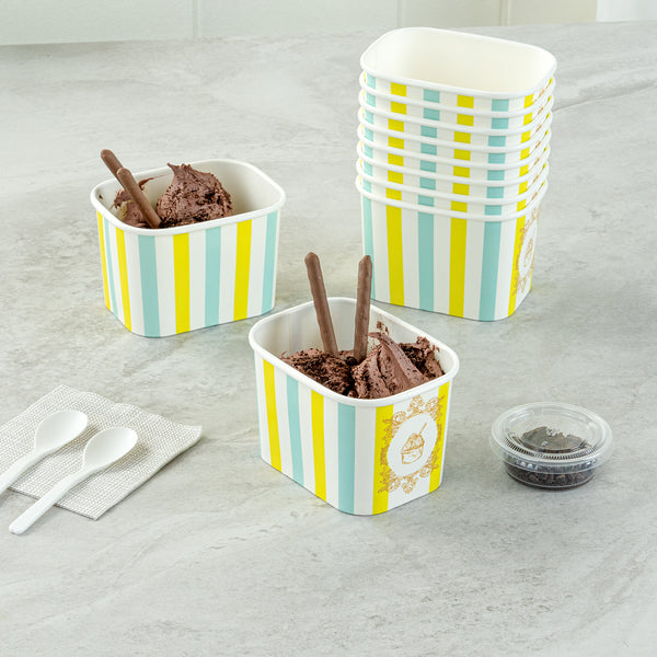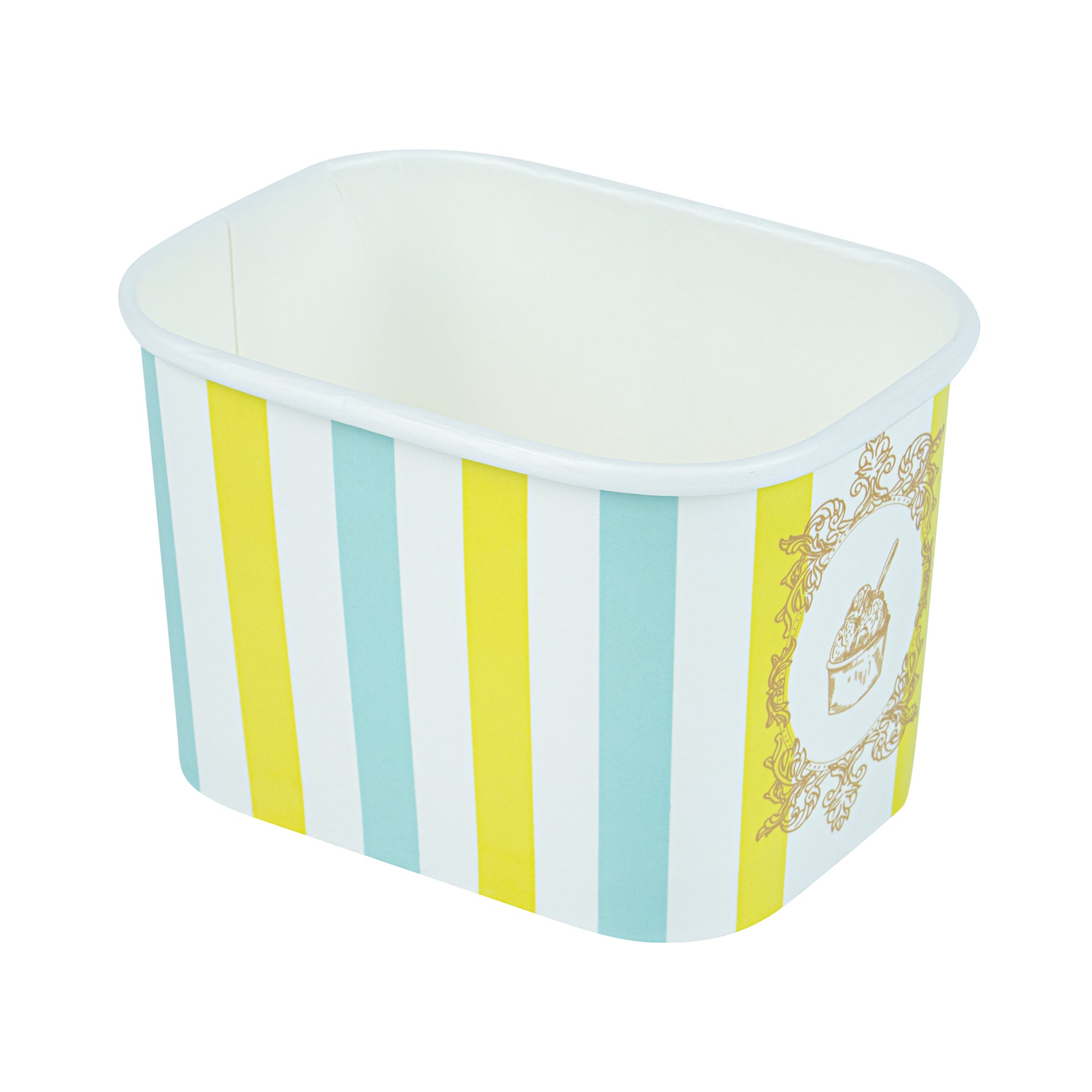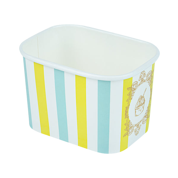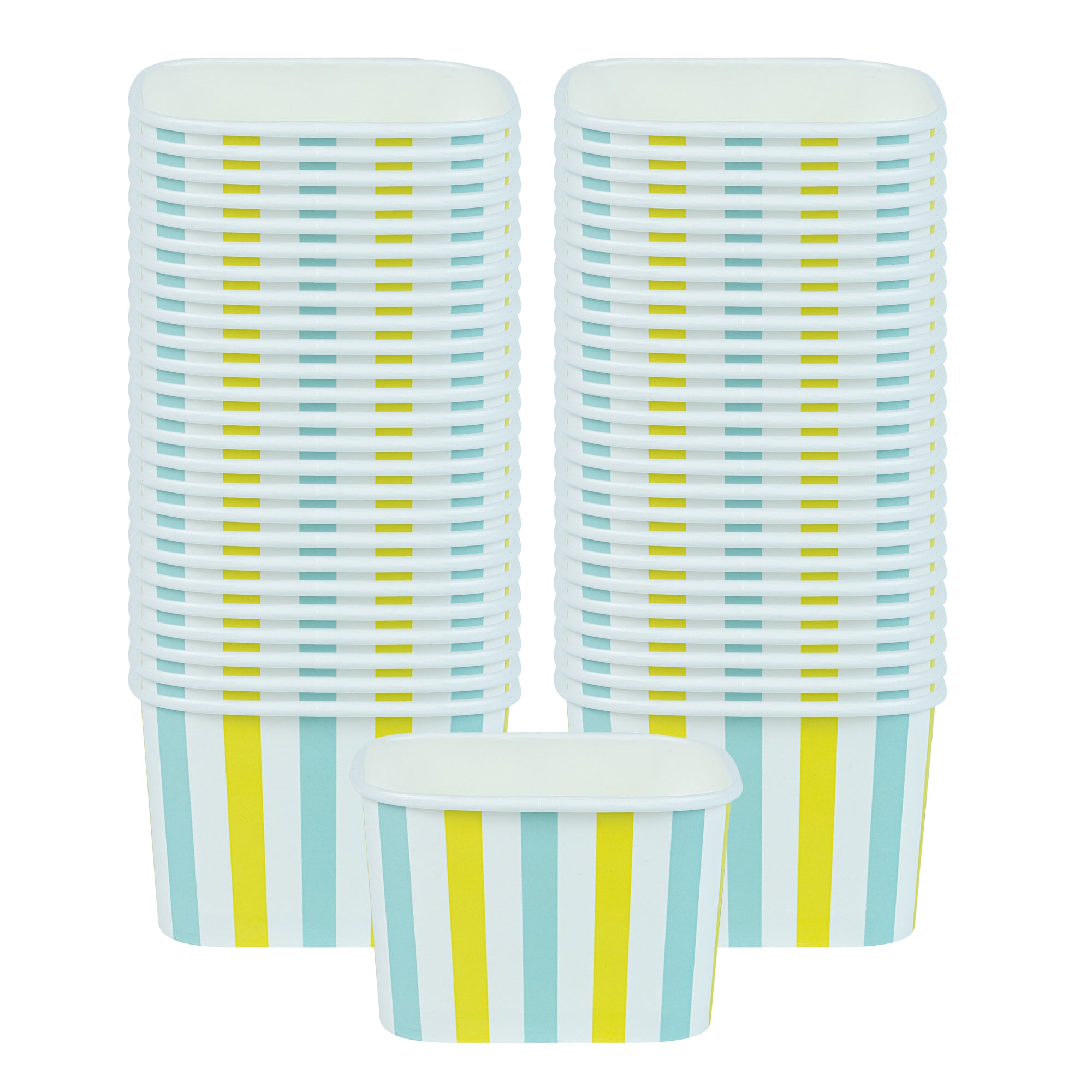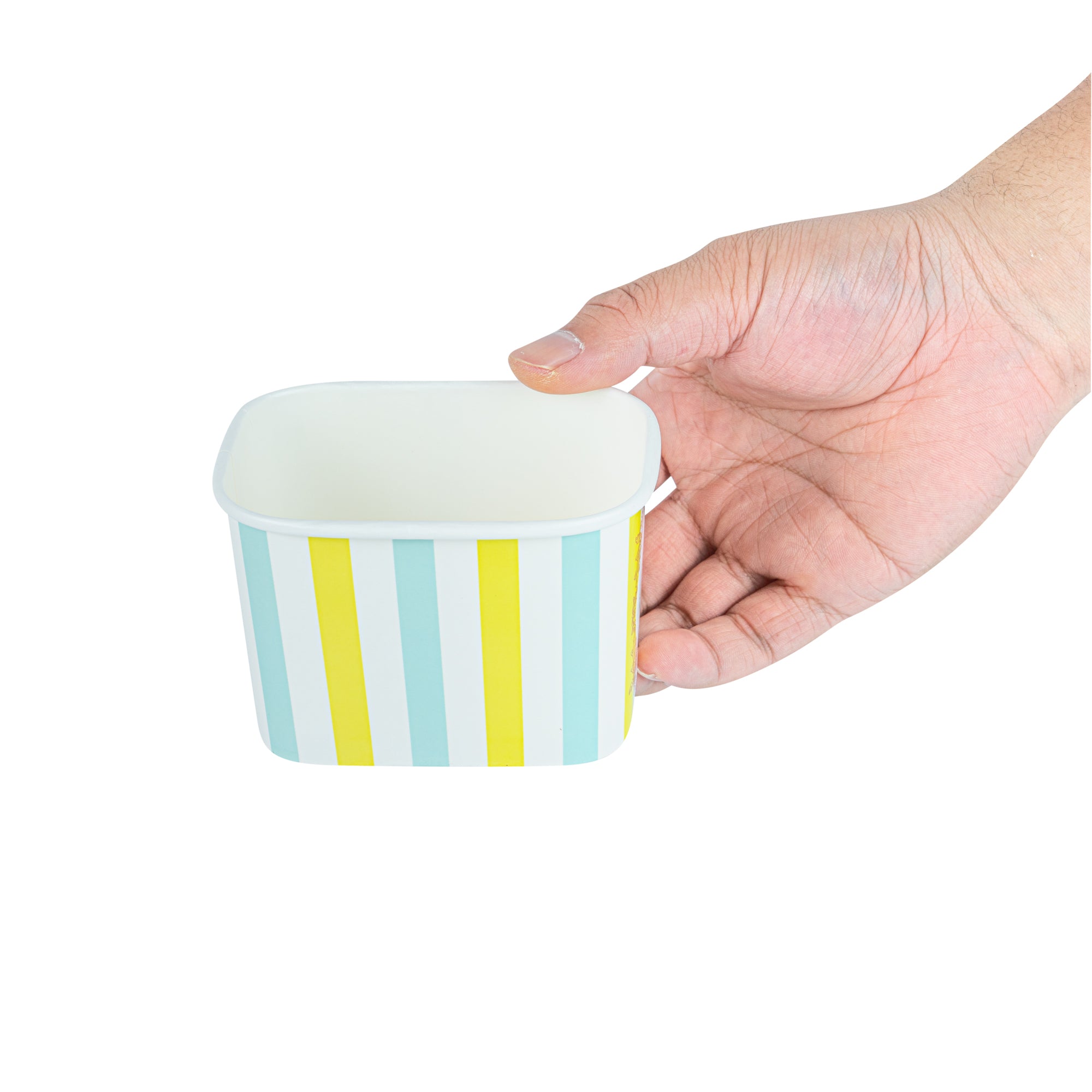 Enhance your foodservice presentation with our Coppetta 12-ounce Square Blue And Green Stripe Paper To Go Cups, designed to elevate the way you serve delectable treats. These square ice cream cups feature a grease-resistant PE lining that prevents oil from seeping through, ensuring a neat and appetizing presentation. Constructed from durable paper, these takeaway dessert cups are perfect for serving both hot and cold foods, offering versatility for your menu. With recyclable materials, these frozen yogurt paper cups provide an eco-friendly solution for environmentally-conscious businesses. A rolled rim on these to go cups allows them to securely hold coordinating lids (SKU: RWA1736W-50), making them ideal for on-the-go dining. The stylish blue and green stripes on these disposable cups add an upscale touch to your food presentation, enhancing the visual appeal of your offerings. These freezer-safe round ice cream cups let you conveniently store leftovers, maintaining freshness and quality. Measuring 4.21 inches in length by 3.23 inches in width by 2.68 inches in height, these versatile cups hold up to 12 ounces, making them a perfect fit for various servings. Sold in a 50 count box.