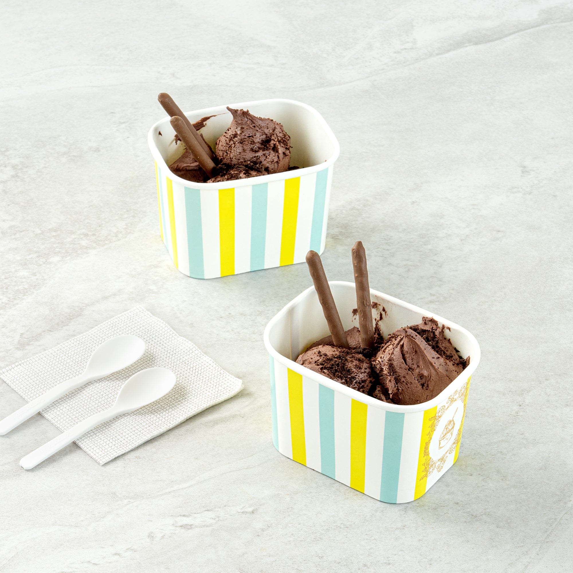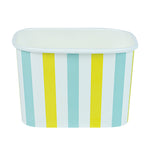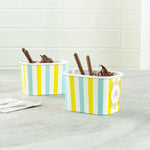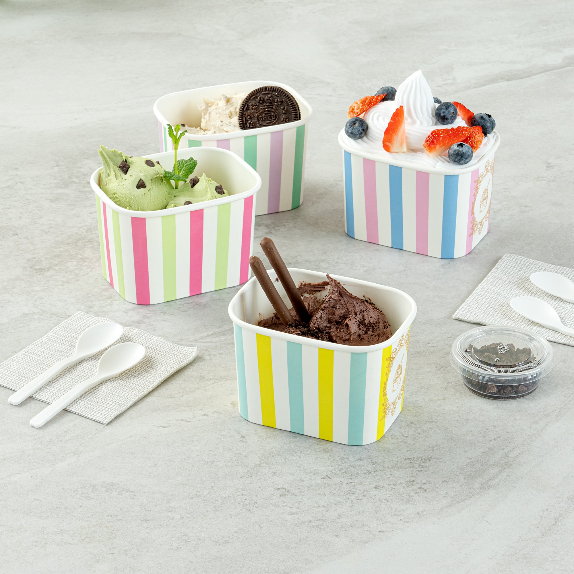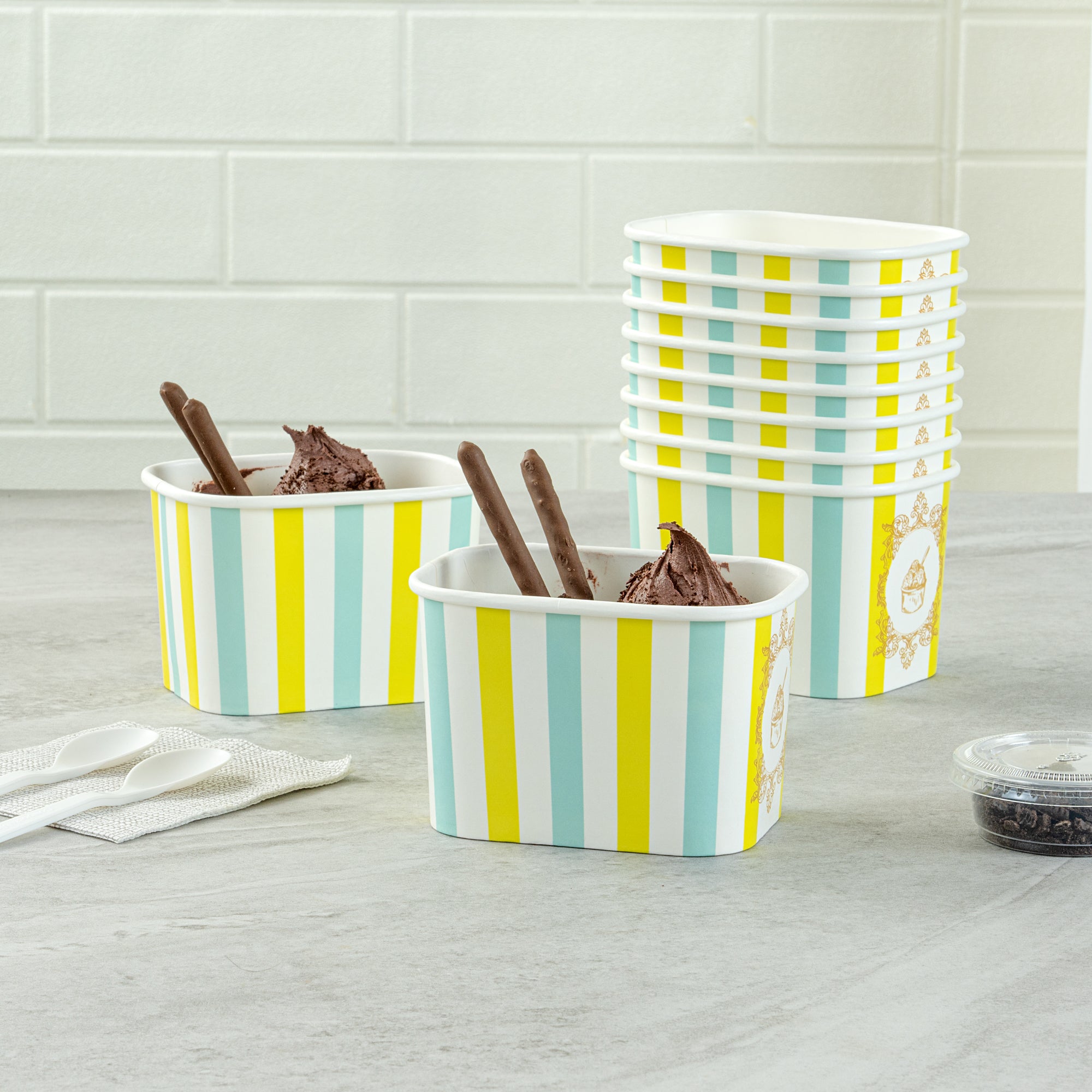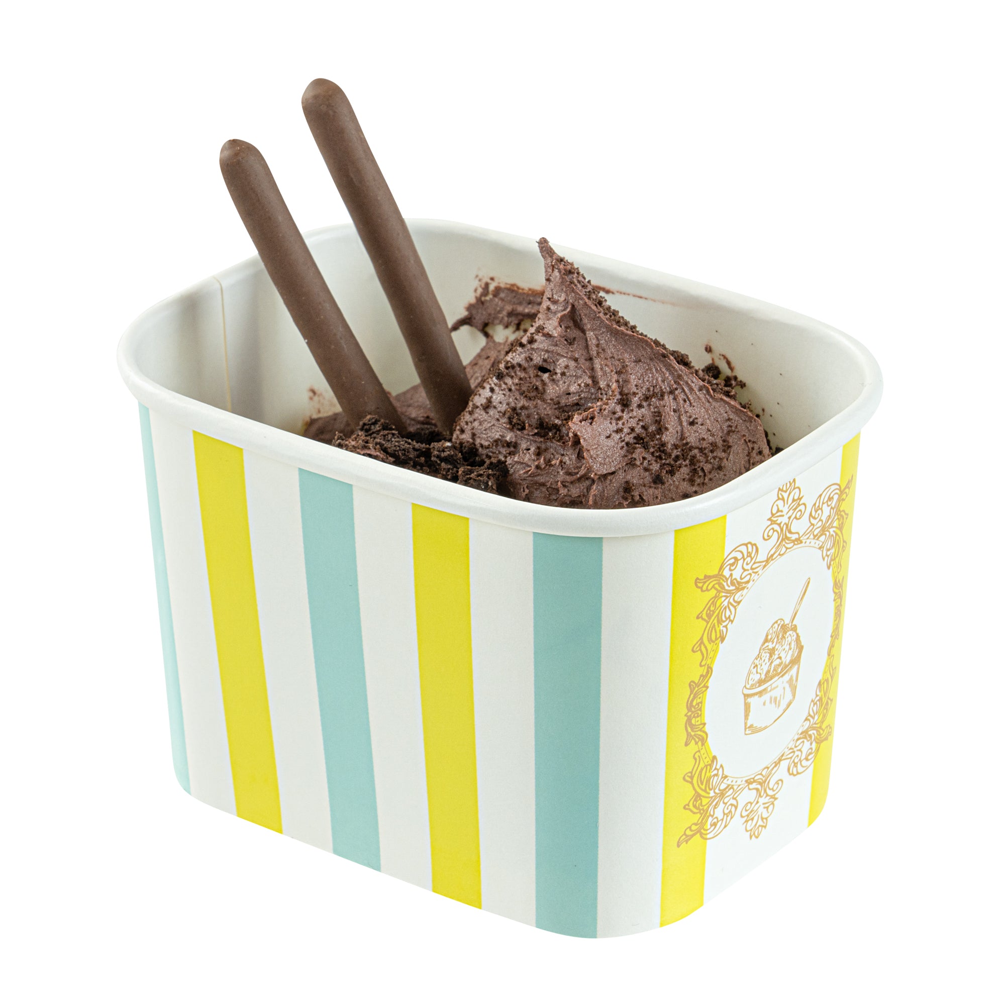 Enhance your foodservice presentation with our Coppetta 12-ounce Square Blue And Green Stripe Paper To Go Cups, designed to elevate the way you serve delectable treats. These square ice cream cups feature a grease-resistant PE lining that prevents oil from seeping through, ensuring a neat and appetizing presentation. Constructed from durable paper, these takeaway dessert cups are perfect for serving both hot and cold foods, offering versatility for your menu. With recyclable materials, these frozen yogurt paper cups provide an eco-friendly solution for environmentally-conscious businesses. A rolled rim on these to go cups allows them to securely hold coordinating lids (SKU: RWA1736W-50), making them ideal for on-the-go dining. The stylish blue and green stripes on these disposable cups add an upscale touch to your food presentation, enhancing the visual appeal of your offerings. These freezer-safe round ice cream cups let you conveniently store leftovers, maintaining freshness and quality. Measuring 4.21 inches in length by 3.23 inches in width by 2.68 inches in height, these versatile cups hold up to 12 ounces, making them a perfect fit for various servings. Sold in a 50 count box.