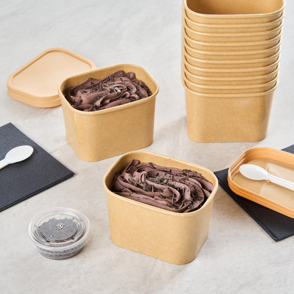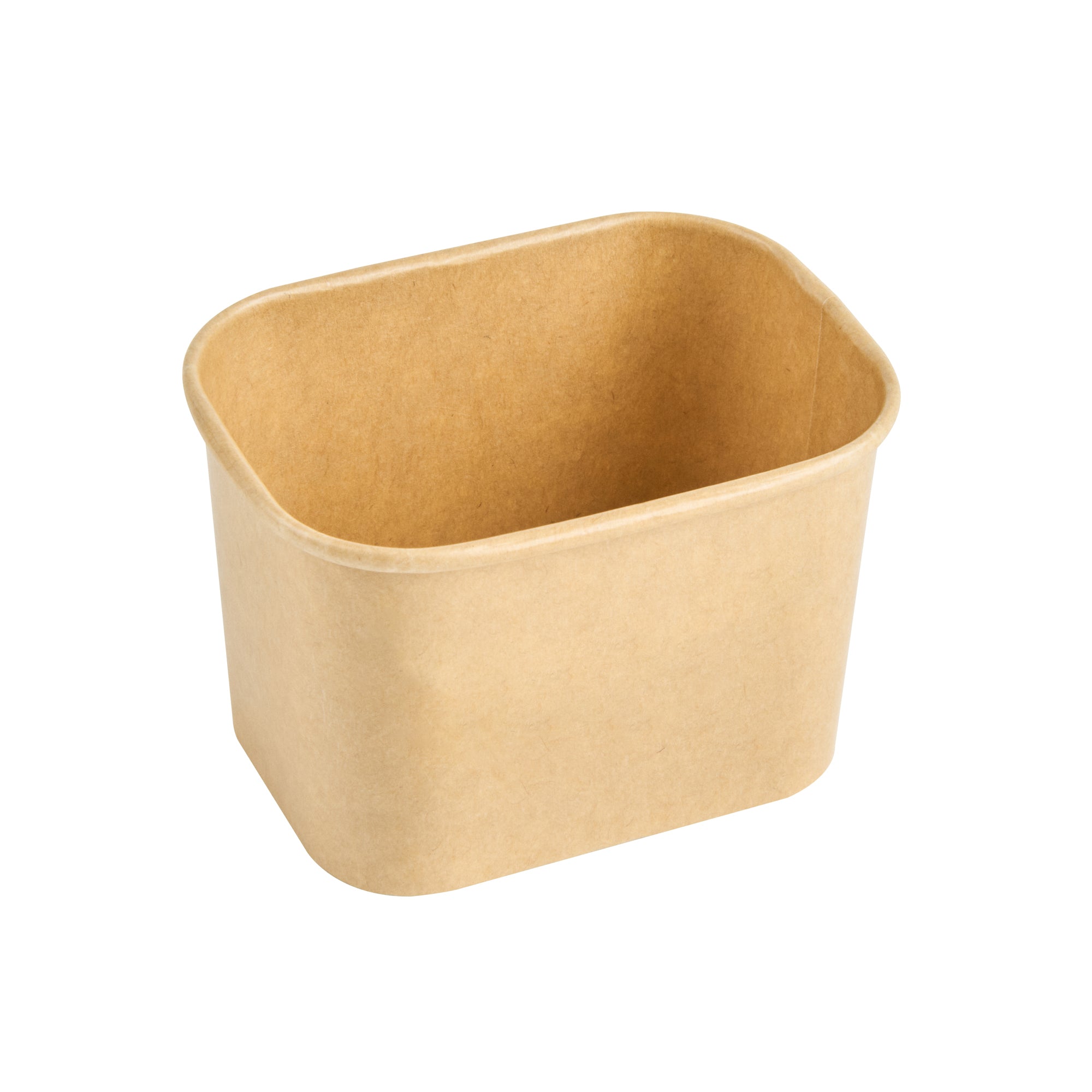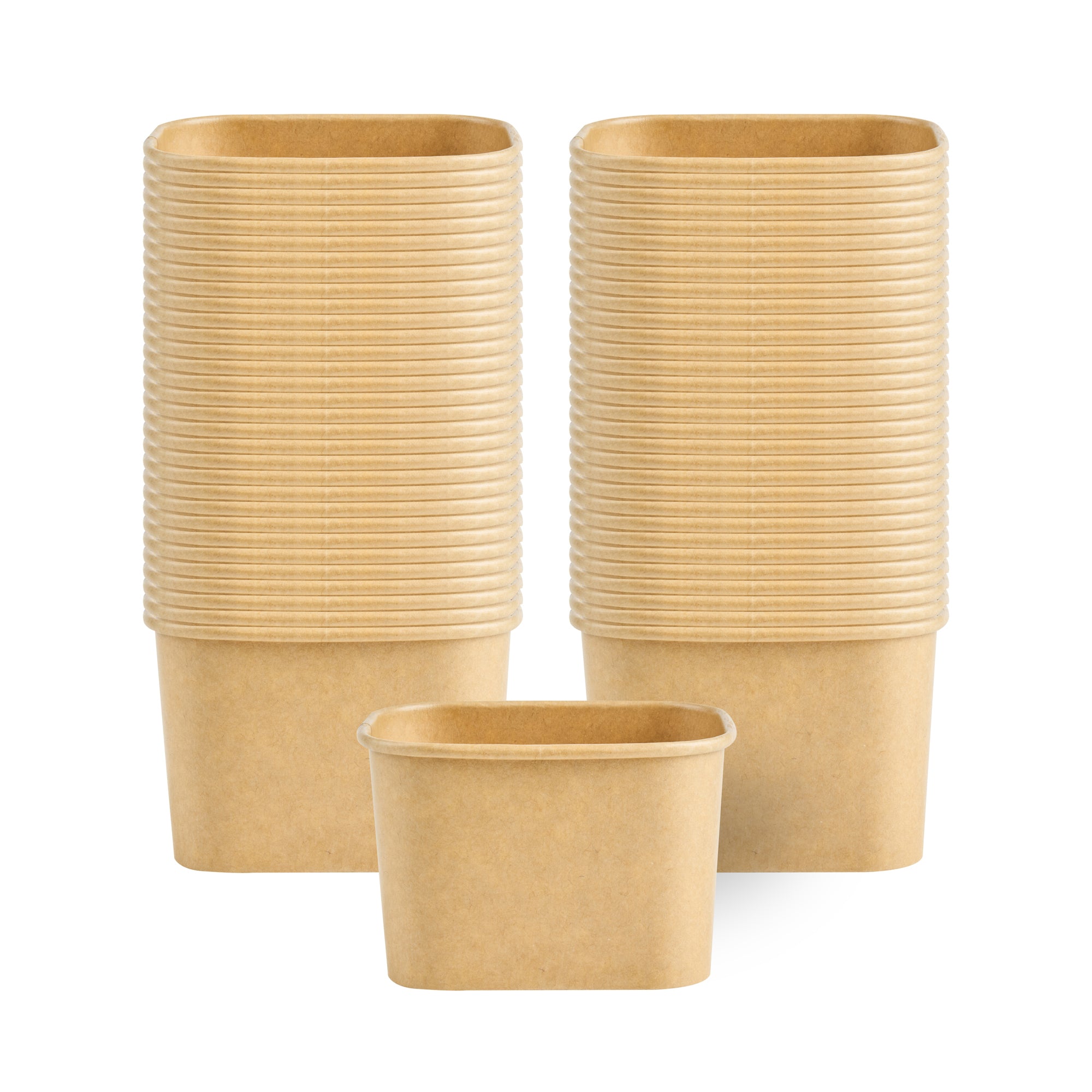 Enhance your food presentation with our Coppetta 12-ounce Square Kraft Paper To Go Cups. These takeaway dessert cups feature a grease-resistant PE lining to keep oil from seeping through, ensuring a neat and tidy display. Designed to handle both hot and cold foods, these durable kraft paper cups are perfect for any menu item. The recyclable convenience of these disposable cups offers an eco-friendly choice for serving and presenting meals. With a rolled rim, these square ice cream cups securely hold coordinating lids (SKU: RWA1736W) for easy transportation. The natural kraft finish of these to go cups adds a rustic charm, ideal for soups, frozen yogurts, or fresh fruit salads. These freezer-safe cups allow you to refrigerate leftovers without compromising quality. Measuring 4.21 inches in length by 3.23 inches in width by 2.68 inches in height, these kraft paper cups have a 12-ounce capacity to accommodate generous portions. Sold in a 50 count box.