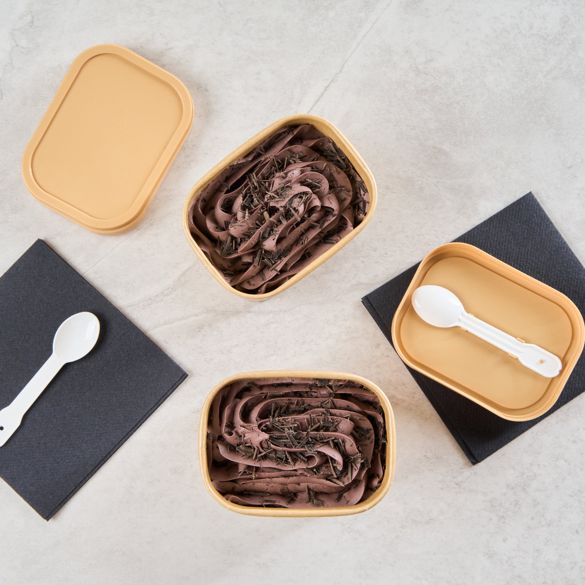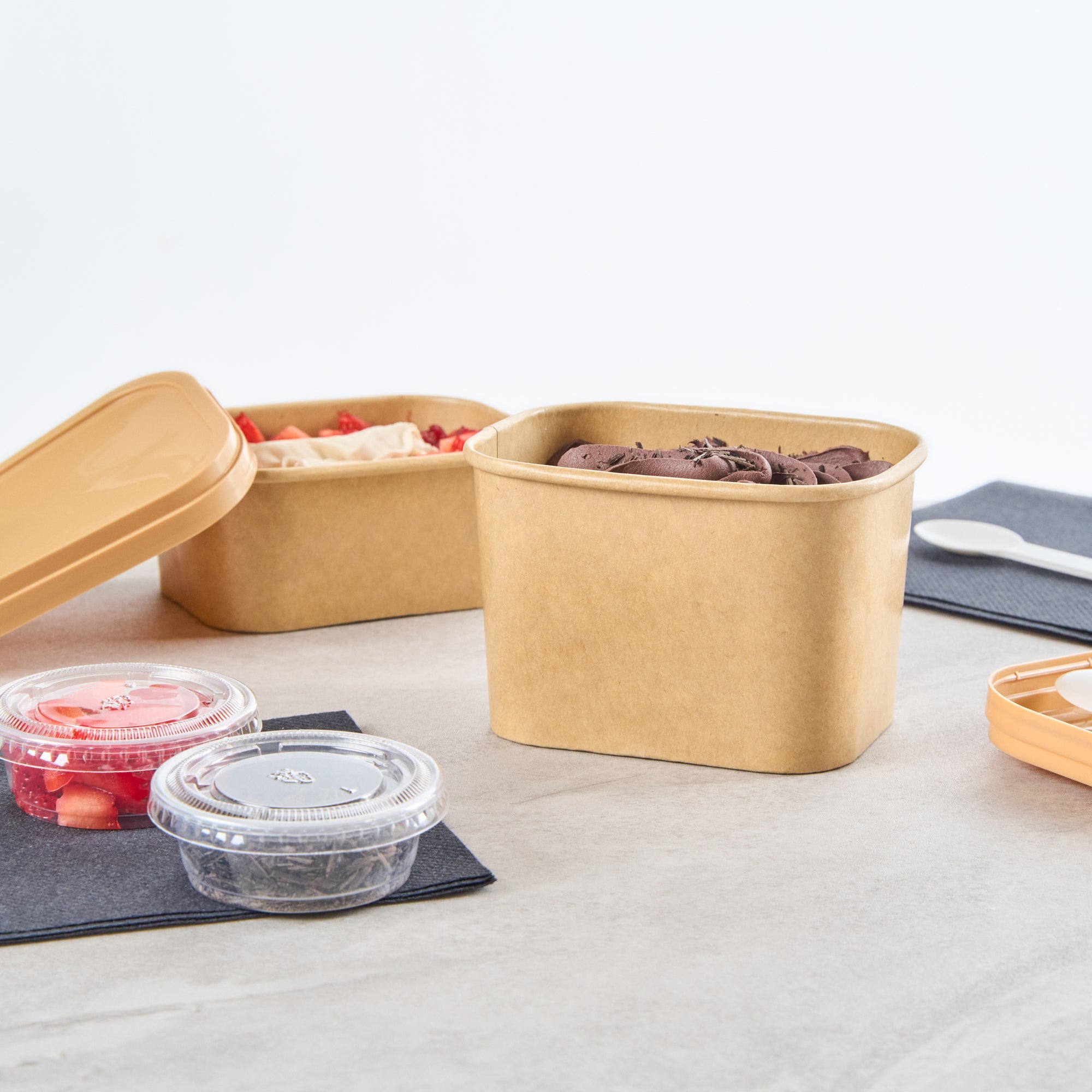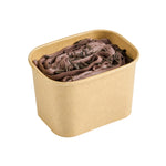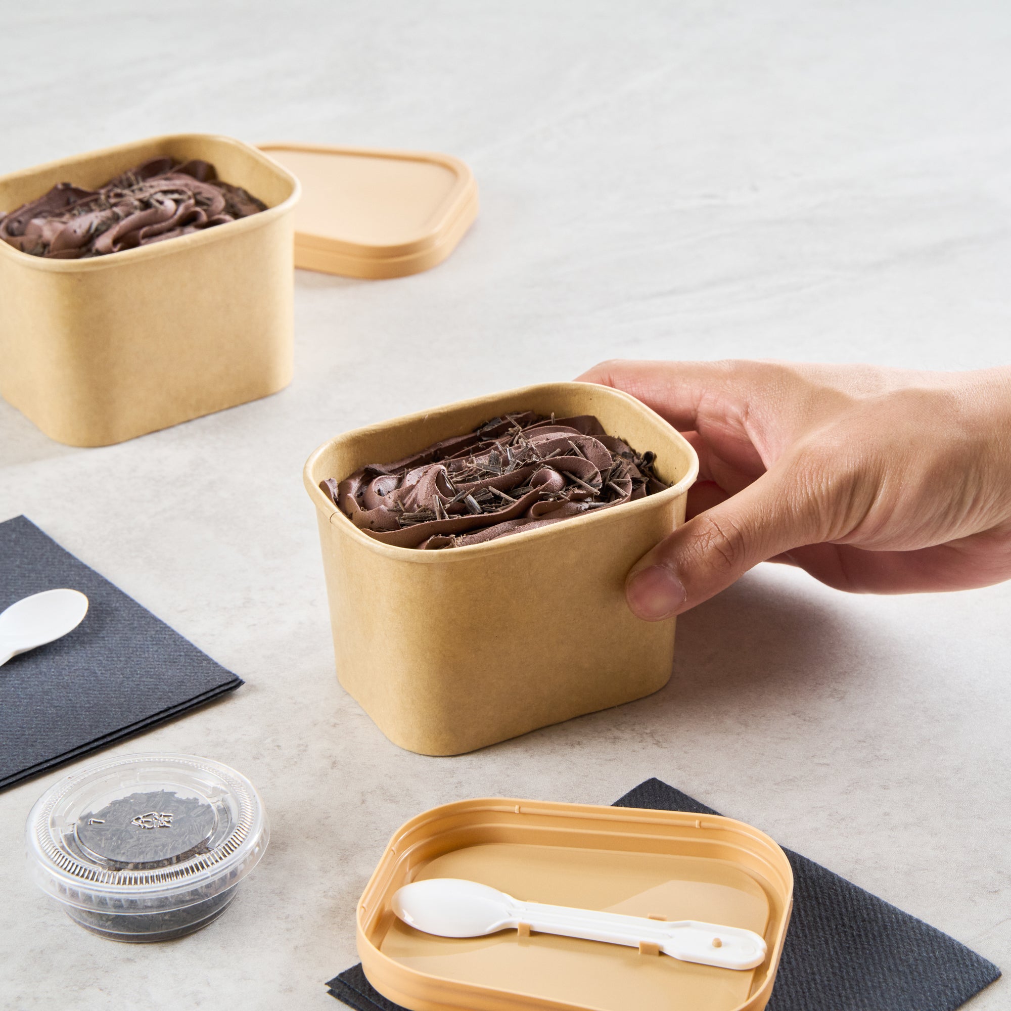Enhance your food presentation with our Coppetta 12-ounce Square Kraft Paper To Go Cups. These takeaway dessert cups feature a grease-resistant PE lining to keep oil from seeping through, ensuring a neat and tidy display. Designed to handle both hot and cold foods, these durable kraft paper cups are perfect for any menu item. The recyclable convenience of these disposable cups offers an eco-friendly choice for serving and presenting meals. With a rolled rim, these square ice cream cups securely hold coordinating lids (SKU: RWA1736W) for easy transportation. The natural kraft finish of these to go cups adds a rustic charm, ideal for soups, frozen yogurts, or fresh fruit salads. These freezer-safe cups allow you to refrigerate leftovers without compromising quality. Measuring 4.21 inches in length by 3.23 inches in width by 2.68 inches in height, these kraft paper cups have a 12-ounce capacity to accommodate generous portions. Sold in a 50 count box.
