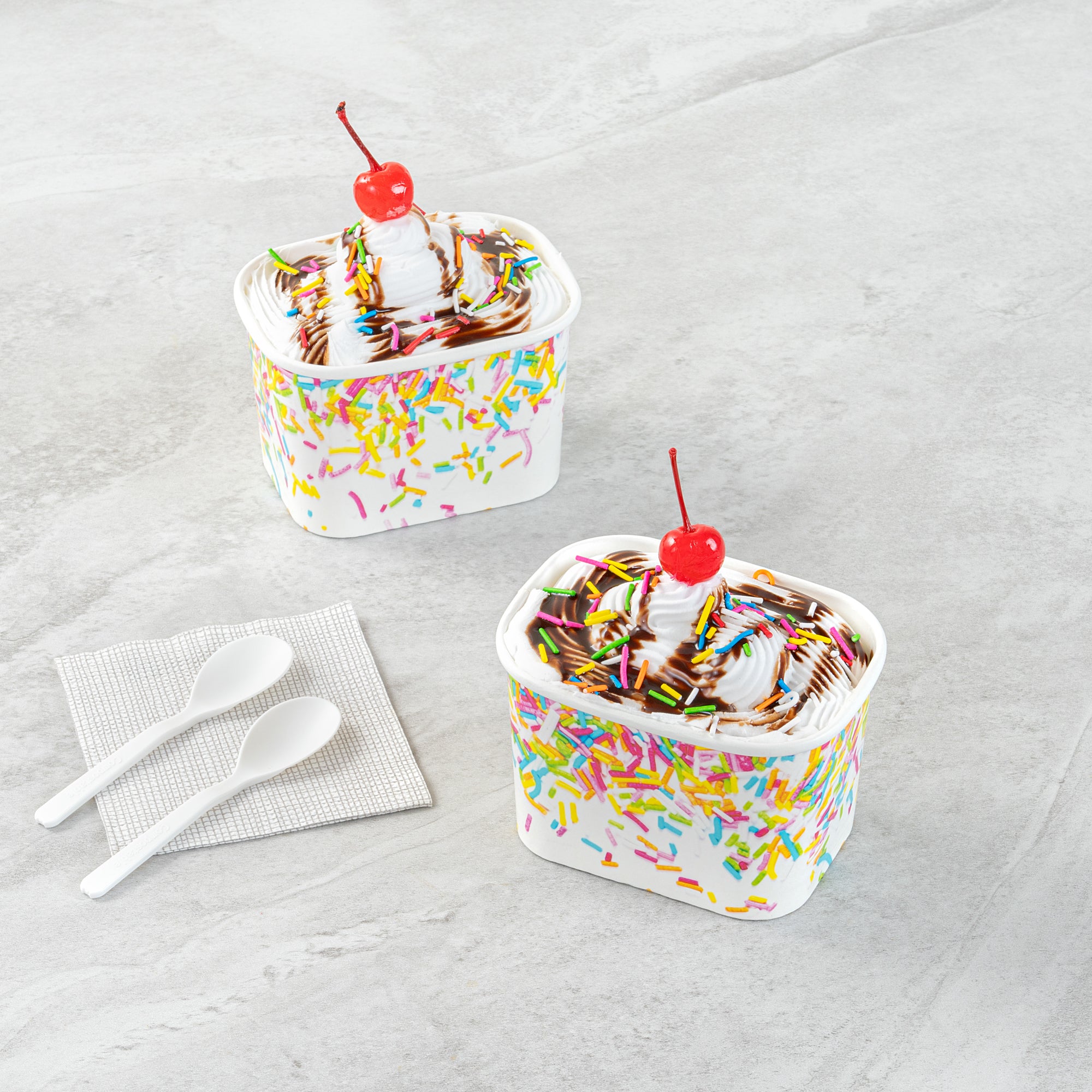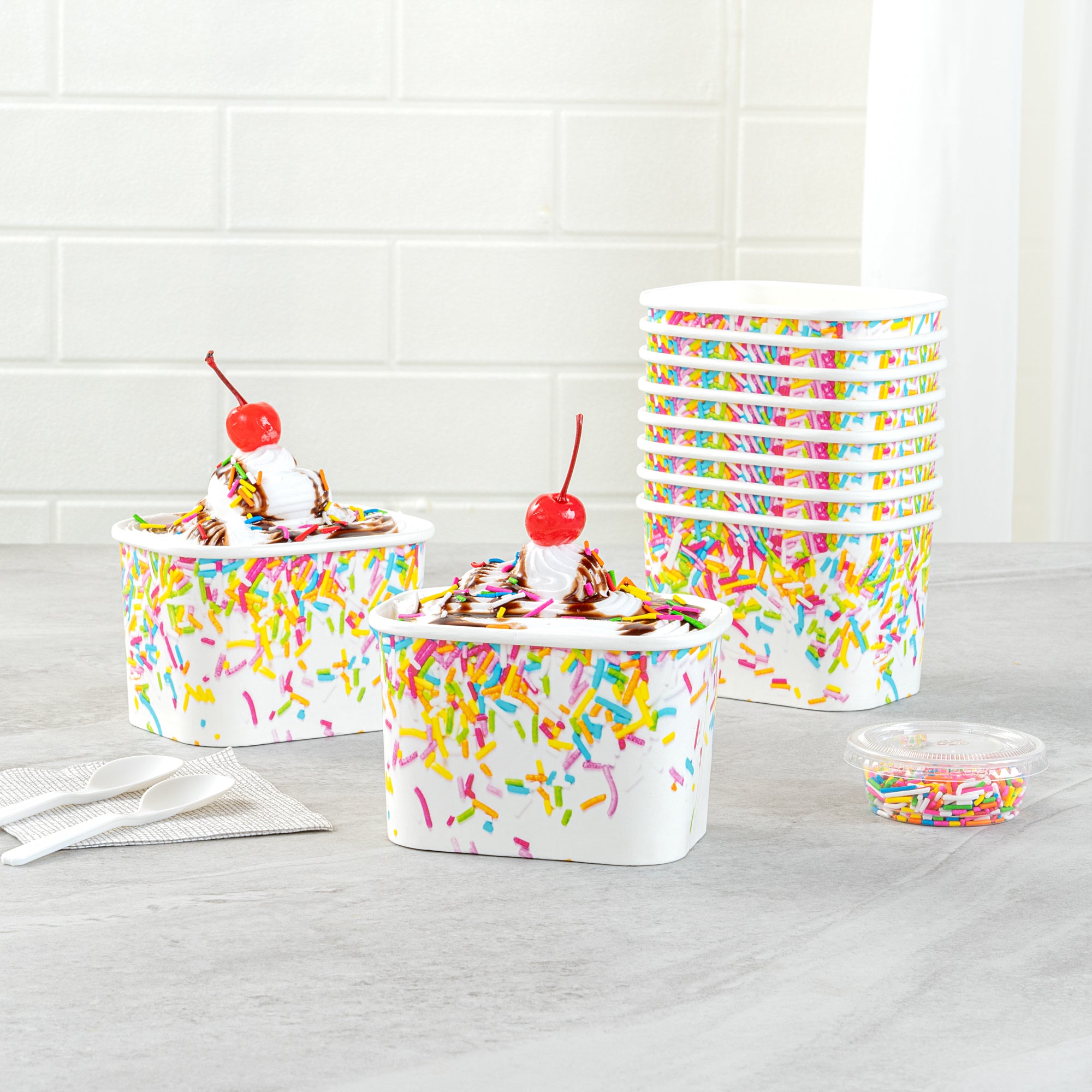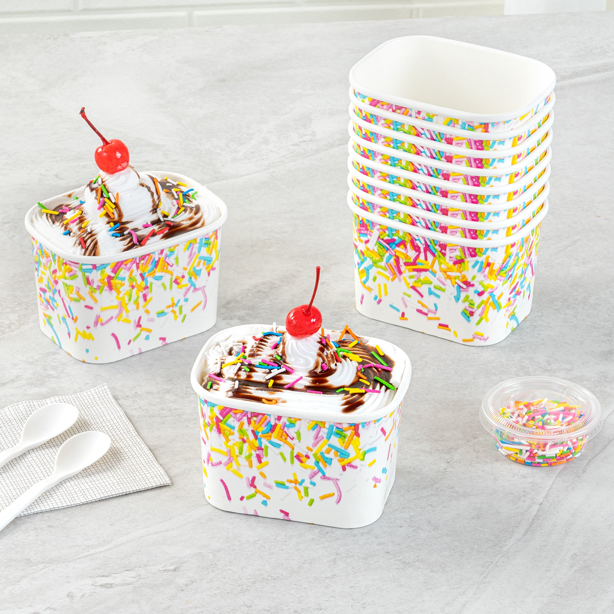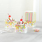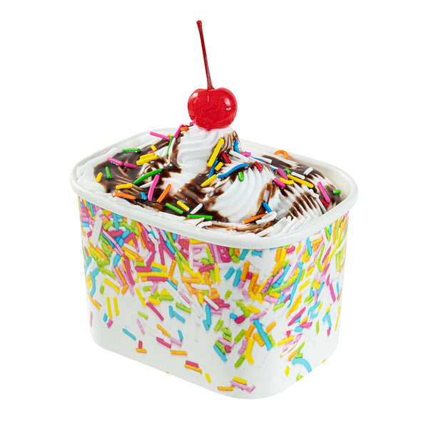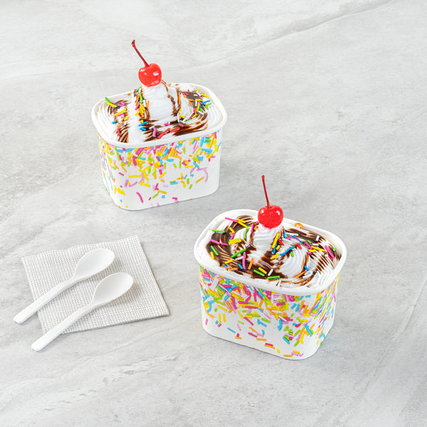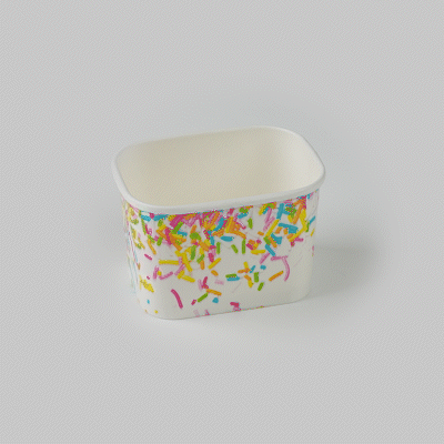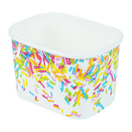 Enhance dessert presentations with festive flair. The Coppetta Leak-Resistant Paper Cup features a vibrant party sprinkles pattern and a square design, perfect for adding a cheerful touch to any dessert offering. With a 12-ounce capacity, this disposable ice cream cup accommodates generous portions of ice cream, frozen yogurt, or fruit salads, making it an ideal choice for busy ice cream parlors. Its double-coated design prevents leaks, ensuring durability when serving both hot and cold foods like soups or macaroni, making it a versatile addition to your menu. The paper construction is grease-resistant, maintaining a clean presentation and reducing mess, perfect for catering events. Plus, its recyclable nature supports eco-friendly practices, a growing demand in the foodservice industry. Elevate your takeout options and delight customers with this leak-resistant dessert cup that measures 4.25 inches by 3.25 inches by 2.75 inches. Each order includes 50 Coppetta Paper Cups.