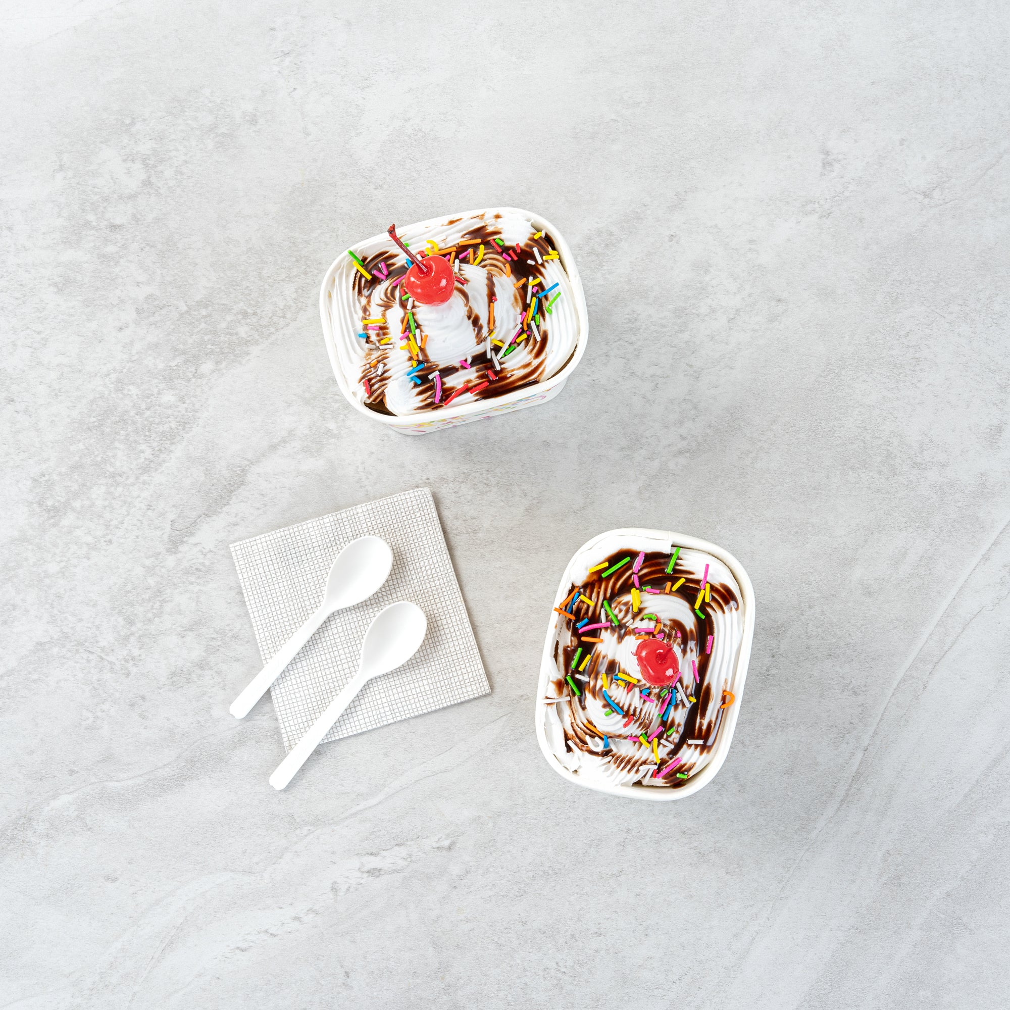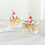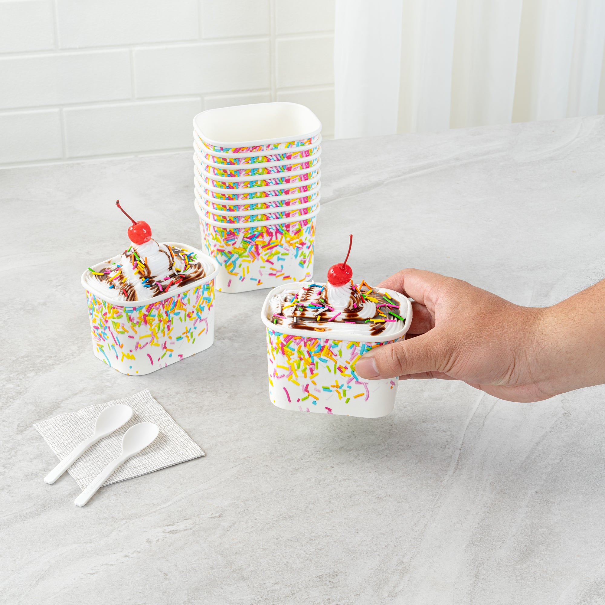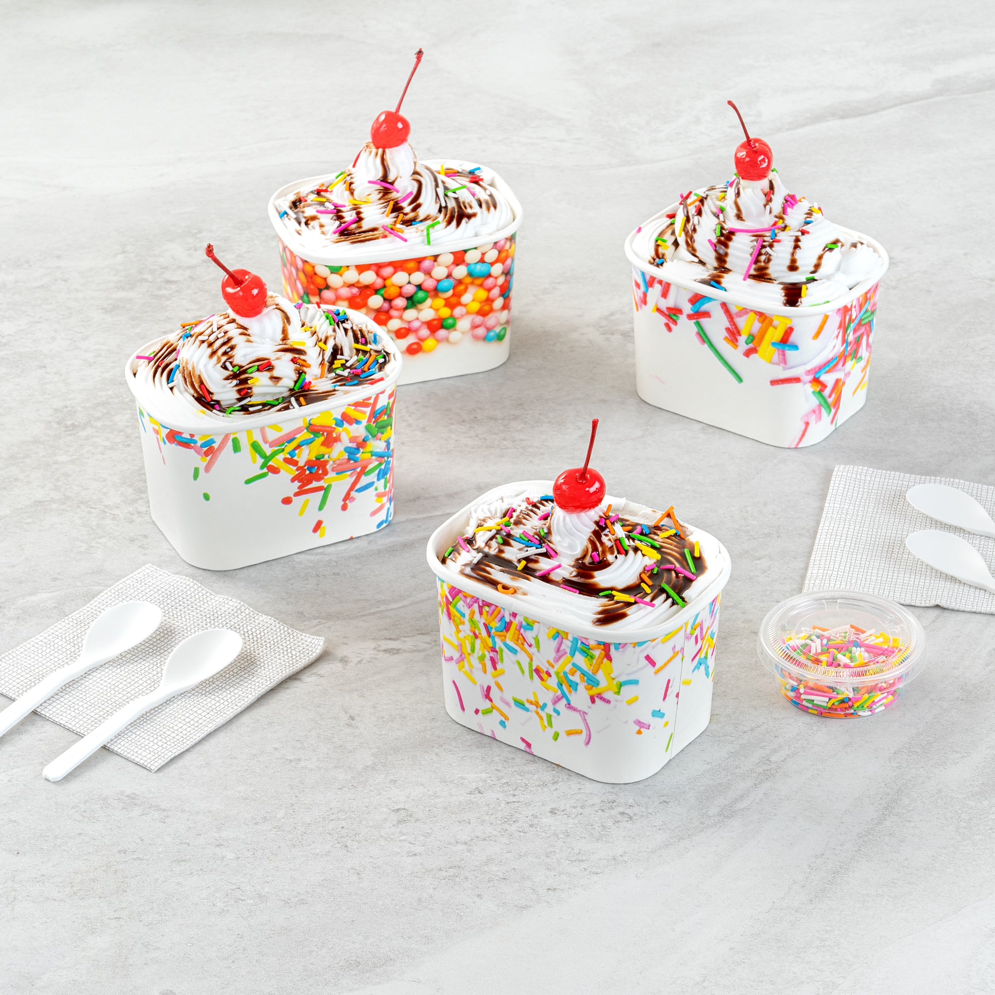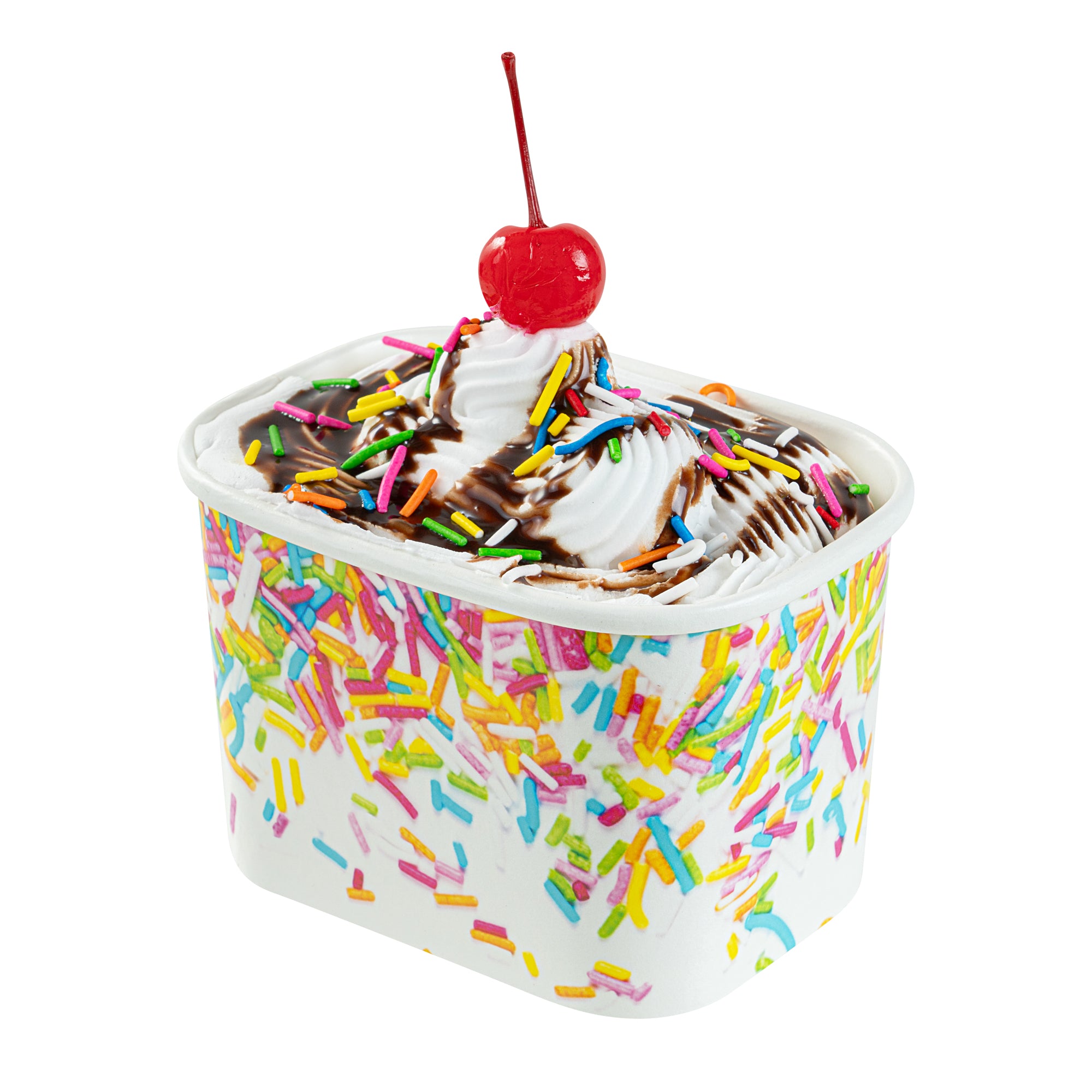 Enhance dessert presentations with festive flair. The Coppetta Leak-Resistant Paper Cup features a vibrant party sprinkles pattern and a square design, perfect for adding a cheerful touch to any dessert offering. With a 12-ounce capacity, this disposable ice cream cup accommodates generous portions of ice cream, frozen yogurt, or fruit salads, making it an ideal choice for busy ice cream parlors. Its double-coated design prevents leaks, ensuring durability when serving both hot and cold foods like soups or macaroni, making it a versatile addition to your menu. The paper construction is grease-resistant, maintaining a clean presentation and reducing mess, perfect for catering events. Plus, its recyclable nature supports eco-friendly practices, a growing demand in the foodservice industry. Elevate your takeout options and delight customers with this leak-resistant dessert cup that measures 4.25 inches by 3.25 inches by 2.75 inches. Each order includes 50 Coppetta Paper Cups.