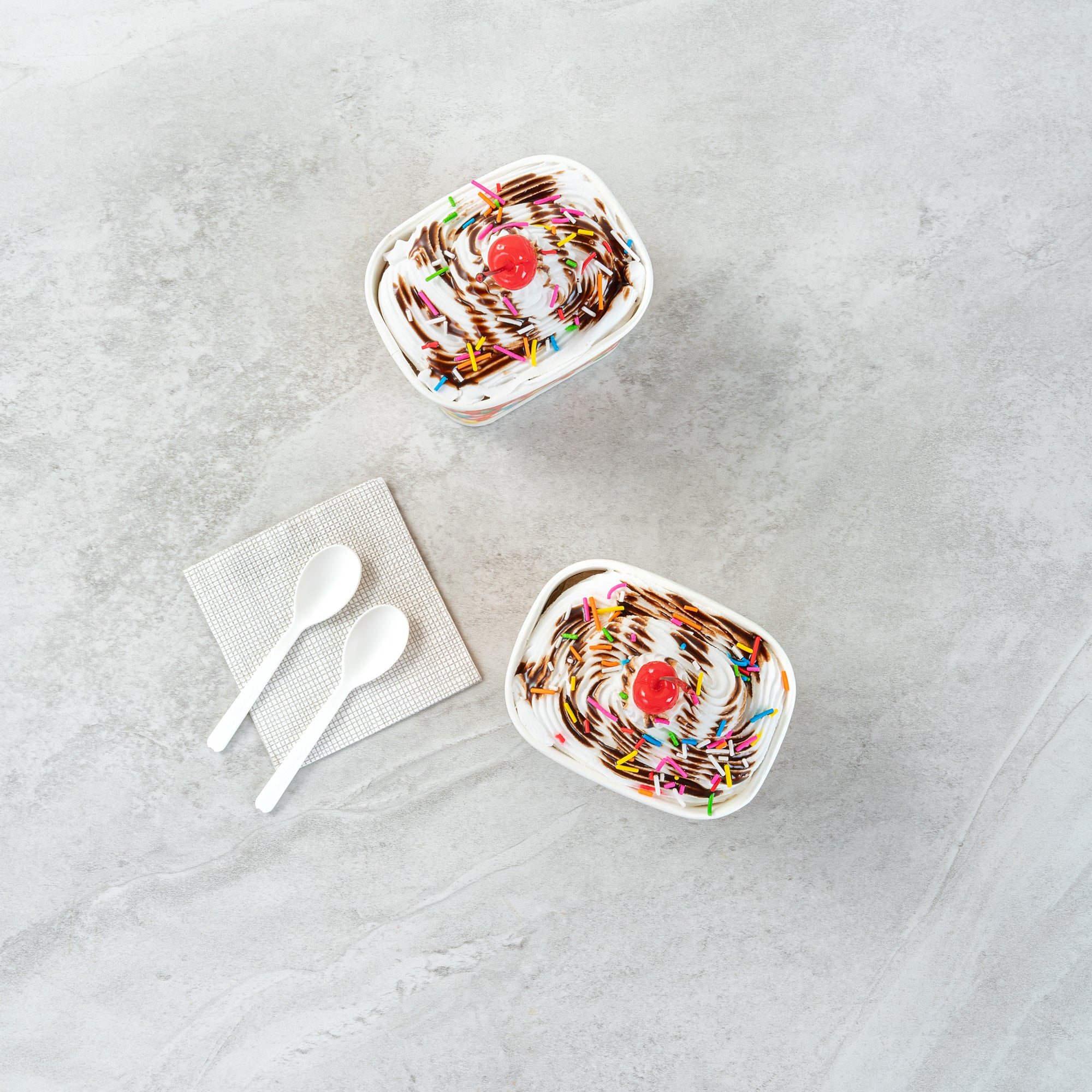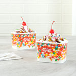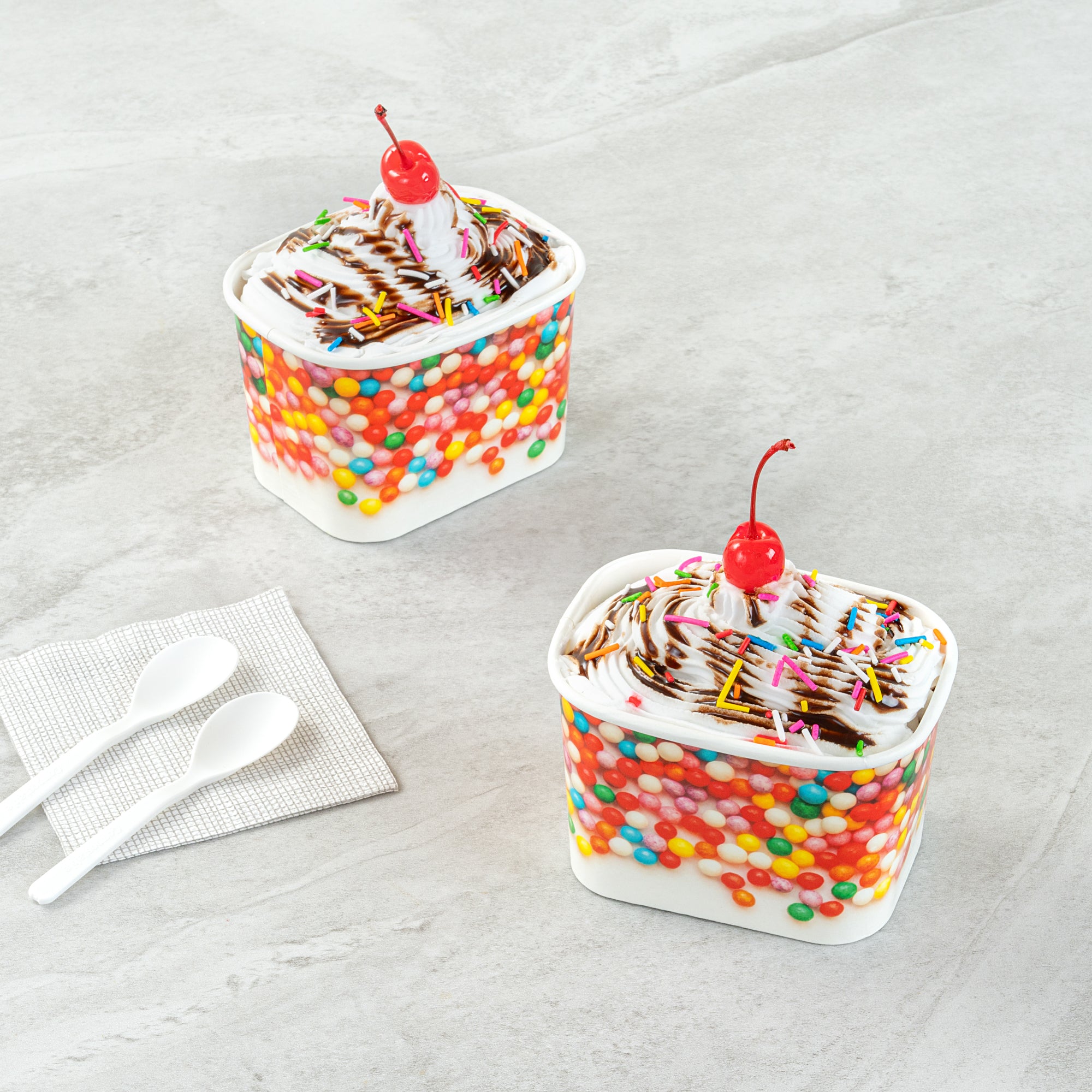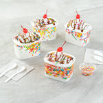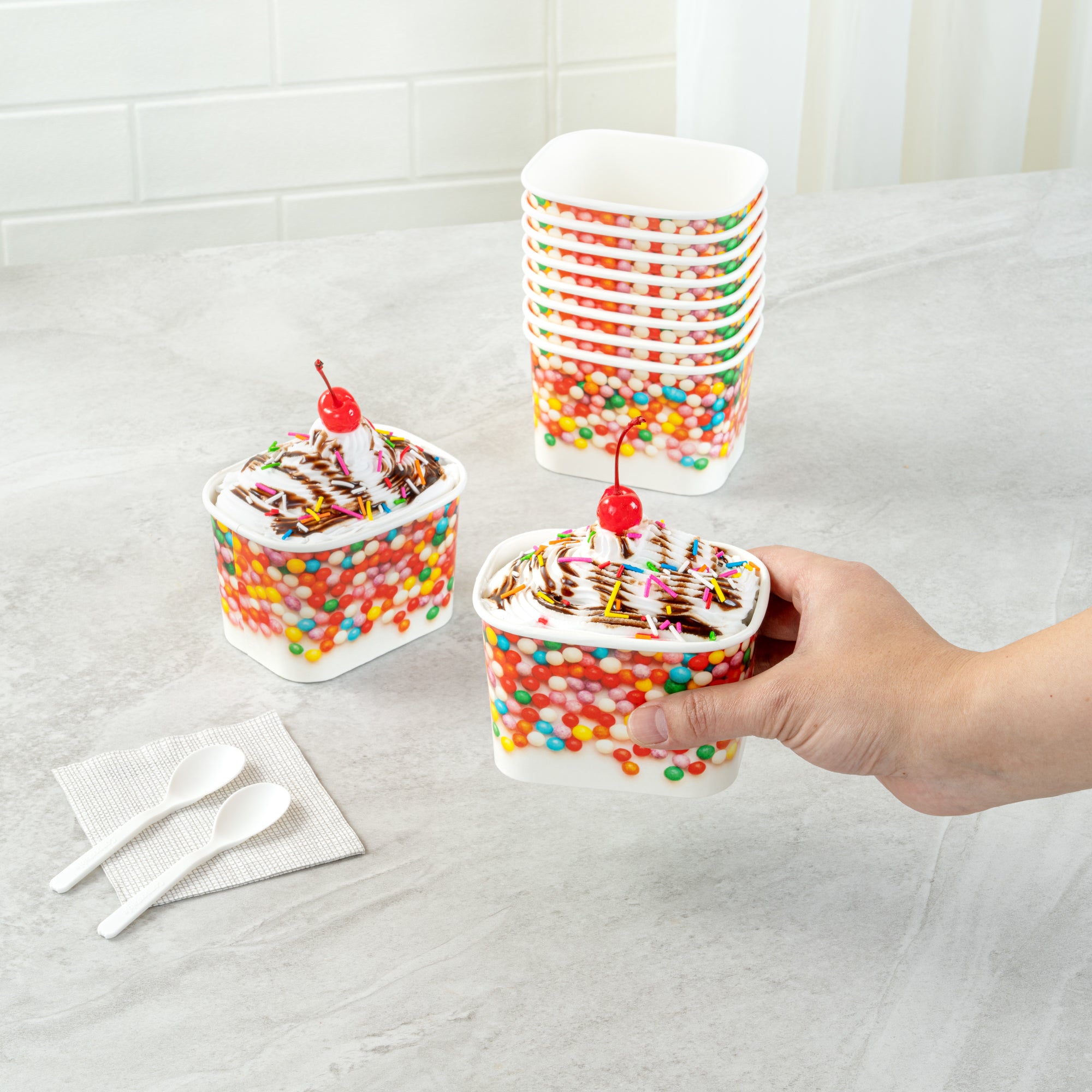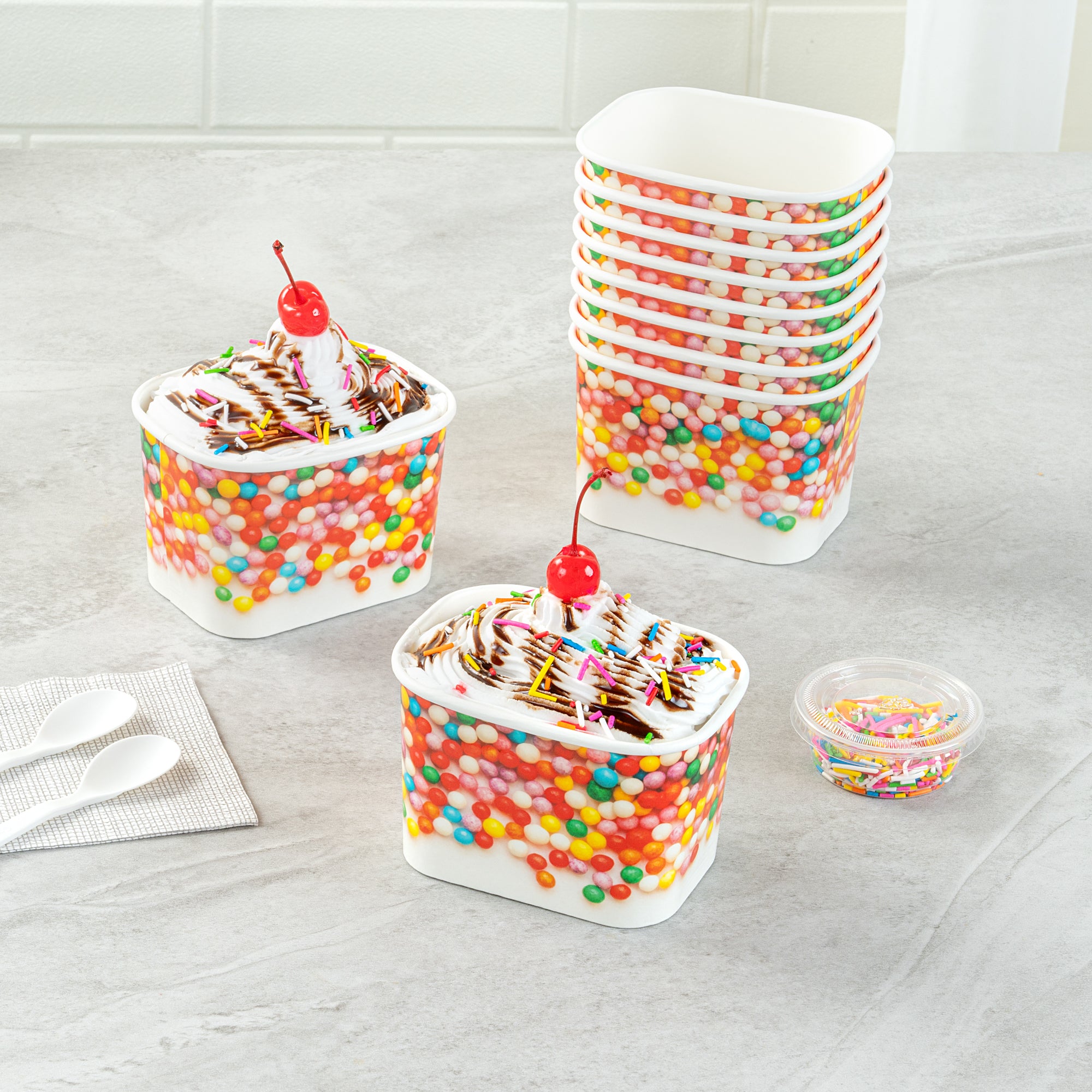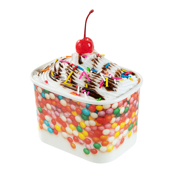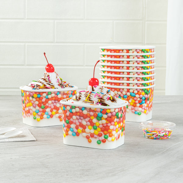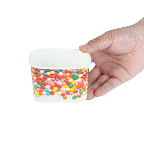 Elevate your food presentation with our Coppetta 12-ounce Square Paper To Go Cups, designed to impress with their stylish and functional features. These square ice cream cups boast a grease-resistant PE lining that ensures neat food presentation by preventing oil from seeping through. Made from durable paper, these takeaway dessert cups are perfect for serving both hot and cold foods, providing versatility for any menu item. The recyclable convenience of these frozen yogurt paper cups offers an eco-friendly solution for your foodservice needs. With a rolled rim, these to go cups securely hold coordinating lids (SKU: RWA1736W-50), making them ideal for transporting your culinary creations. The round sprinkles on these disposable cups add a touch of class, enhancing the upscale appearance of your frozen dessert offerings. Freezer-safe design allows these cups to securely store and refrigerate leftovers without compromising quality. Measuring 4.21 inches in length by 3.23 inches in width by 2.68 inches in height, these paper cups provide ample space with a 12-ounce capacity for generous servings. Sold in a 50 count box.