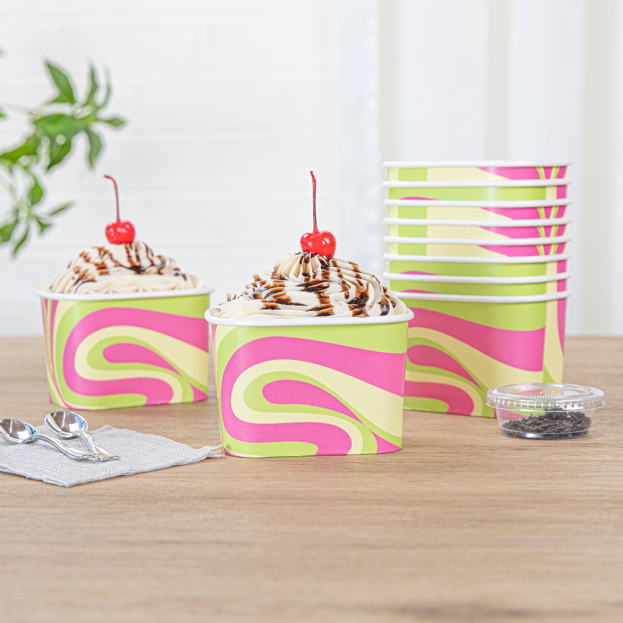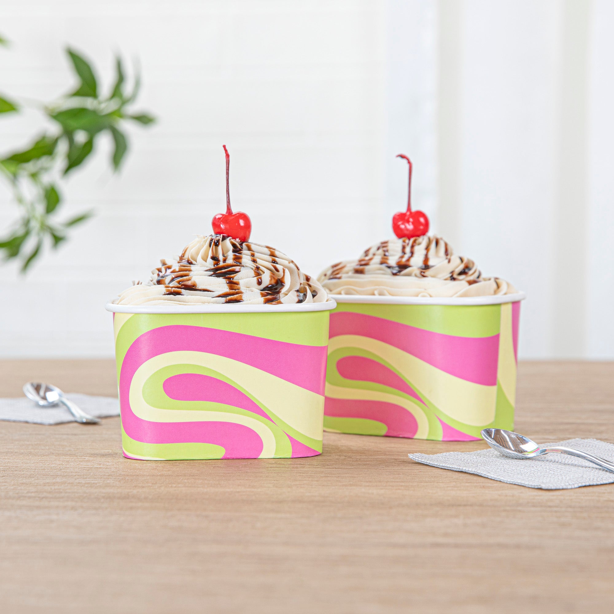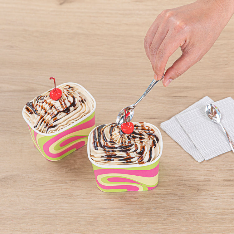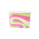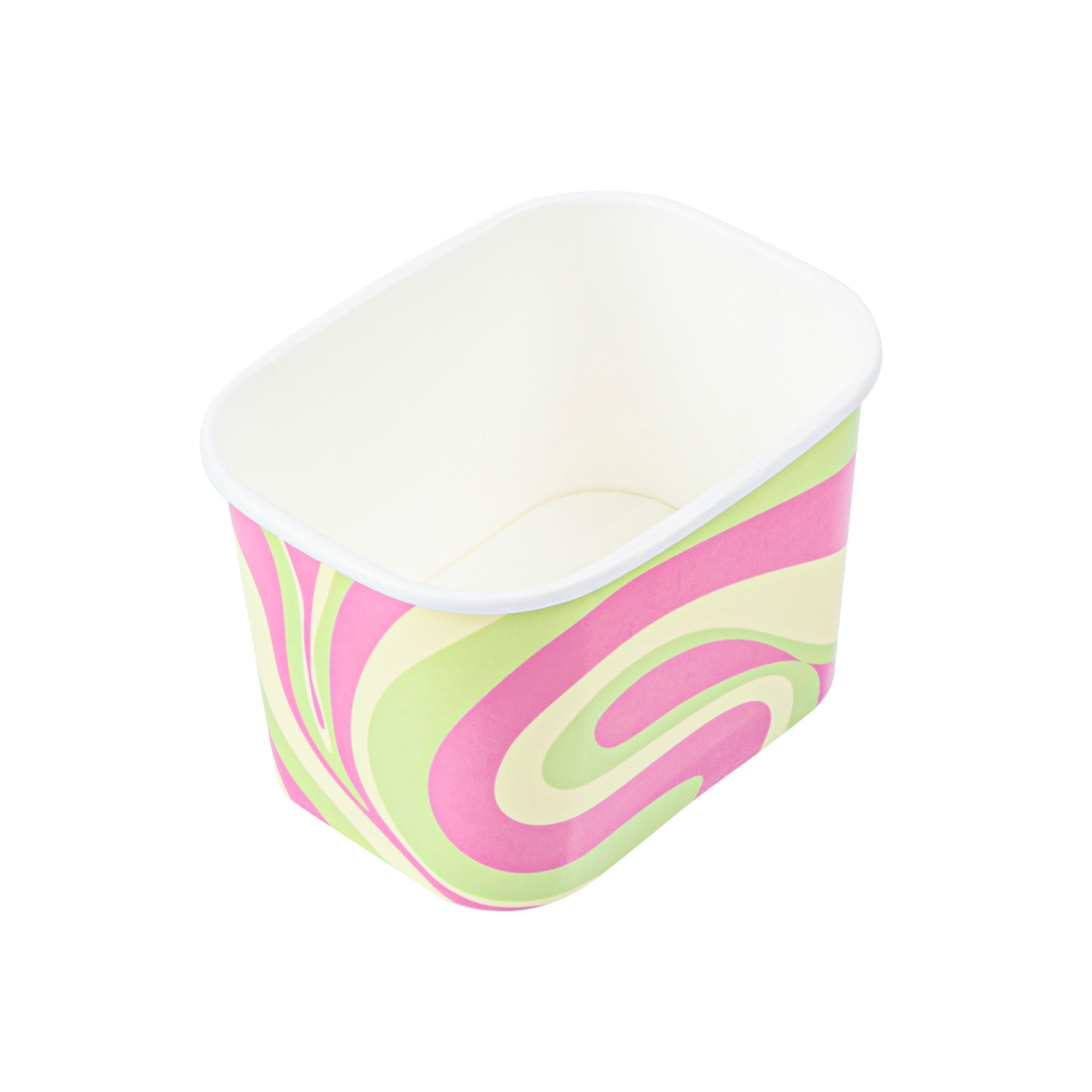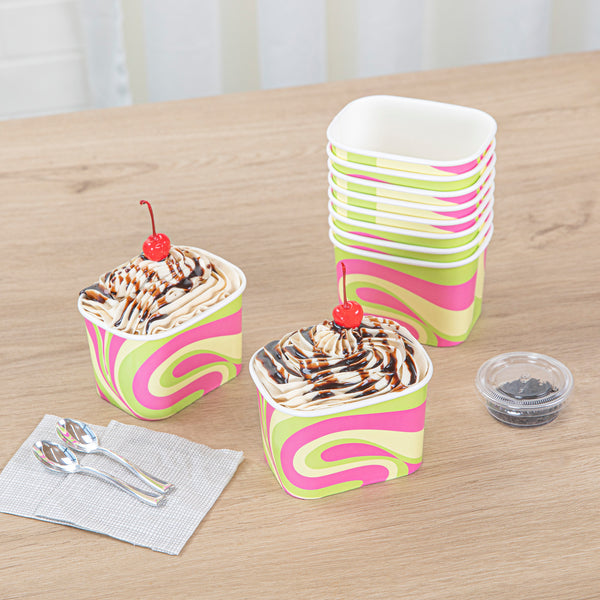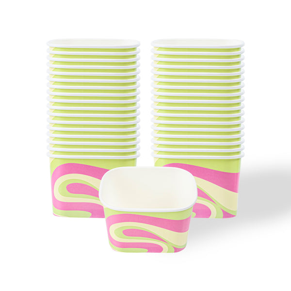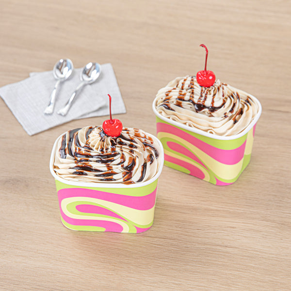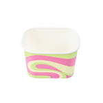 Deliver an upscale dining experience with our Coppetta 12-ounce Square Pastel Groove Paper To Go Cups, designed to enhance food presentation while maintaining practicality. These square ice cream cups feature a grease-resistant PE lining, ensuring that oil doesn't seep through and spoil the neat presentation of your delectable treats. Crafted from durable paper, these takeaway dessert cups are perfect for serving both hot and cold foods, making them an ideal choice for versatile foodservice operations. Opt for these recyclable frozen yogurt paper cups to provide an eco-friendly solution for your food-serving needs. Equipped with a rolled rim, these to go cups securely hold coordinating lids (SKU: RWA1736W), helping you take your delicious creations on the move effortlessly. The pastel groove design adds a sophisticated touch, elevating the visual appeal of any dessert or treat served in these premium paper frozen dessert cups. Being freezer-safe, these disposable cups allow you to conveniently refrigerate leftovers without compromising quality. Each cup boasts a generous capacity of 12 ounces and measures 4.21 inches in length by 3.23 inches in width by 2.68 inches in height, making them perfectly sized for a variety of servings. Sold in a 50 count box.