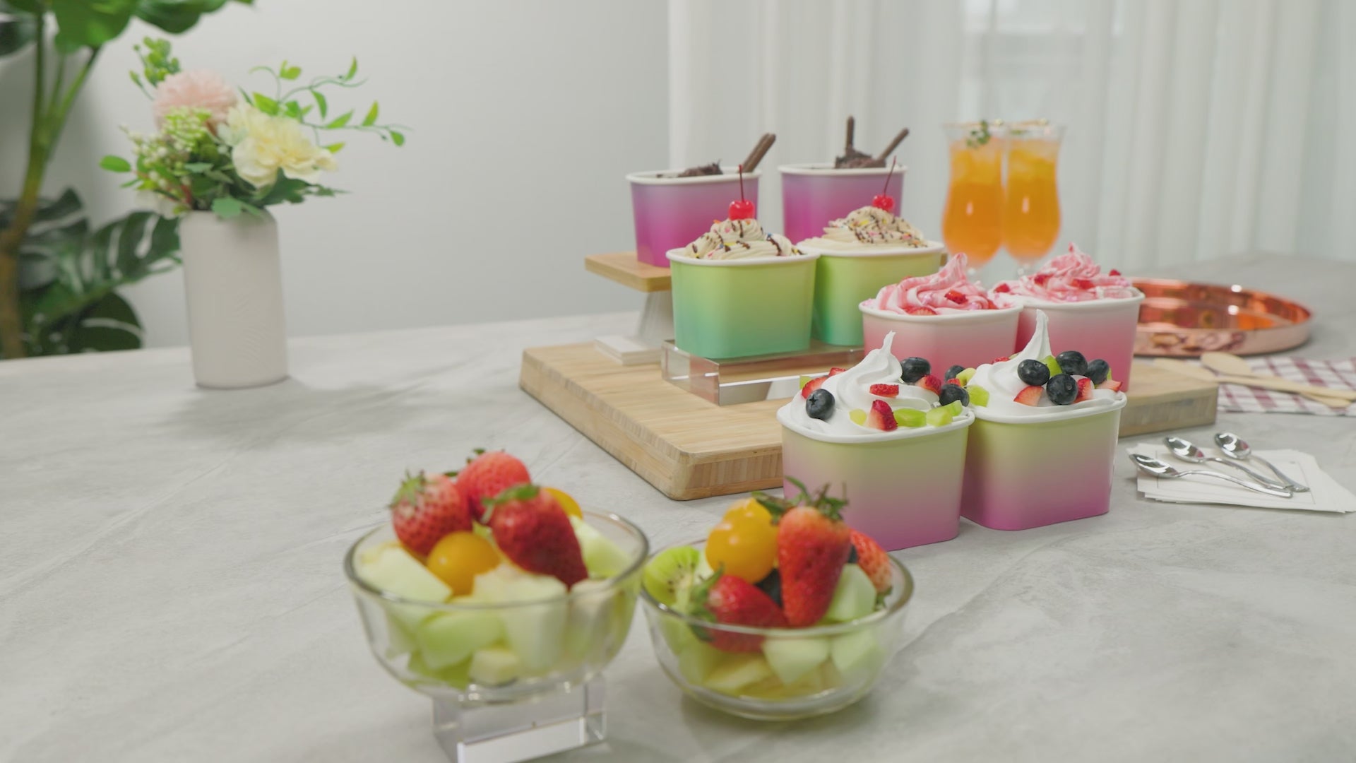 Ensure flawless dessert presentations with disposable ice cream containers. The Coppetta Leak-Resistant Paper Ice Cream Container boasts a robust paper construction with a waterproof coating, preventing leaks and maintaining structural integrity for clean serving. Its versatile design accommodates both cold desserts, like gelato and frozen yogurt, and hot foods, such as soups and pasta, making it a reliable paper to go cup for any menu. The container's square shape, highlighted by a striking purple and blue ombre design, not only enhances the visual appeal of desserts but also adds a modern touch to any ice cream parlor or café display. With a generous 12-ounce capacity and dimensions of 4.25 inches by 3.25 inches by 2.75 inches, it is perfect for serving generous portions of delicious treats. Additionally, its recyclable design supports eco-friendly operations, aligning with sustainability goals in any foodservice establishment. Each order includes 200 Coppetta Ice Cream Container.