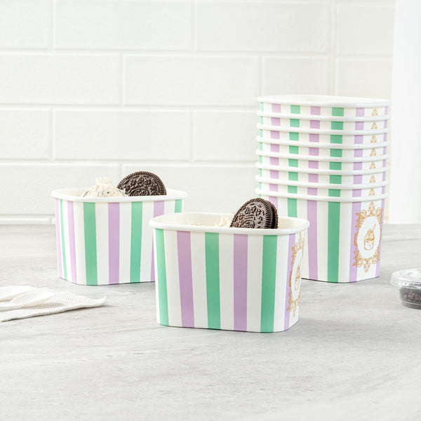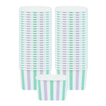 Elevate your food presentation with our Coppetta 12-ounce Square Purple And Blue Stripe Paper To Go Cups, a stylish solution for serving frozen treats. Designed with a grease-resistant PE lining, these takeaway dessert cups prevent oil from seeping through, ensuring a neat and appealing presentation. The durable paper construction of these square ice cream cups is perfect for both hot and cold foods, providing versatility for any menu item. Featuring recyclable convenience, these frozen yogurt paper cups offer an eco-friendly option for foodservice establishments aiming to reduce waste. With a securely rolled rim, these to go cups pair effortlessly with coordinating lids (SKU: RWA1736W) for easy transportation. The eye-catching purple and blue stripe pattern adds an upscale touch to these disposable cups, enhancing your culinary creations. These freezer-safe cups are ideal for storing leftovers, maintaining freshness and flavor. Measuring 4.21 inches in length by 3.23 inches in width by 2.68 inches in height, this 12-ounce capacity allows for generous servings of your favorite desserts. Sold in a 200 count box.