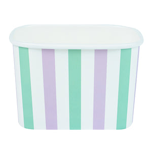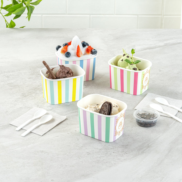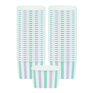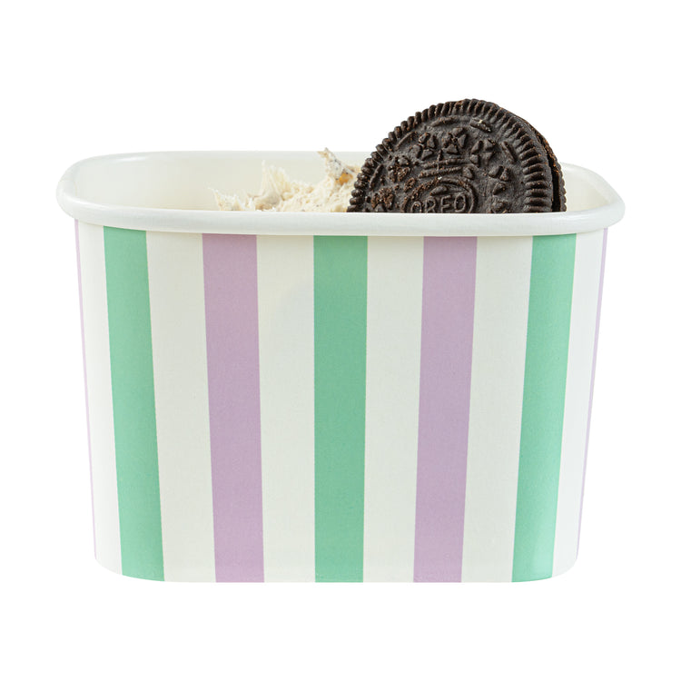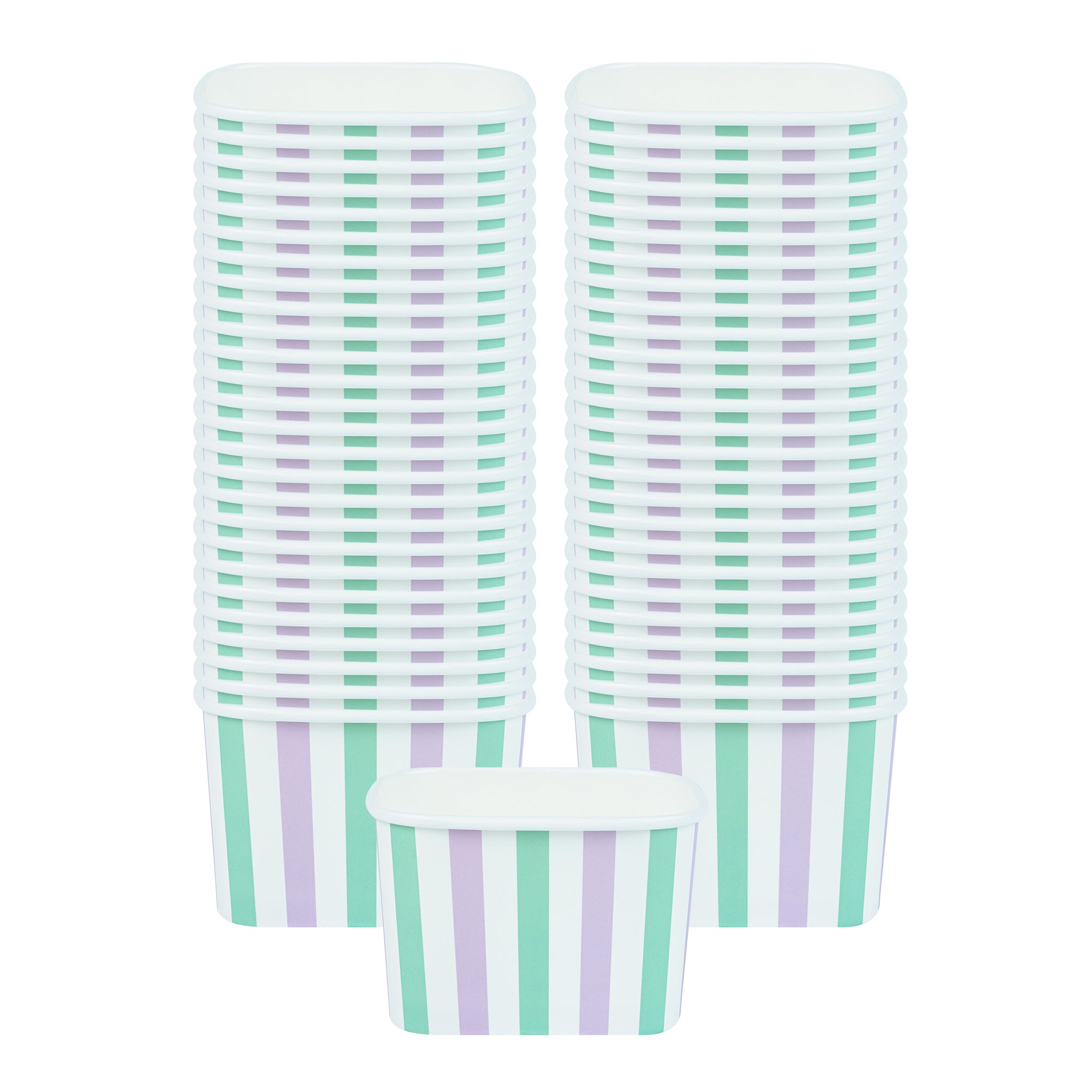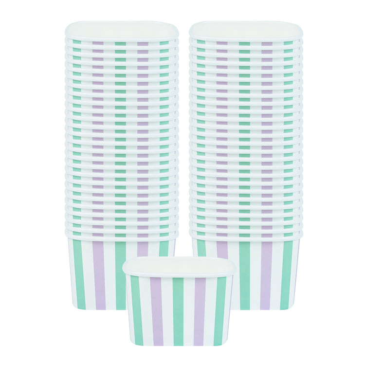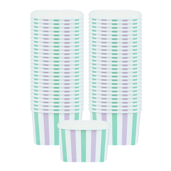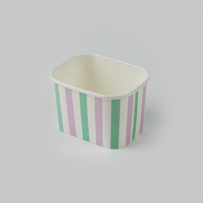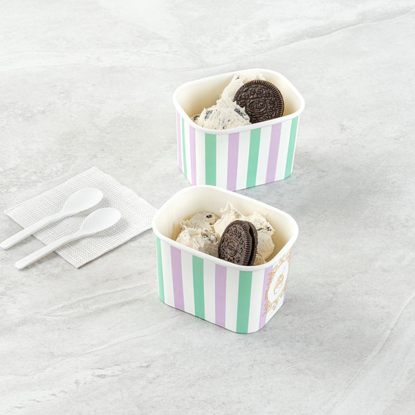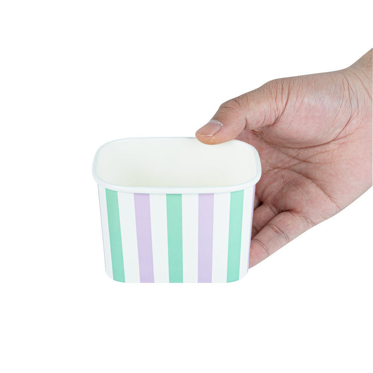 Elevate your food presentation with our Coppetta 12-ounce Square Purple And Blue Stripe Paper To Go Cups, a stylish solution for serving frozen treats. Designed with a grease-resistant PE lining, these takeaway dessert cups prevent oil from seeping through, ensuring a neat and appealing presentation. The durable paper construction of these square ice cream cups is perfect for both hot and cold foods, providing versatility for any menu item. Featuring recyclable convenience, these frozen yogurt paper cups offer an eco-friendly option for foodservice establishments aiming to reduce waste. With a securely rolled rim, these to go cups pair effortlessly with coordinating lids (SKU: RWA1736W-50) for easy transportation. The eye-catching purple and blue stripe pattern adds an upscale touch to these disposable cups, enhancing your culinary creations. These freezer-safe cups are ideal for storing leftovers, maintaining freshness and flavor. Measuring 4.21 inches in length by 3.23 inches in width by 2.68 inches in height, this 12-ounce capacity allows for generous servings of your favorite desserts. Sold in a 50 count box.