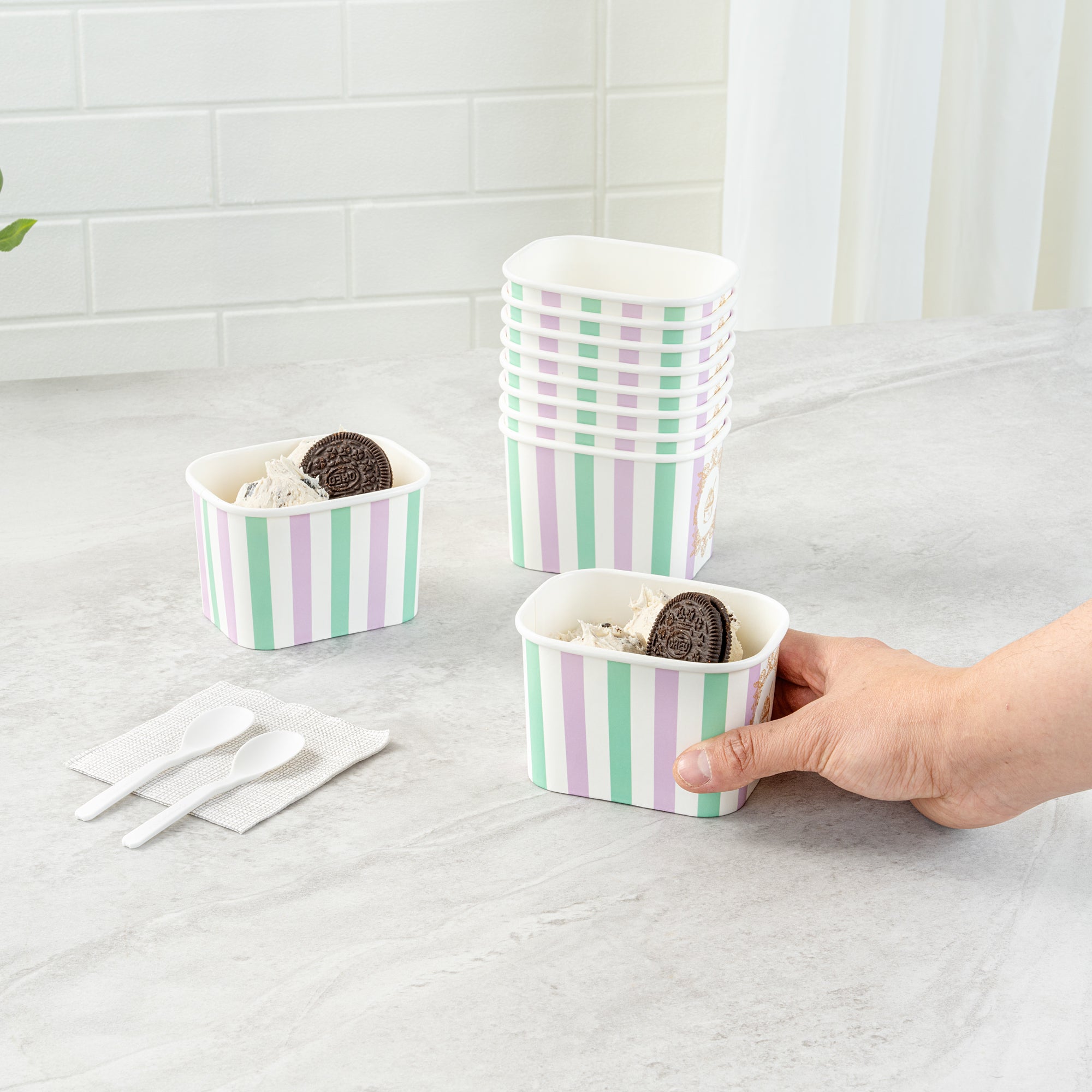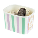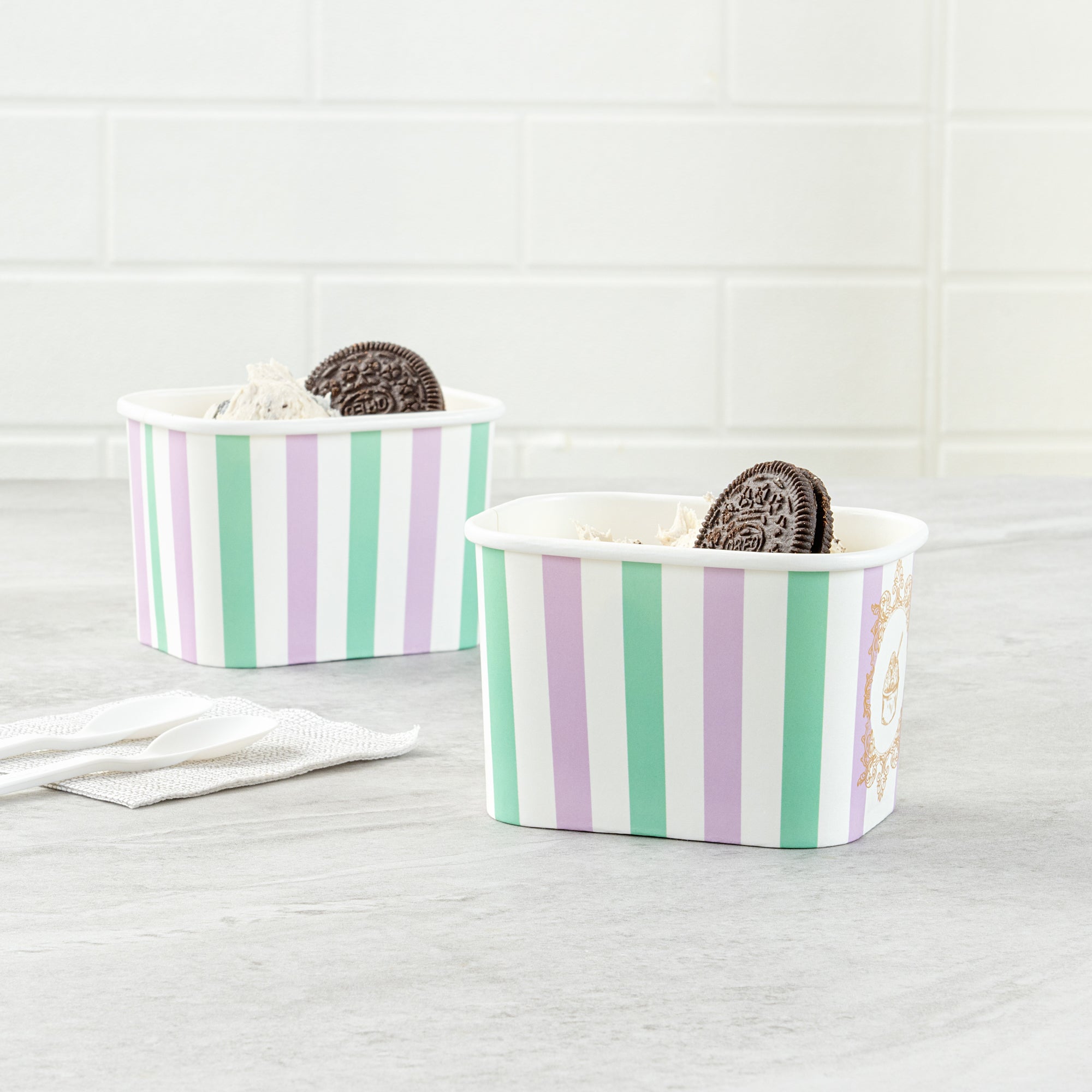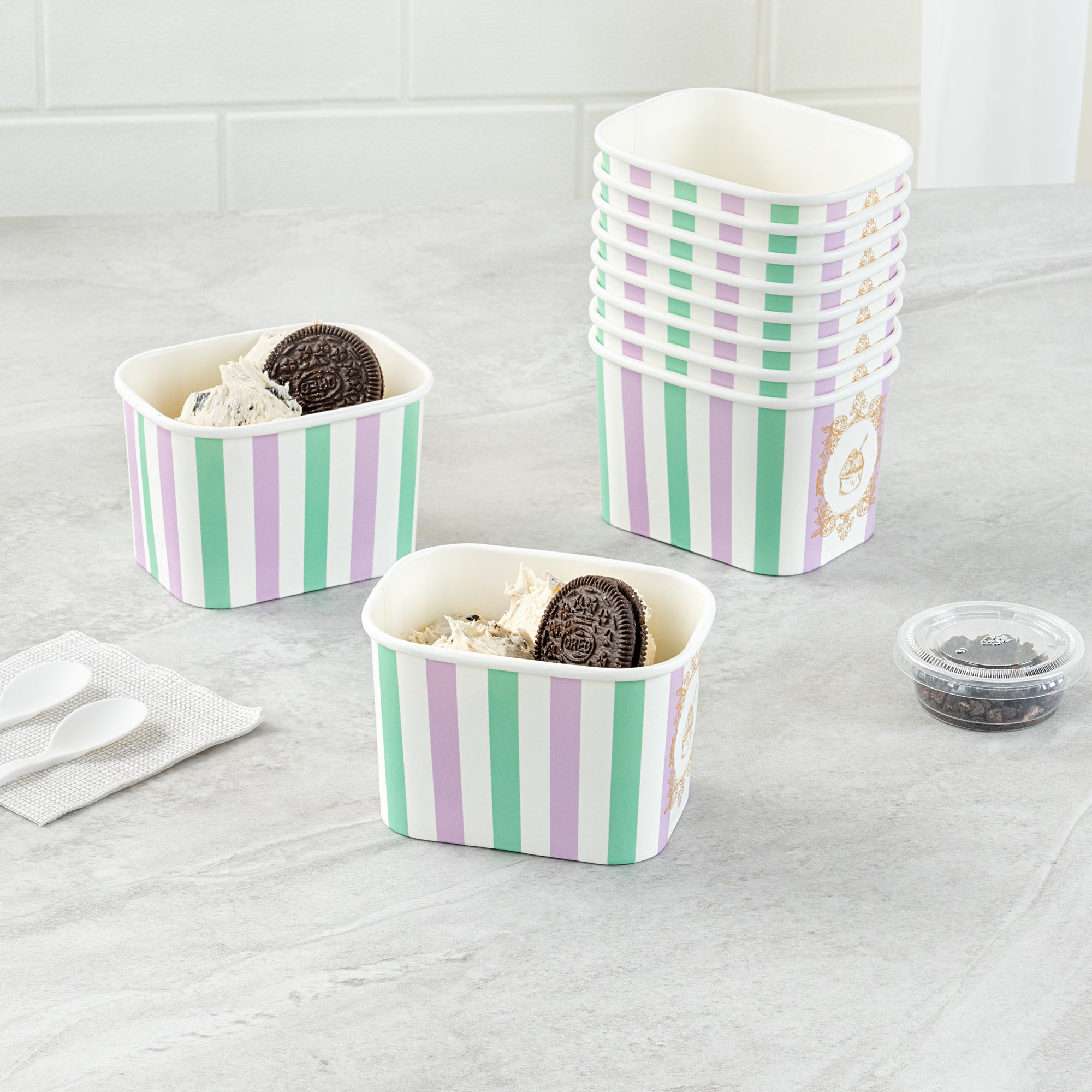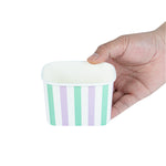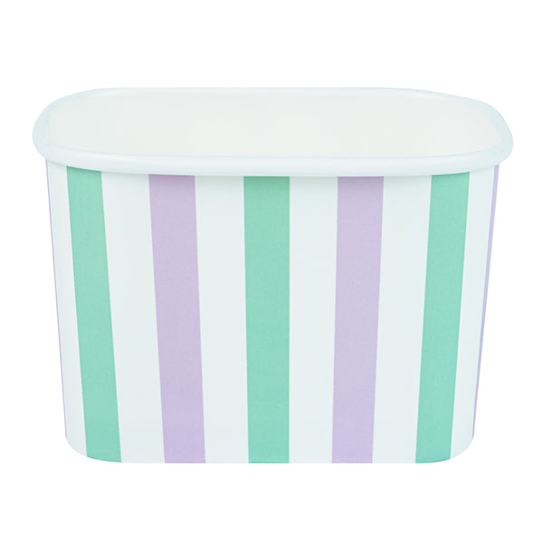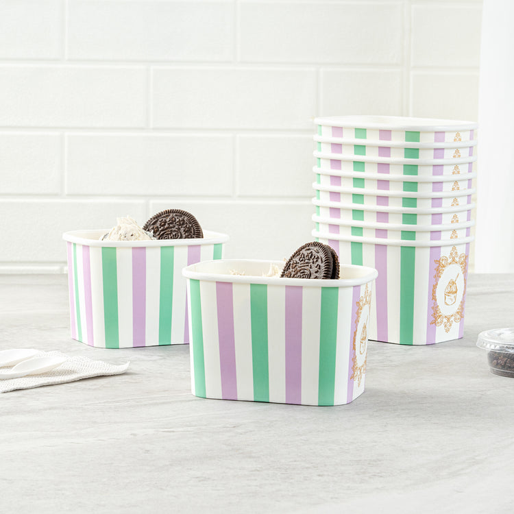 Elevate your food presentation with our Coppetta 12-ounce Square Purple And Blue Stripe Paper To Go Cups, a stylish solution for serving frozen treats. Designed with a grease-resistant PE lining, these takeaway dessert cups prevent oil from seeping through, ensuring a neat and appealing presentation. The durable paper construction of these square ice cream cups is perfect for both hot and cold foods, providing versatility for any menu item. Featuring recyclable convenience, these frozen yogurt paper cups offer an eco-friendly option for foodservice establishments aiming to reduce waste. With a securely rolled rim, these to go cups pair effortlessly with coordinating lids (SKU: RWA1736W-50) for easy transportation. The eye-catching purple and blue stripe pattern adds an upscale touch to these disposable cups, enhancing your culinary creations. These freezer-safe cups are ideal for storing leftovers, maintaining freshness and flavor. Measuring 4.21 inches in length by 3.23 inches in width by 2.68 inches in height, this 12-ounce capacity allows for generous servings of your favorite desserts. Sold in a 50 count box.